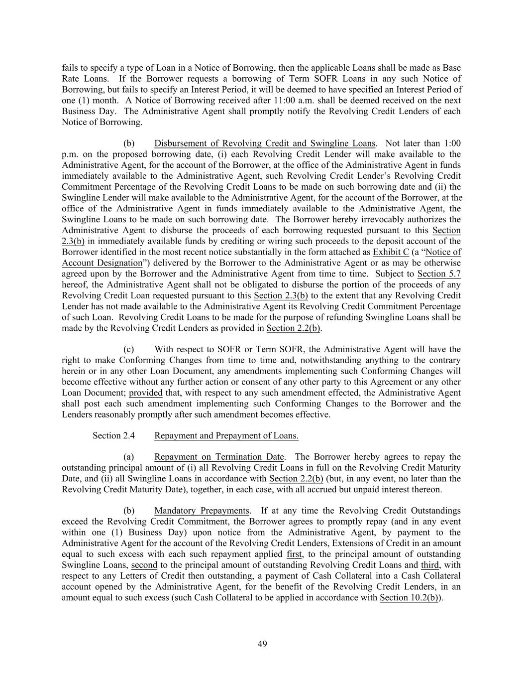 fails to specify a type of Loan in a Notice of Borrowing, then the applicable Loans shall be made as BaseRate Loans. If the Borrower requests a borrowing of Term SOFR Loans in any such Notice ofBorrowing, but fails to specify an Interest Period, it will be deemed to have specified an Interest Period ofone (1) month. A Notice of Borrowing received after 11:00 a.m. shall be deemed received on the nextBusiness Day. The Administrative Agent shall promptly notify the Revolving Credit Lenders of eachNotice of Borrowing.(b) Disbursement of Revolving Credit and Swingline Loans. Not later than 1:00p.m. on the proposed borrowing date, (i) each Revolving Credit Lender will make available to theAdministrative Agent, for the account of the Borrower, at the office of the Administrative Agent in fundsimmediately available to the Administrative Agent, such Revolving Credit Lender’s Revolving CreditCommitment Percentage of the Revolving Credit Loans to be made on such borrowing date and (ii) theSwingline Lender will make available to the Administrative Agent, for the account of the Borrower, at theoffice of the Administrative Agent in funds immediately available to the Administrative Agent, theSwingline Loans to be made on such borrowing date. The Borrower hereby irrevocably authorizes theAdministrative Agent to disburse the proceeds of each borrowing requested pursuant to this Section2.3(b) in immediately available funds by crediting or wiring such proceeds to the deposit account of theBorrower identified in the most recent notice substantially in the form attached as Exhibit C (a “Notice ofAccount Designation”) delivered by the Borrower to the Administrative Agent or as may be otherwiseagreed upon by the Borrower and the Administrative Agent from time to time. Subject to Section 5.7hereof, the Administrative Agent shall not be obligated to disburse the portion of the proceeds of anyRevolving Credit Loan requested pursuant to this Section 2.3(b) to the extent that any Revolving CreditLender has not made available to the Administrative Agent its Revolving Credit Commitment Percentageof such Loan. Revolving Credit Loans to be made for the purpose of refunding Swingline Loans shall bemade by the Revolving Credit Lenders as provided in Section 2.2(b).(c) With respect to SOFR or Term SOFR, the Administrative Agent will have theright to make Conforming Changes from time to time and, notwithstanding anything to the contraryherein or in any other Loan Document, any amendments implementing such Conforming Changes willbecome effective without any further action or consent of any other party to this Agreement or any otherLoan Document; provided that, with respect to any such amendment effected, the Administrative Agentshall post each such amendment implementing such Conforming Changes to the Borrower and theLenders reasonably promptly after such amendment becomes effective.Section 2.4 Repayment and Prepayment of Loans.(a) Repayment on Termination Date. The Borrower hereby agrees to repay theoutstanding principal amount of (i) all Revolving Credit Loans in full on the Revolving Credit MaturityDate, and (ii) all Swingline Loans in accordance with Section 2.2(b) (but, in any event, no later than theRevolving Credit Maturity Date), together, in each case, with all accrued but unpaid interest thereon.(b) Mandatory Prepayments. If at any time the Revolving Credit Outstandingsexceed the Revolving Credit Commitment, the Borrower agrees to promptly repay (and in any eventwithin one (1) Business Day) upon notice from the Administrative Agent, by payment to theAdministrative Agent for the account of the Revolving Credit Lenders, Extensions of Credit in an amountequal to such excess with each such repayment applied first, to the principal amount of outstandingSwingline Loans, second to the principal amount of outstanding Revolving Credit Loans and third, withrespect to any Letters of Credit then outstanding, a payment of Cash Collateral into a Cash Collateralaccount opened by the Administrative Agent, for the benefit of the Revolving Credit Lenders, in anamount equal to such excess (such Cash Collateral to be applied in accordance with Section 10.2(b)).49