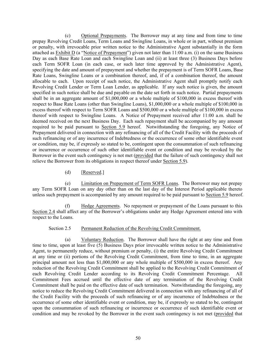 (c) Optional Prepayments. The Borrower may at any time and from time to timeprepay Revolving Credit Loans, Term Loans and Swingline Loans, in whole or in part, without premiumor penalty, with irrevocable prior written notice to the Administrative Agent substantially in the formattached as Exhibit D (a “Notice of Prepayment”) given not later than 11:00 a.m. (i) on the same BusinessDay as each Base Rate Loan and each Swingline Loan and (ii) at least three (3) Business Days beforeeach Term SOFR Loan (in each case, or such later time approved by the Administrative Agent),specifying the date and amount of prepayment and whether the prepayment is of Term SOFR Loans, BaseRate Loans, Swingline Loans or a combination thereof, and, if of a combination thereof, the amountallocable to each. Upon receipt of such notice, the Administrative Agent shall promptly notify eachRevolving Credit Lender or Term Loan Lender, as applicable. If any such notice is given, the amountspecified in such notice shall be due and payable on the date set forth in such notice. Partial prepaymentsshall be in an aggregate amount of $1,000,000 or a whole multiple of $100,000 in excess thereof withrespect to Base Rate Loans (other than Swingline Loans), $1,000,000 or a whole multiple of $100,000 inexcess thereof with respect to Term SOFR Loans and $500,000 or a whole multiple of $100,000 in excessthereof with respect to Swingline Loans. A Notice of Prepayment received after 11:00 a.m. shall bedeemed received on the next Business Day. Each such repayment shall be accompanied by any amountrequired to be paid pursuant to Section 5.9 hereof. Notwithstanding the foregoing, any Notice ofPrepayment delivered in connection with any refinancing of all of the Credit Facility with the proceeds ofsuch refinancing or of any incurrence of Indebtedness or the occurrence of some other identifiable eventor condition, may be, if expressly so stated to be, contingent upon the consummation of such refinancingor incurrence or occurrence of such other identifiable event or condition and may be revoked by theBorrower in the event such contingency is not met (provided that the failure of such contingency shall notrelieve the Borrower from its obligations in respect thereof under Section 5.9).(d) [Reserved.](e) Limitation on Prepayment of Term SOFR Loans. The Borrower may not prepayany Term SOFR Loan on any day other than on the last day of the Interest Period applicable theretounless such prepayment is accompanied by any amount required to be paid pursuant to Section 5.9 hereof.(f) Hedge Agreements. No repayment or prepayment of the Loans pursuant to thisSection 2.4 shall affect any of the Borrower’s obligations under any Hedge Agreement entered into withrespect to the Loans.Section 2.5 Permanent Reduction of the Revolving Credit Commitment.(a) Voluntary Reduction. The Borrower shall have the right at any time and fromtime to time, upon at least five (5) Business Days prior irrevocable written notice to the AdministrativeAgent, to permanently reduce, without premium or penalty, (i) the entire Revolving Credit Commitmentat any time or (ii) portions of the Revolving Credit Commitment, from time to time, in an aggregateprincipal amount not less than $1,000,000 or any whole multiple of $500,000 in excess thereof. Anyreduction of the Revolving Credit Commitment shall be applied to the Revolving Credit Commitment ofeach Revolving Credit Lender according to its Revolving Credit Commitment Percentage. AllCommitment Fees accrued until the effective date of any termination of the Revolving CreditCommitment shall be paid on the effective date of such termination. Notwithstanding the foregoing, anynotice to reduce the Revolving Credit Commitment delivered in connection with any refinancing of all ofthe Credit Facility with the proceeds of such refinancing or of any incurrence of Indebtedness or theoccurrence of some other identifiable event or condition, may be, if expressly so stated to be, contingentupon the consummation of such refinancing or incurrence or occurrence of such identifiable event orcondition and may be revoked by the Borrower in the event such contingency is not met (provided that50
