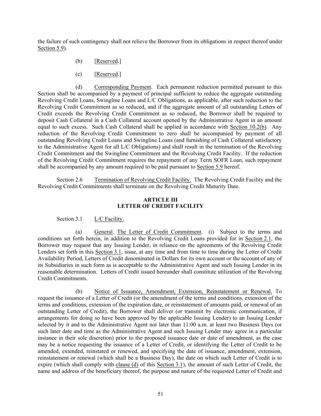 the failure of such contingency shall not relieve the Borrower from its obligations in respect thereof underSection 5.9). (b) [Reserved.](c) [Reserved.](d) Corresponding Payment. Each permanent reduction permitted pursuant to thisSection shall be accompanied by a payment of principal sufficient to reduce the aggregate outstandingRevolving Credit Loans, Swingline Loans and L/C Obligations, as applicable, after such reduction to theRevolving Credit Commitment as so reduced, and if the aggregate amount of all outstanding Letters ofCredit exceeds the Revolving Credit Commitment as so reduced, the Borrower shall be required todeposit Cash Collateral in a Cash Collateral account opened by the Administrative Agent in an amountequal to such excess. Such Cash Collateral shall be applied in accordance with Section 10.2(b). Anyreduction of the Revolving Credit Commitment to zero shall be accompanied by payment of alloutstanding Revolving Credit Loans and Swingline Loans (and furnishing of Cash Collateral satisfactoryto the Administrative Agent for all L/C Obligations) and shall result in the termination of the RevolvingCredit Commitment and the Swingline Commitment and the Revolving Credit Facility. If the reductionof the Revolving Credit Commitment requires the repayment of any Term SOFR Loan, such repaymentshall be accompanied by any amount required to be paid pursuant to Section 5.9 hereof.Section 2.6 Termination of Revolving Credit Facility. The Revolving Credit Facility and theRevolving Credit Commitments shall terminate on the Revolving Credit Maturity Date.ARTICLE IIILETTER OF CREDIT FACILITYSection 3.1 L/C Facility.(a) General. The Letter of Credit Commitment. (i) Subject to the terms andconditions set forth herein, in addition to the Revolving Credit Loans provided for in Section 2.1, theBorrower may request that any Issuing Lender, in reliance on the agreements of the Revolving CreditLenders set forth in this Section 3.1, issue, at any time and from time to time during the Letter of CreditAvailability Period, Letters of Credit denominated in Dollars for its own account or the account of any ofits Subsidiaries in such form as is acceptable to the Administrative Agent and such Issuing Lender in itsreasonable determination. Letters of Credit issued hereunder shall constitute utilization of the RevolvingCredit Commitments.(b) Notice of Issuance, Amendment, Extension, Reinstatement or Renewal. Torequest the issuance of a Letter of Credit (or the amendment of the terms and conditions, extension of theterms and conditions, extension of the expiration date, or reinstatement of amounts paid, or renewal of anoutstanding Letter of Credit), the Borrower shall deliver (or transmit by electronic communication, ifarrangements for doing so have been approved by the applicable Issuing Lender) to an Issuing Lenderselected by it and to the Administrative Agent not later than 11:00 a.m. at least two Business Days (orsuch later date and time as the Administrative Agent and such Issuing Lender may agree in a particularinstance in their sole discretion) prior to the proposed issuance date or date of amendment, as the casemay be a notice requesting the issuance of a Letter of Credit, or identifying the Letter of Credit to beamended, extended, reinstated or renewed, and specifying the date of issuance, amendment, extension,reinstatement or renewal (which shall be a Business Day), the date on which such Letter of Credit is toexpire (which shall comply with clause (d) of this Section 3.1), the amount of such Letter of Credit, thename and address of the beneficiary thereof, the purpose and nature of the requested Letter of Credit and51