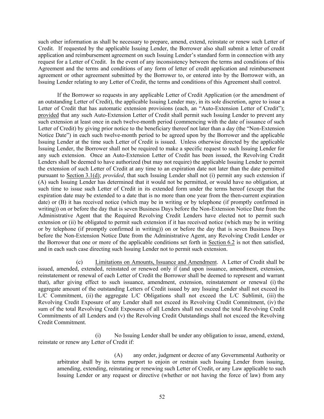 such other information as shall be necessary to prepare, amend, extend, reinstate or renew such Letter ofCredit. If requested by the applicable Issuing Lender, the Borrower also shall submit a letter of creditapplication and reimbursement agreement on such Issuing Lender’s standard form in connection with anyrequest for a Letter of Credit. In the event of any inconsistency between the terms and conditions of thisAgreement and the terms and conditions of any form of letter of credit application and reimbursementagreement or other agreement submitted by the Borrower to, or entered into by the Borrower with, anIssuing Lender relating to any Letter of Credit, the terms and conditions of this Agreement shall control.If the Borrower so requests in any applicable Letter of Credit Application (or the amendment ofan outstanding Letter of Credit), the applicable Issuing Lender may, in its sole discretion, agree to issue aLetter of Credit that has automatic extension provisions (each, an “Auto-Extension Letter of Credit”);provided that any such Auto-Extension Letter of Credit shall permit such Issuing Lender to prevent anysuch extension at least once in each twelve-month period (commencing with the date of issuance of suchLetter of Credit) by giving prior notice to the beneficiary thereof not later than a day (the “Non-ExtensionNotice Date”) in each such twelve-month period to be agreed upon by the Borrower and the applicableIssuing Lender at the time such Letter of Credit is issued. Unless otherwise directed by the applicableIssuing Lender, the Borrower shall not be required to make a specific request to such Issuing Lender forany such extension. Once an Auto-Extension Letter of Credit has been issued, the Revolving CreditLenders shall be deemed to have authorized (but may not require) the applicable Issuing Lender to permitthe extension of such Letter of Credit at any time to an expiration date not later than the date permittedpursuant to Section 3.1(d); provided, that such Issuing Lender shall not (i) permit any such extension if(A) such Issuing Lender has determined that it would not be permitted, or would have no obligation, atsuch time to issue such Letter of Credit in its extended form under the terms hereof (except that theexpiration date may be extended to a date that is no more than one year from the then-current expirationdate) or (B) it has received notice (which may be in writing or by telephone (if promptly confirmed inwriting)) on or before the day that is seven Business Days before the Non-Extension Notice Date from theAdministrative Agent that the Required Revolving Credit Lenders have elected not to permit suchextension or (ii) be obligated to permit such extension if it has received notice (which may be in writingor by telephone (if promptly confirmed in writing)) on or before the day that is seven Business Daysbefore the Non-Extension Notice Date from the Administrative Agent, any Revolving Credit Lender orthe Borrower that one or more of the applicable conditions set forth in Section 6.2 is not then satisfied,and in each such case directing such Issuing Lender not to permit such extension.(c) Limitations on Amounts, Issuance and Amendment. A Letter of Credit shall beissued, amended, extended, reinstated or renewed only if (and upon issuance, amendment, extension,reinstatement or renewal of each Letter of Credit the Borrower shall be deemed to represent and warrantthat), after giving effect to such issuance, amendment, extension, reinstatement or renewal (i) theaggregate amount of the outstanding Letters of Credit issued by any Issuing Lender shall not exceed itsL/C Commitment, (ii) the aggregate L/C Obligations shall not exceed the L/C Sublimit, (iii) theRevolving Credit Exposure of any Lender shall not exceed its Revolving Credit Commitment, (iv) thesum of the total Revolving Credit Exposures of all Lenders shall not exceed the total Revolving CreditCommitments of all Lenders and (v) the Revolving Credit Outstandings shall not exceed the RevolvingCredit Commitment. (i) No Issuing Lender shall be under any obligation to issue, amend, extend,reinstate or renew any Letter of Credit if:(A) any order, judgment or decree of any Governmental Authority orarbitrator shall by its terms purport to enjoin or restrain such Issuing Lender from issuing,amending, extending, reinstating or renewing such Letter of Credit, or any Law applicable to suchIssuing Lender or any request or directive (whether or not having the force of law) from any52