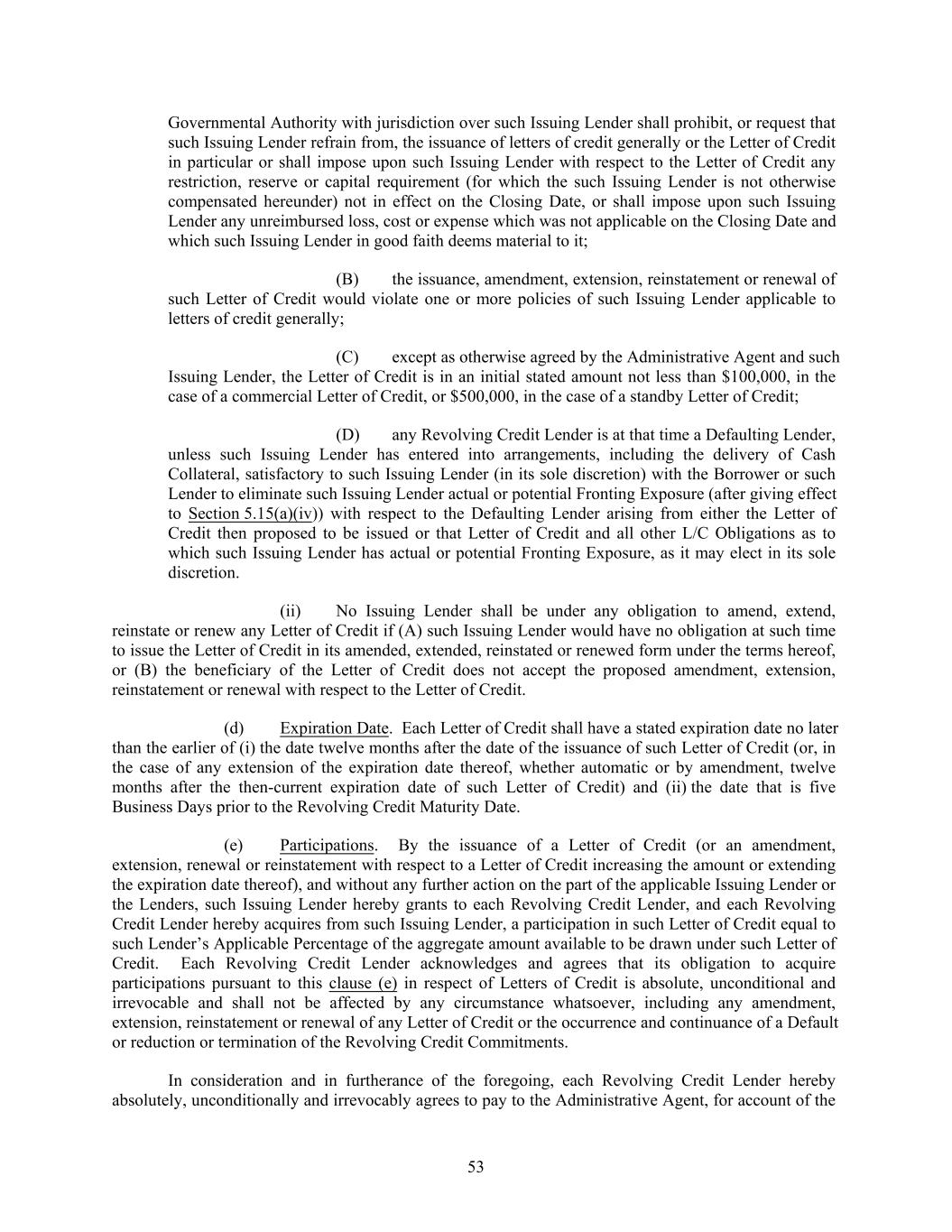 Governmental Authority with jurisdiction over such Issuing Lender shall prohibit, or request thatsuch Issuing Lender refrain from, the issuance of letters of credit generally or the Letter of Creditin particular or shall impose upon such Issuing Lender with respect to the Letter of Credit anyrestriction, reserve or capital requirement (for which the such Issuing Lender is not otherwisecompensated hereunder) not in effect on the Closing Date, or shall impose upon such IssuingLender any unreimbursed loss, cost or expense which was not applicable on the Closing Date andwhich such Issuing Lender in good faith deems material to it;(B) the issuance, amendment, extension, reinstatement or renewal ofsuch Letter of Credit would violate one or more policies of such Issuing Lender applicable toletters of credit generally;(C) except as otherwise agreed by the Administrative Agent and suchIssuing Lender, the Letter of Credit is in an initial stated amount not less than $100,000, in thecase of a commercial Letter of Credit, or $500,000, in the case of a standby Letter of Credit;(D) any Revolving Credit Lender is at that time a Defaulting Lender,unless such Issuing Lender has entered into arrangements, including the delivery of CashCollateral, satisfactory to such Issuing Lender (in its sole discretion) with the Borrower or suchLender to eliminate such Issuing Lender actual or potential Fronting Exposure (after giving effectto Section 5.15(a)(iv)) with respect to the Defaulting Lender arising from either the Letter ofCredit then proposed to be issued or that Letter of Credit and all other L/C Obligations as towhich such Issuing Lender has actual or potential Fronting Exposure, as it may elect in its solediscretion. (ii) No Issuing Lender shall be under any obligation to amend, extend,reinstate or renew any Letter of Credit if (A) such Issuing Lender would have no obligation at such timeto issue the Letter of Credit in its amended, extended, reinstated or renewed form under the terms hereof,or (B) the beneficiary of the Letter of Credit does not accept the proposed amendment, extension,reinstatement or renewal with respect to the Letter of Credit.(d) Expiration Date. Each Letter of Credit shall have a stated expiration date no laterthan the earlier of (i) the date twelve months after the date of the issuance of such Letter of Credit (or, inthe case of any extension of the expiration date thereof, whether automatic or by amendment, twelvemonths after the then-current expiration date of such Letter of Credit) and (ii) the date that is fiveBusiness Days prior to the Revolving Credit Maturity Date.(e) Participations. By the issuance of a Letter of Credit (or an amendment,extension, renewal or reinstatement with respect to a Letter of Credit increasing the amount or extendingthe expiration date thereof), and without any further action on the part of the applicable Issuing Lender orthe Lenders, such Issuing Lender hereby grants to each Revolving Credit Lender, and each RevolvingCredit Lender hereby acquires from such Issuing Lender, a participation in such Letter of Credit equal tosuch Lender’s Applicable Percentage of the aggregate amount available to be drawn under such Letter ofCredit. Each Revolving Credit Lender acknowledges and agrees that its obligation to acquireparticipations pursuant to this clause (e) in respect of Letters of Credit is absolute, unconditional andirrevocable and shall not be affected by any circumstance whatsoever, including any amendment,extension, reinstatement or renewal of any Letter of Credit or the occurrence and continuance of a Defaultor reduction or termination of the Revolving Credit Commitments.In consideration and in furtherance of the foregoing, each Revolving Credit Lender herebyabsolutely, unconditionally and irrevocably agrees to pay to the Administrative Agent, for account of the53