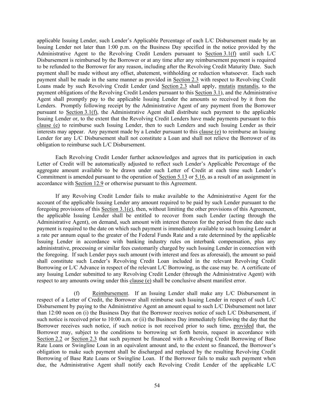 applicable Issuing Lender, such Lender’s Applicable Percentage of each L/C Disbursement made by anIssuing Lender not later than 1:00 p.m. on the Business Day specified in the notice provided by theAdministrative Agent to the Revolving Credit Lenders pursuant to Section 3.1(f) until such L/CDisbursement is reimbursed by the Borrower or at any time after any reimbursement payment is requiredto be refunded to the Borrower for any reason, including after the Revolving Credit Maturity Date. Suchpayment shall be made without any offset, abatement, withholding or reduction whatsoever. Each suchpayment shall be made in the same manner as provided in Section 2.3 with respect to Revolving CreditLoans made by such Revolving Credit Lender (and Section 2.3 shall apply, mutatis mutandis, to thepayment obligations of the Revolving Credit Lenders pursuant to this Section 3.1), and the AdministrativeAgent shall promptly pay to the applicable Issuing Lender the amounts so received by it from theLenders. Promptly following receipt by the Administrative Agent of any payment from the Borrowerpursuant to Section 3.1(f), the Administrative Agent shall distribute such payment to the applicableIssuing Lender or, to the extent that the Revolving Credit Lenders have made payments pursuant to thisclause (e) to reimburse such Issuing Lender, then to such Lenders and such Issuing Lender as theirinterests may appear. Any payment made by a Lender pursuant to this clause (e) to reimburse an IssuingLender for any L/C Disbursement shall not constitute a Loan and shall not relieve the Borrower of itsobligation to reimburse such L/C Disbursement.Each Revolving Credit Lender further acknowledges and agrees that its participation in eachLetter of Credit will be automatically adjusted to reflect such Lender’s Applicable Percentage of theaggregate amount available to be drawn under such Letter of Credit at each time such Lender’sCommitment is amended pursuant to the operation of Section 5.13 or 5.16, as a result of an assignment inaccordance with Section 12.9 or otherwise pursuant to this Agreement.If any Revolving Credit Lender fails to make available to the Administrative Agent for theaccount of the applicable Issuing Lender any amount required to be paid by such Lender pursuant to theforegoing provisions of this Section 3.1(e), then, without limiting the other provisions of this Agreement,the applicable Issuing Lender shall be entitled to recover from such Lender (acting through theAdministrative Agent), on demand, such amount with interest thereon for the period from the date suchpayment is required to the date on which such payment is immediately available to such Issuing Lender ata rate per annum equal to the greater of the Federal Funds Rate and a rate determined by the applicableIssuing Lender in accordance with banking industry rules on interbank compensation, plus anyadministrative, processing or similar fees customarily charged by such Issuing Lender in connection withthe foregoing. If such Lender pays such amount (with interest and fees as aforesaid), the amount so paidshall constitute such Lender’s Revolving Credit Loan included in the relevant Revolving CreditBorrowing or L/C Advance in respect of the relevant L/C Borrowing, as the case may be. A certificate ofany Issuing Lender submitted to any Revolving Credit Lender (through the Administrative Agent) withrespect to any amounts owing under this clause (e) shall be conclusive absent manifest error.(f) Reimbursement. If an Issuing Lender shall make any L/C Disbursement inrespect of a Letter of Credit, the Borrower shall reimburse such Issuing Lender in respect of such L/CDisbursement by paying to the Administrative Agent an amount equal to such L/C Disbursement not laterthan 12:00 noon on (i) the Business Day that the Borrower receives notice of such L/C Disbursement, ifsuch notice is received prior to 10:00 a.m. or (ii) the Business Day immediately following the day that theBorrower receives such notice, if such notice is not received prior to such time, provided that, theBorrower may, subject to the conditions to borrowing set forth herein, request in accordance withSection 2.2 or Section 2.3 that such payment be financed with a Revolving Credit Borrowing of BaseRate Loans or Swingline Loan in an equivalent amount and, to the extent so financed, the Borrower’sobligation to make such payment shall be discharged and replaced by the resulting Revolving CreditBorrowing of Base Rate Loans or Swingline Loan. If the Borrower fails to make such payment whendue, the Administrative Agent shall notify each Revolving Credit Lender of the applicable L/C54