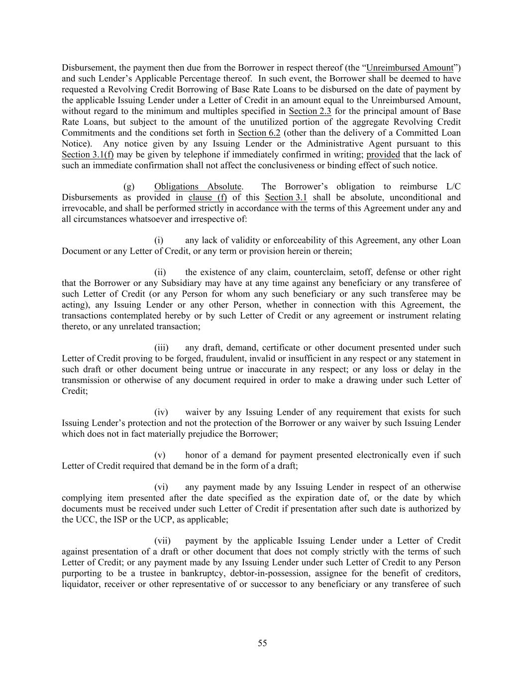 Disbursement, the payment then due from the Borrower in respect thereof (the “Unreimbursed Amount”)and such Lender’s Applicable Percentage thereof. In such event, the Borrower shall be deemed to haverequested a Revolving Credit Borrowing of Base Rate Loans to be disbursed on the date of payment bythe applicable Issuing Lender under a Letter of Credit in an amount equal to the Unreimbursed Amount,without regard to the minimum and multiples specified in Section 2.3 for the principal amount of BaseRate Loans, but subject to the amount of the unutilized portion of the aggregate Revolving CreditCommitments and the conditions set forth in Section 6.2 (other than the delivery of a Committed LoanNotice). Any notice given by any Issuing Lender or the Administrative Agent pursuant to thisSection 3.1(f) may be given by telephone if immediately confirmed in writing; provided that the lack ofsuch an immediate confirmation shall not affect the conclusiveness or binding effect of such notice.(g) Obligations Absolute. The Borrower’s obligation to reimburse L/CDisbursements as provided in clause (f) of this Section 3.1 shall be absolute, unconditional andirrevocable, and shall be performed strictly in accordance with the terms of this Agreement under any andall circumstances whatsoever and irrespective of:(i) any lack of validity or enforceability of this Agreement, any other LoanDocument or any Letter of Credit, or any term or provision herein or therein;(ii) the existence of any claim, counterclaim, setoff, defense or other rightthat the Borrower or any Subsidiary may have at any time against any beneficiary or any transferee ofsuch Letter of Credit (or any Person for whom any such beneficiary or any such transferee may beacting), any Issuing Lender or any other Person, whether in connection with this Agreement, thetransactions contemplated hereby or by such Letter of Credit or any agreement or instrument relatingthereto, or any unrelated transaction;(iii) any draft, demand, certificate or other document presented under suchLetter of Credit proving to be forged, fraudulent, invalid or insufficient in any respect or any statement insuch draft or other document being untrue or inaccurate in any respect; or any loss or delay in thetransmission or otherwise of any document required in order to make a drawing under such Letter ofCredit; (iv) waiver by any Issuing Lender of any requirement that exists for suchIssuing Lender’s protection and not the protection of the Borrower or any waiver by such Issuing Lenderwhich does not in fact materially prejudice the Borrower;(v) honor of a demand for payment presented electronically even if suchLetter of Credit required that demand be in the form of a draft;(vi) any payment made by any Issuing Lender in respect of an otherwisecomplying item presented after the date specified as the expiration date of, or the date by whichdocuments must be received under such Letter of Credit if presentation after such date is authorized bythe UCC, the ISP or the UCP, as applicable;(vii) payment by the applicable Issuing Lender under a Letter of Creditagainst presentation of a draft or other document that does not comply strictly with the terms of suchLetter of Credit; or any payment made by any Issuing Lender under such Letter of Credit to any Personpurporting to be a trustee in bankruptcy, debtor-in-possession, assignee for the benefit of creditors,liquidator, receiver or other representative of or successor to any beneficiary or any transferee of such55