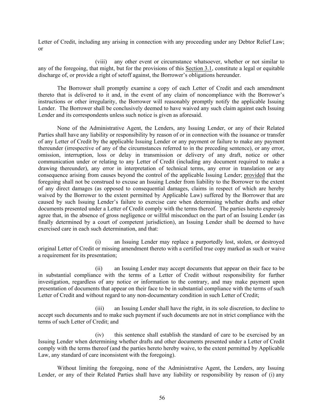 Letter of Credit, including any arising in connection with any proceeding under any Debtor Relief Law;or (viii) any other event or circumstance whatsoever, whether or not similar toany of the foregoing, that might, but for the provisions of this Section 3.1, constitute a legal or equitabledischarge of, or provide a right of setoff against, the Borrower’s obligations hereunder.The Borrower shall promptly examine a copy of each Letter of Credit and each amendmentthereto that is delivered to it and, in the event of any claim of noncompliance with the Borrower’sinstructions or other irregularity, the Borrower will reasonably promptly notify the applicable IssuingLender. The Borrower shall be conclusively deemed to have waived any such claim against each IssuingLender and its correspondents unless such notice is given as aforesaid.None of the Administrative Agent, the Lenders, any Issuing Lender, or any of their RelatedParties shall have any liability or responsibility by reason of or in connection with the issuance or transferof any Letter of Credit by the applicable Issuing Lender or any payment or failure to make any paymentthereunder (irrespective of any of the circumstances referred to in the preceding sentence), or any error,omission, interruption, loss or delay in transmission or delivery of any draft, notice or othercommunication under or relating to any Letter of Credit (including any document required to make adrawing thereunder), any error in interpretation of technical terms, any error in translation or anyconsequence arising from causes beyond the control of the applicable Issuing Lender; provided that theforegoing shall not be construed to excuse an Issuing Lender from liability to the Borrower to the extentof any direct damages (as opposed to consequential damages, claims in respect of which are herebywaived by the Borrower to the extent permitted by Applicable Law) suffered by the Borrower that arecaused by such Issuing Lender’s failure to exercise care when determining whether drafts and otherdocuments presented under a Letter of Credit comply with the terms thereof. The parties hereto expresslyagree that, in the absence of gross negligence or willful misconduct on the part of an Issuing Lender (asfinally determined by a court of competent jurisdiction), an Issuing Lender shall be deemed to haveexercised care in each such determination, and that:(i) an Issuing Lender may replace a purportedly lost, stolen, or destroyedoriginal Letter of Credit or missing amendment thereto with a certified true copy marked as such or waivea requirement for its presentation;(ii) an Issuing Lender may accept documents that appear on their face to bein substantial compliance with the terms of a Letter of Credit without responsibility for furtherinvestigation, regardless of any notice or information to the contrary, and may make payment uponpresentation of documents that appear on their face to be in substantial compliance with the terms of suchLetter of Credit and without regard to any non-documentary condition in such Letter of Credit;(iii) an Issuing Lender shall have the right, in its sole discretion, to decline toaccept such documents and to make such payment if such documents are not in strict compliance with theterms of such Letter of Credit; and(iv) this sentence shall establish the standard of care to be exercised by anIssuing Lender when determining whether drafts and other documents presented under a Letter of Creditcomply with the terms thereof (and the parties hereto hereby waive, to the extent permitted by ApplicableLaw, any standard of care inconsistent with the foregoing).Without limiting the foregoing, none of the Administrative Agent, the Lenders, any IssuingLender, or any of their Related Parties shall have any liability or responsibility by reason of (i) any56