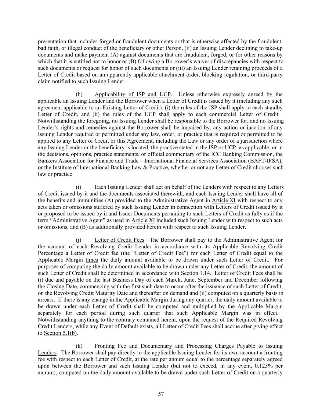 presentation that includes forged or fraudulent documents or that is otherwise affected by the fraudulent,bad faith, or illegal conduct of the beneficiary or other Person, (ii) an Issuing Lender declining to take-updocuments and make payment (A) against documents that are fraudulent, forged, or for other reasons bywhich that it is entitled not to honor or (B) following a Borrower’s waiver of discrepancies with respect tosuch documents or request for honor of such documents or (iii) an Issuing Lender retaining proceeds of aLetter of Credit based on an apparently applicable attachment order, blocking regulation, or third-partyclaim notified to such Issuing Lender.(h) Applicability of ISP and UCP. Unless otherwise expressly agreed by theapplicable an Issuing Lender and the Borrower when a Letter of Credit is issued by it (including any suchagreement applicable to an Existing Letter of Credit), (i) the rules of the ISP shall apply to each standbyLetter of Credit, and (ii) the rules of the UCP shall apply to each commercial Letter of Credit.Notwithstanding the foregoing, no Issuing Lender shall be responsible to the Borrower for, and no IssuingLender’s rights and remedies against the Borrower shall be impaired by, any action or inaction of anyIssuing Lender required or permitted under any law, order, or practice that is required or permitted to beapplied to any Letter of Credit or this Agreement, including the Law or any order of a jurisdiction whereany Issuing Lender or the beneficiary is located, the practice stated in the ISP or UCP, as applicable, or inthe decisions, opinions, practice statements, or official commentary of the ICC Banking Commission, theBankers Association for Finance and Trade – International Financial Services Association (BAFT-IFSA),or the Institute of International Banking Law & Practice, whether or not any Letter of Credit chooses suchlaw or practice. (i) Each Issuing Lender shall act on behalf of the Lenders with respect to any Lettersof Credit issued by it and the documents associated therewith, and each Issuing Lender shall have all ofthe benefits and immunities (A) provided to the Administrative Agent in Article XI with respect to anyacts taken or omissions suffered by such Issuing Lender in connection with Letters of Credit issued by itor proposed to be issued by it and Issuer Documents pertaining to such Letters of Credit as fully as if theterm “Administrative Agent” as used in Article XI included such Issuing Lender with respect to such actsor omissions, and (B) as additionally provided herein with respect to such Issuing Lender.(j) Letter of Credit Fees. The Borrower shall pay to the Administrative Agent forthe account of each Revolving Credit Lender in accordance with its Applicable Revolving CreditPercentage a Letter of Credit fee (the “Letter of Credit Fee”) for each Letter of Credit equal to theApplicable Margin times the daily amount available to be drawn under such Letter of Credit. Forpurposes of computing the daily amount available to be drawn under any Letter of Credit, the amount ofsuch Letter of Credit shall be determined in accordance with Section 1.14. Letter of Credit Fees shall be(i) due and payable on the last Business Day of each March, June, September and December followingthe Closing Date, commencing with the first such date to occur after the issuance of such Letter of Credit,on the Revolving Credit Maturity Date and thereafter on demand and (ii) computed on a quarterly basis inarrears. If there is any change in the Applicable Margin during any quarter, the daily amount available tobe drawn under each Letter of Credit shall be computed and multiplied by the Applicable Marginseparately for each period during such quarter that such Applicable Margin was in effect.Notwithstanding anything to the contrary contained herein, upon the request of the Required RevolvingCredit Lenders, while any Event of Default exists, all Letter of Credit Fees shall accrue after giving effectto Section 5.1(b).(k) Fronting Fee and Documentary and Processing Charges Payable to IssuingLenders. The Borrower shall pay directly to the applicable Issuing Lender for its own account a frontingfee with respect to each Letter of Credit, at the rate per annum equal to the percentage separately agreedupon between the Borrower and such Issuing Lender (but not to exceed, in any event, 0.125% perannum), computed on the daily amount available to be drawn under such Letter of Credit on a quarterly57