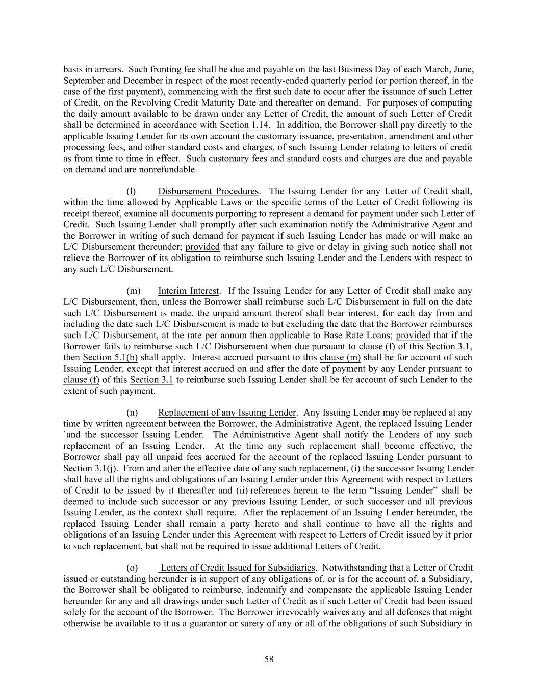 basis in arrears. Such fronting fee shall be due and payable on the last Business Day of each March, June,September and December in respect of the most recently-ended quarterly period (or portion thereof, in thecase of the first payment), commencing with the first such date to occur after the issuance of such Letterof Credit, on the Revolving Credit Maturity Date and thereafter on demand. For purposes of computingthe daily amount available to be drawn under any Letter of Credit, the amount of such Letter of Creditshall be determined in accordance with Section 1.14. In addition, the Borrower shall pay directly to theapplicable Issuing Lender for its own account the customary issuance, presentation, amendment and otherprocessing fees, and other standard costs and charges, of such Issuing Lender relating to letters of creditas from time to time in effect. Such customary fees and standard costs and charges are due and payableon demand and are nonrefundable.(l) Disbursement Procedures. The Issuing Lender for any Letter of Credit shall,within the time allowed by Applicable Laws or the specific terms of the Letter of Credit following itsreceipt thereof, examine all documents purporting to represent a demand for payment under such Letter ofCredit. Such Issuing Lender shall promptly after such examination notify the Administrative Agent andthe Borrower in writing of such demand for payment if such Issuing Lender has made or will make anL/C Disbursement thereunder; provided that any failure to give or delay in giving such notice shall notrelieve the Borrower of its obligation to reimburse such Issuing Lender and the Lenders with respect toany such L/C Disbursement.(m) Interim Interest. If the Issuing Lender for any Letter of Credit shall make anyL/C Disbursement, then, unless the Borrower shall reimburse such L/C Disbursement in full on the datesuch L/C Disbursement is made, the unpaid amount thereof shall bear interest, for each day from andincluding the date such L/C Disbursement is made to but excluding the date that the Borrower reimbursessuch L/C Disbursement, at the rate per annum then applicable to Base Rate Loans; provided that if theBorrower fails to reimburse such L/C Disbursement when due pursuant to clause (f) of this Section 3.1,then Section 5.1(b) shall apply. Interest accrued pursuant to this clause (m) shall be for account of suchIssuing Lender, except that interest accrued on and after the date of payment by any Lender pursuant toclause (f) of this Section 3.1 to reimburse such Issuing Lender shall be for account of such Lender to theextent of such payment.(n) Replacement of any Issuing Lender. Any Issuing Lender may be replaced at anytime by written agreement between the Borrower, the Administrative Agent, the replaced Issuing Lender`and the successor Issuing Lender. The Administrative Agent shall notify the Lenders of any suchreplacement of an Issuing Lender. At the time any such replacement shall become effective, theBorrower shall pay all unpaid fees accrued for the account of the replaced Issuing Lender pursuant toSection 3.1(j). From and after the effective date of any such replacement, (i) the successor Issuing Lendershall have all the rights and obligations of an Issuing Lender under this Agreement with respect to Lettersof Credit to be issued by it thereafter and (ii) references herein to the term “Issuing Lender” shall bedeemed to include such successor or any previous Issuing Lender, or such successor and all previousIssuing Lender, as the context shall require. After the replacement of an Issuing Lender hereunder, thereplaced Issuing Lender shall remain a party hereto and shall continue to have all the rights andobligations of an Issuing Lender under this Agreement with respect to Letters of Credit issued by it priorto such replacement, but shall not be required to issue additional Letters of Credit.(o) Letters of Credit Issued for Subsidiaries. Notwithstanding that a Letter of Creditissued or outstanding hereunder is in support of any obligations of, or is for the account of, a Subsidiary,the Borrower shall be obligated to reimburse, indemnify and compensate the applicable Issuing Lenderhereunder for any and all drawings under such Letter of Credit as if such Letter of Credit had been issuedsolely for the account of the Borrower. The Borrower irrevocably waives any and all defenses that mightotherwise be available to it as a guarantor or surety of any or all of the obligations of such Subsidiary in58