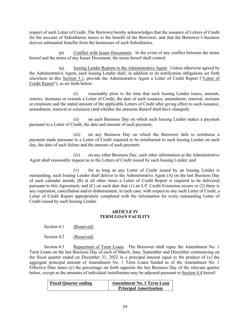 respect of such Letter of Credit. The Borrower hereby acknowledges that the issuance of Letters of Creditfor the account of Subsidiaries inures to the benefit of the Borrower, and that the Borrower’s businessderives substantial benefits from the businesses of such Subsidiaries.(p) Conflict with Issuer Documents. In the event of any conflict between the termshereof and the terms of any Issuer Document, the terms hereof shall control.(q) Issuing Lender Reports to the Administrative Agent. Unless otherwise agreed bythe Administrative Agent, each Issuing Lender shall, in addition to its notification obligations set forthelsewhere in this Section 3.1, provide the Administrative Agent a Letter of Credit Report (“Letter ofCredit Report”), as set forth below:(i) reasonably prior to the time that such Issuing Lender issues, amends,renews, increases or extends a Letter of Credit, the date of such issuance, amendment, renewal, increaseor extension and the stated amount of the applicable Letters of Credit after giving effect to such issuance,amendment, renewal or extension (and whether the amounts thereof shall have changed);(ii) on each Business Day on which such Issuing Lender makes a paymentpursuant to a Letter of Credit, the date and amount of such payment;(iii) on any Business Day on which the Borrower fails to reimburse apayment made pursuant to a Letter of Credit required to be reimbursed to such Issuing Lender on suchday, the date of such failure and the amount of such payment;(iv) on any other Business Day, such other information as the AdministrativeAgent shall reasonably request as to the Letters of Credit issued by such Issuing Lender; and(v) for so long as any Letter of Credit issued by an Issuing Lender isoutstanding, such Issuing Lender shall deliver to the Administrative Agent (A) on the last Business Dayof each calendar month, (B) at all other times a Letter of Credit Report is required to be deliveredpursuant to this Agreement, and (C) on each date that (1) an L/C Credit Extension occurs or (2) there isany expiration, cancellation and/or disbursement, in each case, with respect to any such Letter of Credit, aLetter of Credit Report appropriately completed with the information for every outstanding Letter ofCredit issued by such Issuing Lender. ARTICLE IVTERM LOAN FACILITYSection 4.1 [Reserved].Section 4.2 [Reserved].Section 4.3 Repayment of Term Loans. The Borrower shall repay the Amendment No. 1Term Loans on the last Business Day of each of March, June, September and December commencing onthe fiscal quarter ended on December 31, 2022 in a principal amount equal to the product of (x) theaggregate principal amount of Amendment No. 1 Term Loans funded as of the Amendment No. 1Effective Date times (y) the percentage set forth opposite the last Business Day of the relevant quarterbelow, except as the amounts of individual installments may be adjusted pursuant to Section 4.4 hereof:Fiscal Quarter ending Amendment No. 1 Term LoanPrincipal Amortization59