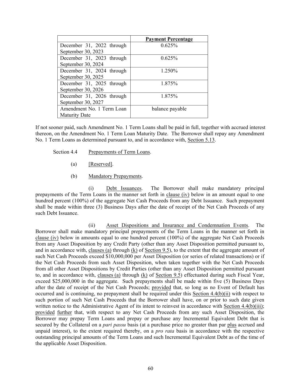 Payment PercentageDecember 31, 2022 throughSeptember 30, 2023 0.625%December 31, 2023 throughSeptember 30, 2024 0.625%December 31, 2024 throughSeptember 30, 2025 1.250%December 31, 2025 throughSeptember 30, 2026 1.875%December 31, 2026 throughSeptember 30, 2027 1.875%Amendment No. 1 Term LoanMaturity Date balance payableIf not sooner paid, such Amendment No. 1 Term Loans shall be paid in full, together with accrued interestthereon, on the Amendment No. 1 Term Loan Maturity Date. The Borrower shall repay any AmendmentNo. 1 Term Loans as determined pursuant to, and in accordance with, Section 5.13.Section 4.4 Prepayments of Term Loans.(a) [Reserved].(b) Mandatory Prepayments.(i) Debt Issuances. The Borrower shall make mandatory principalprepayments of the Term Loans in the manner set forth in clause (iv) below in an amount equal to onehundred percent (100%) of the aggregate Net Cash Proceeds from any Debt Issuance. Such prepaymentshall be made within three (3) Business Days after the date of receipt of the Net Cash Proceeds of anysuch Debt Issuance. (ii) Asset Dispositions and Insurance and Condemnation Events. TheBorrower shall make mandatory principal prepayments of the Term Loans in the manner set forth inclause (iv) below in amounts equal to one hundred percent (100%) of the aggregate Net Cash Proceedsfrom any Asset Disposition by any Credit Party (other than any Asset Disposition permitted pursuant to,and in accordance with, clauses (a) through (k) of Section 9.5), to the extent that the aggregate amount ofsuch Net Cash Proceeds exceed $10,000,000 per Asset Disposition (or series of related transactions) or ifthe Net Cash Proceeds from such Asset Disposition, when taken together with the Net Cash Proceedsfrom all other Asset Dispositions by Credit Parties (other than any Asset Disposition permitted pursuantto, and in accordance with, clauses (a) through (k) of Section 9.5) effectuated during such Fiscal Year,exceed $25,000,000 in the aggregate. Such prepayments shall be made within five (5) Business Daysafter the date of receipt of the Net Cash Proceeds; provided that, so long as no Event of Default hasoccurred and is continuing, no prepayment shall be required under this Section 4.4(b)(ii) with respect tosuch portion of such Net Cash Proceeds that the Borrower shall have, on or prior to such date givenwritten notice to the Administrative Agent of its intent to reinvest in accordance with Section 4.4(b)(iii);provided further that, with respect to any Net Cash Proceeds from any such Asset Disposition, theBorrower may prepay Term Loans and prepay or purchase any Incremental Equivalent Debt that issecured by the Collateral on a pari passu basis (at a purchase price no greater than par plus accrued andunpaid interest), to the extent required thereby, on a pro rata basis in accordance with the respectiveoutstanding principal amounts of the Term Loans and such Incremental Equivalent Debt as of the time ofthe applicable Asset Disposition. 60