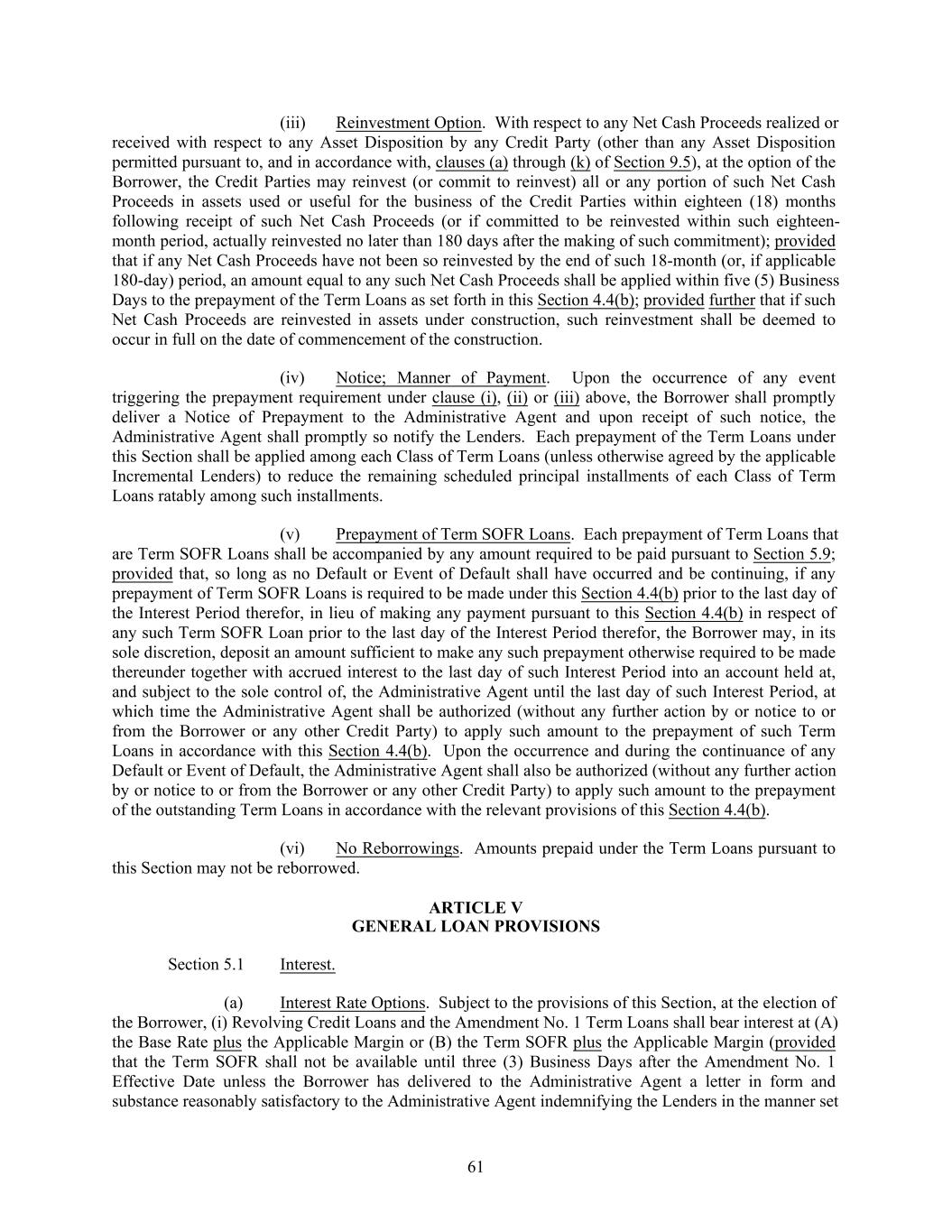 (iii) Reinvestment Option. With respect to any Net Cash Proceeds realized orreceived with respect to any Asset Disposition by any Credit Party (other than any Asset Dispositionpermitted pursuant to, and in accordance with, clauses (a) through (k) of Section 9.5), at the option of theBorrower, the Credit Parties may reinvest (or commit to reinvest) all or any portion of such Net CashProceeds in assets used or useful for the business of the Credit Parties within eighteen (18) monthsfollowing receipt of such Net Cash Proceeds (or if committed to be reinvested within such eighteen-month period, actually reinvested no later than 180 days after the making of such commitment); providedthat if any Net Cash Proceeds have not been so reinvested by the end of such 18-month (or, if applicable180-day) period, an amount equal to any such Net Cash Proceeds shall be applied within five (5) BusinessDays to the prepayment of the Term Loans as set forth in this Section 4.4(b); provided further that if suchNet Cash Proceeds are reinvested in assets under construction, such reinvestment shall be deemed tooccur in full on the date of commencement of the construction.(iv) Notice; Manner of Payment. Upon the occurrence of any eventtriggering the prepayment requirement under clause (i), (ii) or (iii) above, the Borrower shall promptlydeliver a Notice of Prepayment to the Administrative Agent and upon receipt of such notice, theAdministrative Agent shall promptly so notify the Lenders. Each prepayment of the Term Loans underthis Section shall be applied among each Class of Term Loans (unless otherwise agreed by the applicableIncremental Lenders) to reduce the remaining scheduled principal installments of each Class of TermLoans ratably among such installments.(v) Prepayment of Term SOFR Loans. Each prepayment of Term Loans thatare Term SOFR Loans shall be accompanied by any amount required to be paid pursuant to Section 5.9;provided that, so long as no Default or Event of Default shall have occurred and be continuing, if anyprepayment of Term SOFR Loans is required to be made under this Section 4.4(b) prior to the last day ofthe Interest Period therefor, in lieu of making any payment pursuant to this Section 4.4(b) in respect ofany such Term SOFR Loan prior to the last day of the Interest Period therefor, the Borrower may, in itssole discretion, deposit an amount sufficient to make any such prepayment otherwise required to be madethereunder together with accrued interest to the last day of such Interest Period into an account held at,and subject to the sole control of, the Administrative Agent until the last day of such Interest Period, atwhich time the Administrative Agent shall be authorized (without any further action by or notice to orfrom the Borrower or any other Credit Party) to apply such amount to the prepayment of such TermLoans in accordance with this Section 4.4(b). Upon the occurrence and during the continuance of anyDefault or Event of Default, the Administrative Agent shall also be authorized (without any further actionby or notice to or from the Borrower or any other Credit Party) to apply such amount to the prepaymentof the outstanding Term Loans in accordance with the relevant provisions of this Section 4.4(b).(vi) No Reborrowings. Amounts prepaid under the Term Loans pursuant tothis Section may not be reborrowed. ARTICLE VGENERAL LOAN PROVISIONSSection 5.1 Interest.(a) Interest Rate Options. Subject to the provisions of this Section, at the election ofthe Borrower, (i) Revolving Credit Loans and the Amendment No. 1 Term Loans shall bear interest at (A)the Base Rate plus the Applicable Margin or (B) the Term SOFR plus the Applicable Margin (providedthat the Term SOFR shall not be available until three (3) Business Days after the Amendment No. 1Effective Date unless the Borrower has delivered to the Administrative Agent a letter in form andsubstance reasonably satisfactory to the Administrative Agent indemnifying the Lenders in the manner set61