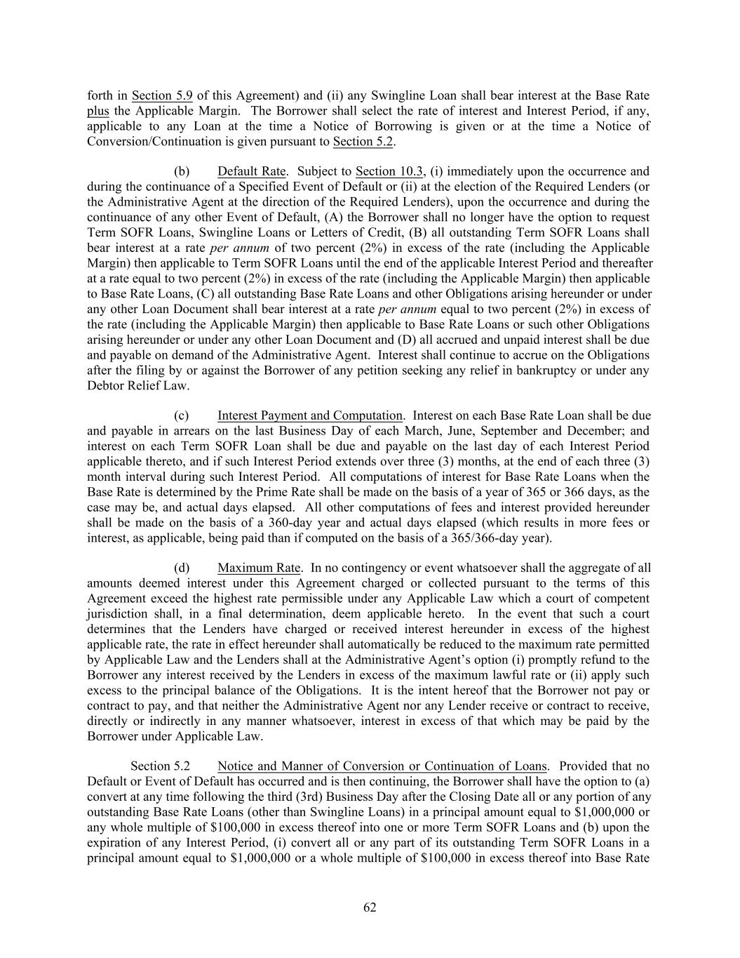 forth in Section 5.9 of this Agreement) and (ii) any Swingline Loan shall bear interest at the Base Rateplus the Applicable Margin. The Borrower shall select the rate of interest and Interest Period, if any,applicable to any Loan at the time a Notice of Borrowing is given or at the time a Notice ofConversion/Continuation is given pursuant to Section 5.2.(b) Default Rate. Subject to Section 10.3, (i) immediately upon the occurrence andduring the continuance of a Specified Event of Default or (ii) at the election of the Required Lenders (orthe Administrative Agent at the direction of the Required Lenders), upon the occurrence and during thecontinuance of any other Event of Default, (A) the Borrower shall no longer have the option to requestTerm SOFR Loans, Swingline Loans or Letters of Credit, (B) all outstanding Term SOFR Loans shallbear interest at a rate per annum of two percent (2%) in excess of the rate (including the ApplicableMargin) then applicable to Term SOFR Loans until the end of the applicable Interest Period and thereafterat a rate equal to two percent (2%) in excess of the rate (including the Applicable Margin) then applicableto Base Rate Loans, (C) all outstanding Base Rate Loans and other Obligations arising hereunder or underany other Loan Document shall bear interest at a rate per annum equal to two percent (2%) in excess ofthe rate (including the Applicable Margin) then applicable to Base Rate Loans or such other Obligationsarising hereunder or under any other Loan Document and (D) all accrued and unpaid interest shall be dueand payable on demand of the Administrative Agent. Interest shall continue to accrue on the Obligationsafter the filing by or against the Borrower of any petition seeking any relief in bankruptcy or under anyDebtor Relief Law.(c) Interest Payment and Computation. Interest on each Base Rate Loan shall be dueand payable in arrears on the last Business Day of each March, June, September and December; andinterest on each Term SOFR Loan shall be due and payable on the last day of each Interest Periodapplicable thereto, and if such Interest Period extends over three (3) months, at the end of each three (3)month interval during such Interest Period. All computations of interest for Base Rate Loans when theBase Rate is determined by the Prime Rate shall be made on the basis of a year of 365 or 366 days, as thecase may be, and actual days elapsed. All other computations of fees and interest provided hereundershall be made on the basis of a 360-day year and actual days elapsed (which results in more fees orinterest, as applicable, being paid than if computed on the basis of a 365/366-day year).(d) Maximum Rate. In no contingency or event whatsoever shall the aggregate of allamounts deemed interest under this Agreement charged or collected pursuant to the terms of thisAgreement exceed the highest rate permissible under any Applicable Law which a court of competentjurisdiction shall, in a final determination, deem applicable hereto. In the event that such a courtdetermines that the Lenders have charged or received interest hereunder in excess of the highestapplicable rate, the rate in effect hereunder shall automatically be reduced to the maximum rate permittedby Applicable Law and the Lenders shall at the Administrative Agent’s option (i) promptly refund to theBorrower any interest received by the Lenders in excess of the maximum lawful rate or (ii) apply suchexcess to the principal balance of the Obligations. It is the intent hereof that the Borrower not pay orcontract to pay, and that neither the Administrative Agent nor any Lender receive or contract to receive,directly or indirectly in any manner whatsoever, interest in excess of that which may be paid by theBorrower under Applicable Law.Section 5.2 Notice and Manner of Conversion or Continuation of Loans. Provided that noDefault or Event of Default has occurred and is then continuing, the Borrower shall have the option to (a)convert at any time following the third (3rd) Business Day after the Closing Date all or any portion of anyoutstanding Base Rate Loans (other than Swingline Loans) in a principal amount equal to $1,000,000 orany whole multiple of $100,000 in excess thereof into one or more Term SOFR Loans and (b) upon theexpiration of any Interest Period, (i) convert all or any part of its outstanding Term SOFR Loans in aprincipal amount equal to $1,000,000 or a whole multiple of $100,000 in excess thereof into Base Rate62