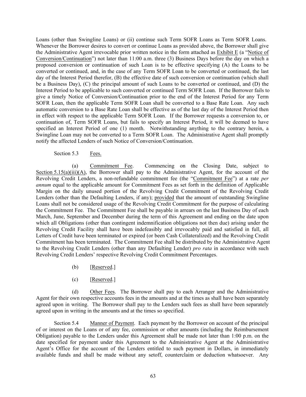 Loans (other than Swingline Loans) or (ii) continue such Term SOFR Loans as Term SOFR Loans.Whenever the Borrower desires to convert or continue Loans as provided above, the Borrower shall givethe Administrative Agent irrevocable prior written notice in the form attached as Exhibit E (a “Notice ofConversion/Continuation”) not later than 11:00 a.m. three (3) Business Days before the day on which aproposed conversion or continuation of such Loan is to be effective specifying (A) the Loans to beconverted or continued, and, in the case of any Term SOFR Loan to be converted or continued, the lastday of the Interest Period therefor, (B) the effective date of such conversion or continuation (which shallbe a Business Day), (C) the principal amount of such Loans to be converted or continued, and (D) theInterest Period to be applicable to such converted or continued Term SOFR Loan. If the Borrower fails togive a timely Notice of Conversion/Continuation prior to the end of the Interest Period for any TermSOFR Loan, then the applicable Term SOFR Loan shall be converted to a Base Rate Loan. Any suchautomatic conversion to a Base Rate Loan shall be effective as of the last day of the Interest Period thenin effect with respect to the applicable Term SOFR Loan. If the Borrower requests a conversion to, orcontinuation of, Term SOFR Loans, but fails to specify an Interest Period, it will be deemed to havespecified an Interest Period of one (1) month. Notwithstanding anything to the contrary herein, aSwingline Loan may not be converted to a Term SOFR Loan. The Administrative Agent shall promptlynotify the affected Lenders of such Notice of Conversion/Continuation.Section 5.3 Fees.(a) Commitment Fee. Commencing on the Closing Date, subject toSection 5.15(a)(iii)(A), the Borrower shall pay to the Administrative Agent, for the account of theRevolving Credit Lenders, a non-refundable commitment fee (the “Commitment Fee”) at a rate perannum equal to the applicable amount for Commitment Fees as set forth in the definition of ApplicableMargin on the daily unused portion of the Revolving Credit Commitment of the Revolving CreditLenders (other than the Defaulting Lenders, if any); provided that the amount of outstanding SwinglineLoans shall not be considered usage of the Revolving Credit Commitment for the purpose of calculatingthe Commitment Fee. The Commitment Fee shall be payable in arrears on the last Business Day of eachMarch, June, September and December during the term of this Agreement and ending on the date uponwhich all Obligations (other than contingent indemnification obligations not then due) arising under theRevolving Credit Facility shall have been indefeasibly and irrevocably paid and satisfied in full, allLetters of Credit have been terminated or expired (or been Cash Collateralized) and the Revolving CreditCommitment has been terminated. The Commitment Fee shall be distributed by the Administrative Agentto the Revolving Credit Lenders (other than any Defaulting Lender) pro rata in accordance with suchRevolving Credit Lenders’ respective Revolving Credit Commitment Percentages.(b) [Reserved.](c) [Reserved.](d) Other Fees. The Borrower shall pay to each Arranger and the AdministrativeAgent for their own respective accounts fees in the amounts and at the times as shall have been separatelyagreed upon in writing. The Borrower shall pay to the Lenders such fees as shall have been separatelyagreed upon in writing in the amounts and at the times so specified.Section 5.4 Manner of Payment. Each payment by the Borrower on account of the principalof or interest on the Loans or of any fee, commission or other amounts (including the ReimbursementObligation) payable to the Lenders under this Agreement shall be made not later than 1:00 p.m. on thedate specified for payment under this Agreement to the Administrative Agent at the AdministrativeAgent’s Office for the account of the Lenders entitled to such payment in Dollars, in immediatelyavailable funds and shall be made without any setoff, counterclaim or deduction whatsoever. Any63