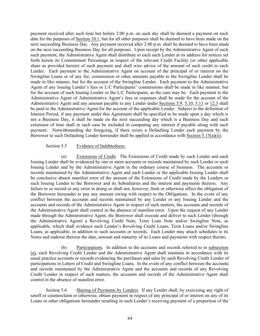 payment received after such time but before 2:00 p.m. on such day shall be deemed a payment on suchdate for the purposes of Section 10.1, but for all other purposes shall be deemed to have been made on thenext succeeding Business Day. Any payment received after 2:00 p.m. shall be deemed to have been madeon the next succeeding Business Day for all purposes. Upon receipt by the Administrative Agent of eachsuch payment, the Administrative Agent shall distribute to each such Lender at its address for notices setforth herein its Commitment Percentage in respect of the relevant Credit Facility (or other applicableshare as provided herein) of such payment and shall wire advice of the amount of such credit to eachLender. Each payment to the Administrative Agent on account of the principal of or interest on theSwingline Loans or of any fee, commission or other amounts payable to the Swingline Lender shall bemade in like manner, but for the account of the Swingline Lender. Each payment to the AdministrativeAgent of any Issuing Lender’s fees or L/C Participants’ commissions shall be made in like manner, butfor the account of such Issuing Lender or the L/C Participants, as the case may be. Each payment to theAdministrative Agent of Administrative Agent’s fees or expenses shall be made for the account of theAdministrative Agent and any amount payable to any Lender under Sections 5.9, 5.10, 5.11 or 12.3 shallbe paid to the Administrative Agent for the account of the applicable Lender. Subject to the definition ofInterest Period, if any payment under this Agreement shall be specified to be made upon a day which isnot a Business Day, it shall be made on the next succeeding day which is a Business Day and suchextension of time shall in such case be included in computing any interest if payable along with suchpayment. Notwithstanding the foregoing, if there exists a Defaulting Lender each payment by theBorrower to such Defaulting Lender hereunder shall be applied in accordance with Section 5.15(a)(ii).Section 5.5 Evidence of Indebtedness.(a) Extensions of Credit. The Extensions of Credit made by each Lender and eachIssuing Lender shall be evidenced by one or more accounts or records maintained by such Lender or suchIssuing Lender and by the Administrative Agent in the ordinary course of business. The accounts orrecords maintained by the Administrative Agent and each Lender or the applicable Issuing Lender shallbe conclusive absent manifest error of the amount of the Extensions of Credit made by the Lenders orsuch Issuing Lender to the Borrower and its Subsidiaries and the interest and payments thereon. Anyfailure to so record or any error in doing so shall not, however, limit or otherwise affect the obligation ofthe Borrower hereunder to pay any amount owing with respect to the Obligations. In the event of anyconflict between the accounts and records maintained by any Lender or any Issuing Lender and theaccounts and records of the Administrative Agent in respect of such matters, the accounts and records ofthe Administrative Agent shall control in the absence of manifest error. Upon the request of any Lendermade through the Administrative Agent, the Borrower shall execute and deliver to such Lender (throughthe Administrative Agent) a Revolving Credit Note, Term Loan Note and/or Swingline Note, asapplicable, which shall evidence such Lender’s Revolving Credit Loans, Term Loans and/or SwinglineLoans, as applicable, in addition to such accounts or records. Each Lender may attach schedules to itsNotes and endorse thereon the date, amount and maturity of its Loans and payments with respect thereto.(b) Participations. In addition to the accounts and records referred to in subsection(a), each Revolving Credit Lender and the Administrative Agent shall maintain in accordance with itsusual practice accounts or records evidencing the purchases and sales by such Revolving Credit Lender ofparticipations in Letters of Credit and Swingline Loans. In the event of any conflict between the accountsand records maintained by the Administrative Agent and the accounts and records of any RevolvingCredit Lender in respect of such matters, the accounts and records of the Administrative Agent shallcontrol in the absence of manifest error.Section 5.6 Sharing of Payments by Lenders. If any Lender shall, by exercising any right ofsetoff or counterclaim or otherwise, obtain payment in respect of any principal of or interest on any of itsLoans or other obligations hereunder resulting in such Lender’s receiving payment of a proportion of the64