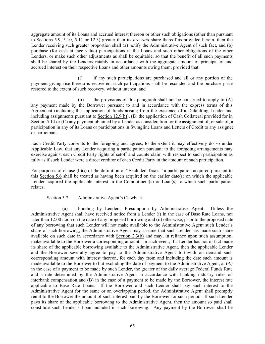 aggregate amount of its Loans and accrued interest thereon or other such obligations (other than pursuantto Sections 5.9, 5.10, 5.11 or 12.3) greater than its pro rata share thereof as provided herein, then theLender receiving such greater proportion shall (a) notify the Administrative Agent of such fact, and (b)purchase (for cash at face value) participations in the Loans and such other obligations of the otherLenders, or make such other adjustments as shall be equitable, so that the benefit of all such paymentsshall be shared by the Lenders ratably in accordance with the aggregate amount of principal of andaccrued interest on their respective Loans and other amounts owing them; provided that:(i) if any such participations are purchased and all or any portion of thepayment giving rise thereto is recovered, such participations shall be rescinded and the purchase pricerestored to the extent of such recovery, without interest, and(ii) the provisions of this paragraph shall not be construed to apply to (A)any payment made by the Borrower pursuant to and in accordance with the express terms of thisAgreement (including the application of funds arising from the existence of a Defaulting Lender andincluding assignments pursuant to Section 12.9(h)), (B) the application of Cash Collateral provided for inSection 5.14 or (C) any payment obtained by a Lender as consideration for the assignment of, or sale of, aparticipation in any of its Loans or participations in Swingline Loans and Letters of Credit to any assigneeor participant.Each Credit Party consents to the foregoing and agrees, to the extent it may effectively do so underApplicable Law, that any Lender acquiring a participation pursuant to the foregoing arrangements mayexercise against each Credit Party rights of setoff and counterclaim with respect to such participation asfully as if such Lender were a direct creditor of each Credit Party in the amount of such participation.For purposes of clause (b)(i) of the definition of “Excluded Taxes,” a participation acquired pursuant tothis Section 5.6 shall be treated as having been acquired on the earlier date(s) on which the applicableLender acquired the applicable interest in the Commitment(s) or Loan(s) to which such participationrelates. Section 5.7 Administrative Agent’s Clawback.(a) Funding by Lenders; Presumption by Administrative Agent. Unless theAdministrative Agent shall have received notice from a Lender (i) in the case of Base Rate Loans, notlater than 12:00 noon on the date of any proposed borrowing and (ii) otherwise, prior to the proposed dateof any borrowing that such Lender will not make available to the Administrative Agent such Lender’sshare of such borrowing, the Administrative Agent may assume that such Lender has made such shareavailable on such date in accordance with Section 2.3(b) and may, in reliance upon such assumption,make available to the Borrower a corresponding amount. In such event, if a Lender has not in fact madeits share of the applicable borrowing available to the Administrative Agent, then the applicable Lenderand the Borrower severally agree to pay to the Administrative Agent forthwith on demand suchcorresponding amount with interest thereon, for each day from and including the date such amount ismade available to the Borrower to but excluding the date of payment to the Administrative Agent, at (A)in the case of a payment to be made by such Lender, the greater of the daily average Federal Funds Rateand a rate determined by the Administrative Agent in accordance with banking industry rules oninterbank compensation and (B) in the case of a payment to be made by the Borrower, the interest rateapplicable to Base Rate Loans. If the Borrower and such Lender shall pay such interest to theAdministrative Agent for the same or an overlapping period, the Administrative Agent shall promptlyremit to the Borrower the amount of such interest paid by the Borrower for such period. If such Lenderpays its share of the applicable borrowing to the Administrative Agent, then the amount so paid shallconstitute such Lender’s Loan included in such borrowing. Any payment by the Borrower shall be65