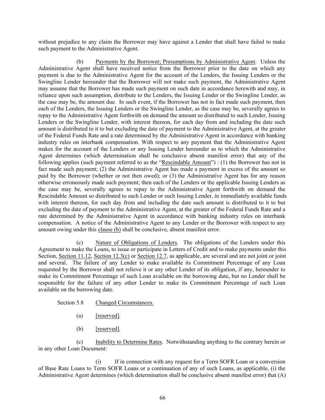 without prejudice to any claim the Borrower may have against a Lender that shall have failed to makesuch payment to the Administrative Agent.(b) Payments by the Borrower; Presumptions by Administrative Agent. Unless theAdministrative Agent shall have received notice from the Borrower prior to the date on which anypayment is due to the Administrative Agent for the account of the Lenders, the Issuing Lenders or theSwingline Lender hereunder that the Borrower will not make such payment, the Administrative Agentmay assume that the Borrower has made such payment on such date in accordance herewith and may, inreliance upon such assumption, distribute to the Lenders, the Issuing Lender or the Swingline Lender, asthe case may be, the amount due. In such event, if the Borrower has not in fact made such payment, theneach of the Lenders, the Issuing Lenders or the Swingline Lender, as the case may be, severally agrees torepay to the Administrative Agent forthwith on demand the amount so distributed to such Lender, IssuingLenders or the Swingline Lender, with interest thereon, for each day from and including the date suchamount is distributed to it to but excluding the date of payment to the Administrative Agent, at the greaterof the Federal Funds Rate and a rate determined by the Administrative Agent in accordance with bankingindustry rules on interbank compensation. With respect to any payment that the Administrative Agentmakes for the account of the Lenders or any Issuing Lender hereunder as to which the AdministrativeAgent determines (which determination shall be conclusive absent manifest error) that any of thefollowing applies (such payment referred to as the “Rescindable Amount”) : (1) the Borrower has not infact made such payment; (2) the Administrative Agent has made a payment in excess of the amount sopaid by the Borrower (whether or not then owed); or (3) the Administrative Agent has for any reasonotherwise erroneously made such payment; then each of the Lenders or the applicable Issuing Lenders asthe case may be, severally agrees to repay to the Administrative Agent forthwith on demand theRescindable Amount so distributed to such Lender or such Issuing Lender, in immediately available fundswith interest thereon, for each day from and including the date such amount is distributed to it to butexcluding the date of payment to the Administrative Agent, at the greater of the Federal Funds Rate and arate determined by the Administrative Agent in accordance with banking industry rules on interbankcompensation. A notice of the Administrative Agent to any Lender or the Borrower with respect to anyamount owing under this clause (b) shall be conclusive, absent manifest error.(c) Nature of Obligations of Lenders. The obligations of the Lenders under thisAgreement to make the Loans, to issue or participate in Letters of Credit and to make payments under thisSection, Section 11.12, Section 12.3(c) or Section 12.7, as applicable, are several and are not joint or jointand several. The failure of any Lender to make available its Commitment Percentage of any Loanrequested by the Borrower shall not relieve it or any other Lender of its obligation, if any, hereunder tomake its Commitment Percentage of such Loan available on the borrowing date, but no Lender shall beresponsible for the failure of any other Lender to make its Commitment Percentage of such Loanavailable on the borrowing date.Section 5.8 Changed Circumstances.(a) [reserved].(b) [reserved].(c) Inability to Determine Rates. Notwithstanding anything to the contrary herein orin any other Loan Document:(i) If in connection with any request for a Term SOFR Loan or a conversionof Base Rate Loans to Term SOFR Loans or a continuation of any of such Loans, as applicable, (i) theAdministrative Agent determines (which determination shall be conclusive absent manifest error) that (A)66