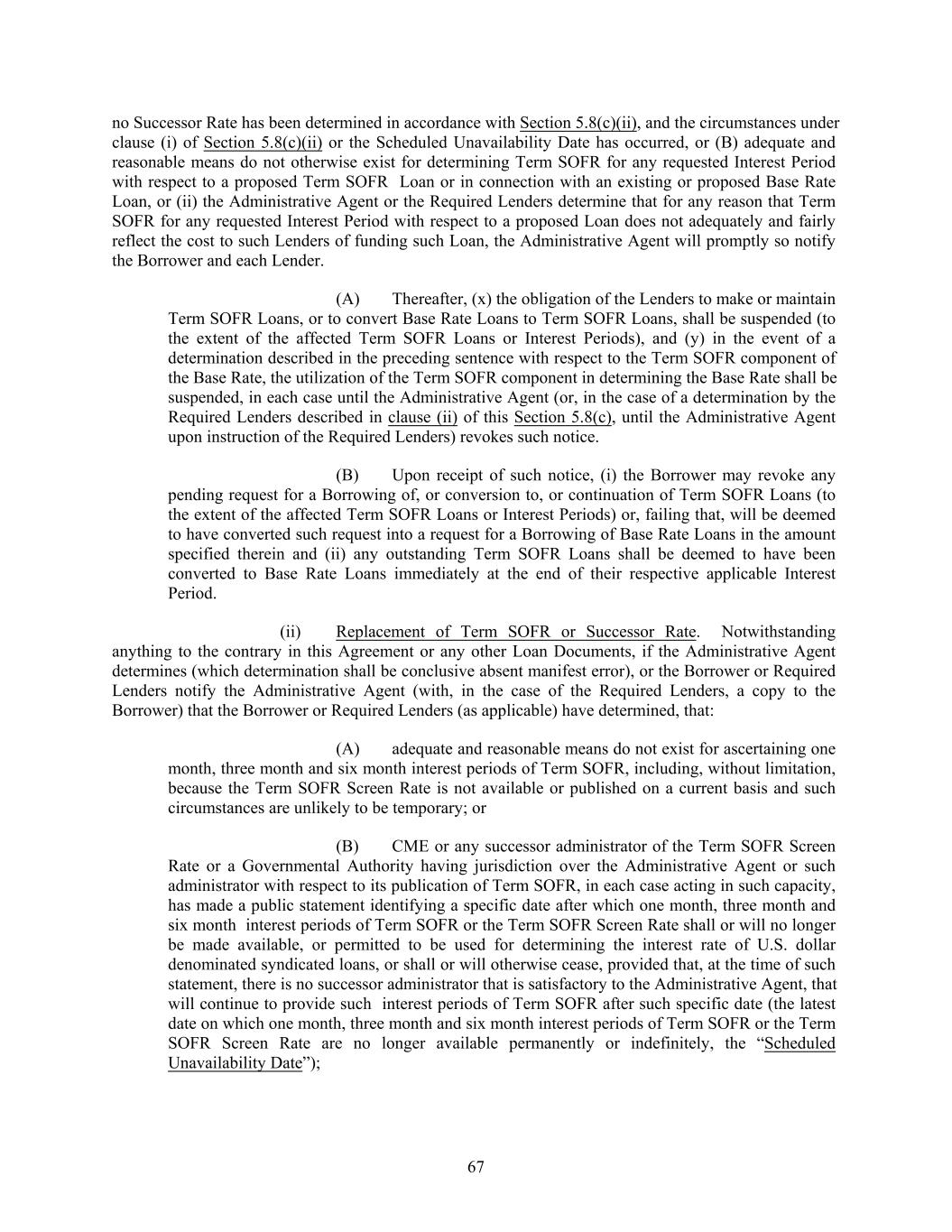 no Successor Rate has been determined in accordance with Section 5.8(c)(ii), and the circumstances underclause (i) of Section 5.8(c)(ii) or the Scheduled Unavailability Date has occurred, or (B) adequate andreasonable means do not otherwise exist for determining Term SOFR for any requested Interest Periodwith respect to a proposed Term SOFR Loan or in connection with an existing or proposed Base RateLoan, or (ii) the Administrative Agent or the Required Lenders determine that for any reason that TermSOFR for any requested Interest Period with respect to a proposed Loan does not adequately and fairlyreflect the cost to such Lenders of funding such Loan, the Administrative Agent will promptly so notifythe Borrower and each Lender. (A) Thereafter, (x) the obligation of the Lenders to make or maintainTerm SOFR Loans, or to convert Base Rate Loans to Term SOFR Loans, shall be suspended (tothe extent of the affected Term SOFR Loans or Interest Periods), and (y) in the event of adetermination described in the preceding sentence with respect to the Term SOFR component ofthe Base Rate, the utilization of the Term SOFR component in determining the Base Rate shall besuspended, in each case until the Administrative Agent (or, in the case of a determination by theRequired Lenders described in clause (ii) of this Section 5.8(c), until the Administrative Agentupon instruction of the Required Lenders) revokes such notice.(B) Upon receipt of such notice, (i) the Borrower may revoke anypending request for a Borrowing of, or conversion to, or continuation of Term SOFR Loans (tothe extent of the affected Term SOFR Loans or Interest Periods) or, failing that, will be deemedto have converted such request into a request for a Borrowing of Base Rate Loans in the amountspecified therein and (ii) any outstanding Term SOFR Loans shall be deemed to have beenconverted to Base Rate Loans immediately at the end of their respective applicable InterestPeriod. (ii) Replacement of Term SOFR or Successor Rate. Notwithstandinganything to the contrary in this Agreement or any other Loan Documents, if the Administrative Agentdetermines (which determination shall be conclusive absent manifest error), or the Borrower or RequiredLenders notify the Administrative Agent (with, in the case of the Required Lenders, a copy to theBorrower) that the Borrower or Required Lenders (as applicable) have determined, that:(A) adequate and reasonable means do not exist for ascertaining onemonth, three month and six month interest periods of Term SOFR, including, without limitation,because the Term SOFR Screen Rate is not available or published on a current basis and suchcircumstances are unlikely to be temporary; or(B) CME or any successor administrator of the Term SOFR ScreenRate or a Governmental Authority having jurisdiction over the Administrative Agent or suchadministrator with respect to its publication of Term SOFR, in each case acting in such capacity,has made a public statement identifying a specific date after which one month, three month andsix month interest periods of Term SOFR or the Term SOFR Screen Rate shall or will no longerbe made available, or permitted to be used for determining the interest rate of U.S. dollardenominated syndicated loans, or shall or will otherwise cease, provided that, at the time of suchstatement, there is no successor administrator that is satisfactory to the Administrative Agent, thatwill continue to provide such interest periods of Term SOFR after such specific date (the latestdate on which one month, three month and six month interest periods of Term SOFR or the TermSOFR Screen Rate are no longer available permanently or indefinitely, the “ScheduledUnavailability Date”); 67