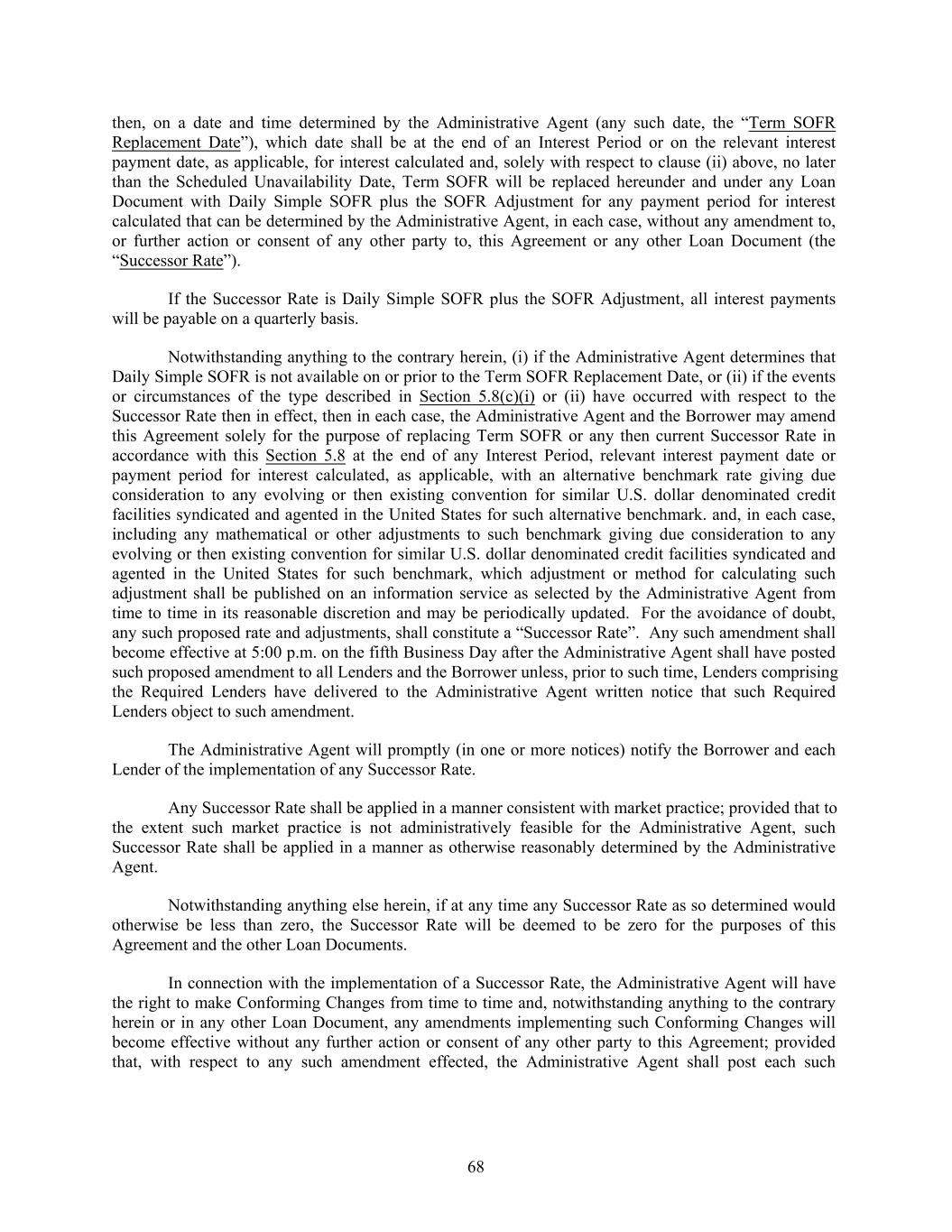 then, on a date and time determined by the Administrative Agent (any such date, the “Term SOFRReplacement Date”), which date shall be at the end of an Interest Period or on the relevant interestpayment date, as applicable, for interest calculated and, solely with respect to clause (ii) above, no laterthan the Scheduled Unavailability Date, Term SOFR will be replaced hereunder and under any LoanDocument with Daily Simple SOFR plus the SOFR Adjustment for any payment period for interestcalculated that can be determined by the Administrative Agent, in each case, without any amendment to,or further action or consent of any other party to, this Agreement or any other Loan Document (the“Successor Rate”).If the Successor Rate is Daily Simple SOFR plus the SOFR Adjustment, all interest paymentswill be payable on a quarterly basis.Notwithstanding anything to the contrary herein, (i) if the Administrative Agent determines thatDaily Simple SOFR is not available on or prior to the Term SOFR Replacement Date, or (ii) if the eventsor circumstances of the type described in Section 5.8(c)(i) or (ii) have occurred with respect to theSuccessor Rate then in effect, then in each case, the Administrative Agent and the Borrower may amendthis Agreement solely for the purpose of replacing Term SOFR or any then current Successor Rate inaccordance with this Section 5.8 at the end of any Interest Period, relevant interest payment date orpayment period for interest calculated, as applicable, with an alternative benchmark rate giving dueconsideration to any evolving or then existing convention for similar U.S. dollar denominated creditfacilities syndicated and agented in the United States for such alternative benchmark. and, in each case,including any mathematical or other adjustments to such benchmark giving due consideration to anyevolving or then existing convention for similar U.S. dollar denominated credit facilities syndicated andagented in the United States for such benchmark, which adjustment or method for calculating suchadjustment shall be published on an information service as selected by the Administrative Agent fromtime to time in its reasonable discretion and may be periodically updated. For the avoidance of doubt,any such proposed rate and adjustments, shall constitute a “Successor Rate”. Any such amendment shallbecome effective at 5:00 p.m. on the fifth Business Day after the Administrative Agent shall have postedsuch proposed amendment to all Lenders and the Borrower unless, prior to such time, Lenders comprisingthe Required Lenders have delivered to the Administrative Agent written notice that such RequiredLenders object to such amendment.The Administrative Agent will promptly (in one or more notices) notify the Borrower and eachLender of the implementation of any Successor Rate.Any Successor Rate shall be applied in a manner consistent with market practice; provided that tothe extent such market practice is not administratively feasible for the Administrative Agent, suchSuccessor Rate shall be applied in a manner as otherwise reasonably determined by the AdministrativeAgent. Notwithstanding anything else herein, if at any time any Successor Rate as so determined wouldotherwise be less than zero, the Successor Rate will be deemed to be zero for the purposes of thisAgreement and the other Loan Documents.In connection with the implementation of a Successor Rate, the Administrative Agent will havethe right to make Conforming Changes from time to time and, notwithstanding anything to the contraryherein or in any other Loan Document, any amendments implementing such Conforming Changes willbecome effective without any further action or consent of any other party to this Agreement; providedthat, with respect to any such amendment effected, the Administrative Agent shall post each such68