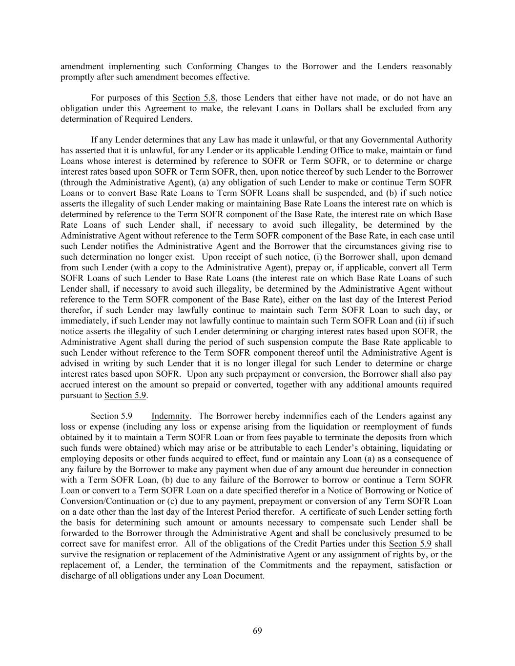 amendment implementing such Conforming Changes to the Borrower and the Lenders reasonablypromptly after such amendment becomes effective.For purposes of this Section 5.8, those Lenders that either have not made, or do not have anobligation under this Agreement to make, the relevant Loans in Dollars shall be excluded from anydetermination of Required Lenders.If any Lender determines that any Law has made it unlawful, or that any Governmental Authorityhas asserted that it is unlawful, for any Lender or its applicable Lending Office to make, maintain or fundLoans whose interest is determined by reference to SOFR or Term SOFR, or to determine or chargeinterest rates based upon SOFR or Term SOFR, then, upon notice thereof by such Lender to the Borrower(through the Administrative Agent), (a) any obligation of such Lender to make or continue Term SOFRLoans or to convert Base Rate Loans to Term SOFR Loans shall be suspended, and (b) if such noticeasserts the illegality of such Lender making or maintaining Base Rate Loans the interest rate on which isdetermined by reference to the Term SOFR component of the Base Rate, the interest rate on which BaseRate Loans of such Lender shall, if necessary to avoid such illegality, be determined by theAdministrative Agent without reference to the Term SOFR component of the Base Rate, in each case untilsuch Lender notifies the Administrative Agent and the Borrower that the circumstances giving rise tosuch determination no longer exist. Upon receipt of such notice, (i) the Borrower shall, upon demandfrom such Lender (with a copy to the Administrative Agent), prepay or, if applicable, convert all TermSOFR Loans of such Lender to Base Rate Loans (the interest rate on which Base Rate Loans of suchLender shall, if necessary to avoid such illegality, be determined by the Administrative Agent withoutreference to the Term SOFR component of the Base Rate), either on the last day of the Interest Periodtherefor, if such Lender may lawfully continue to maintain such Term SOFR Loan to such day, orimmediately, if such Lender may not lawfully continue to maintain such Term SOFR Loan and (ii) if suchnotice asserts the illegality of such Lender determining or charging interest rates based upon SOFR, theAdministrative Agent shall during the period of such suspension compute the Base Rate applicable tosuch Lender without reference to the Term SOFR component thereof until the Administrative Agent isadvised in writing by such Lender that it is no longer illegal for such Lender to determine or chargeinterest rates based upon SOFR. Upon any such prepayment or conversion, the Borrower shall also payaccrued interest on the amount so prepaid or converted, together with any additional amounts requiredpursuant to Section 5.9.Section 5.9 Indemnity. The Borrower hereby indemnifies each of the Lenders against anyloss or expense (including any loss or expense arising from the liquidation or reemployment of fundsobtained by it to maintain a Term SOFR Loan or from fees payable to terminate the deposits from whichsuch funds were obtained) which may arise or be attributable to each Lender’s obtaining, liquidating oremploying deposits or other funds acquired to effect, fund or maintain any Loan (a) as a consequence ofany failure by the Borrower to make any payment when due of any amount due hereunder in connectionwith a Term SOFR Loan, (b) due to any failure of the Borrower to borrow or continue a Term SOFRLoan or convert to a Term SOFR Loan on a date specified therefor in a Notice of Borrowing or Notice ofConversion/Continuation or (c) due to any payment, prepayment or conversion of any Term SOFR Loanon a date other than the last day of the Interest Period therefor. A certificate of such Lender setting forththe basis for determining such amount or amounts necessary to compensate such Lender shall beforwarded to the Borrower through the Administrative Agent and shall be conclusively presumed to becorrect save for manifest error. All of the obligations of the Credit Parties under this Section 5.9 shallsurvive the resignation or replacement of the Administrative Agent or any assignment of rights by, or thereplacement of, a Lender, the termination of the Commitments and the repayment, satisfaction ordischarge of all obligations under any Loan Document.69