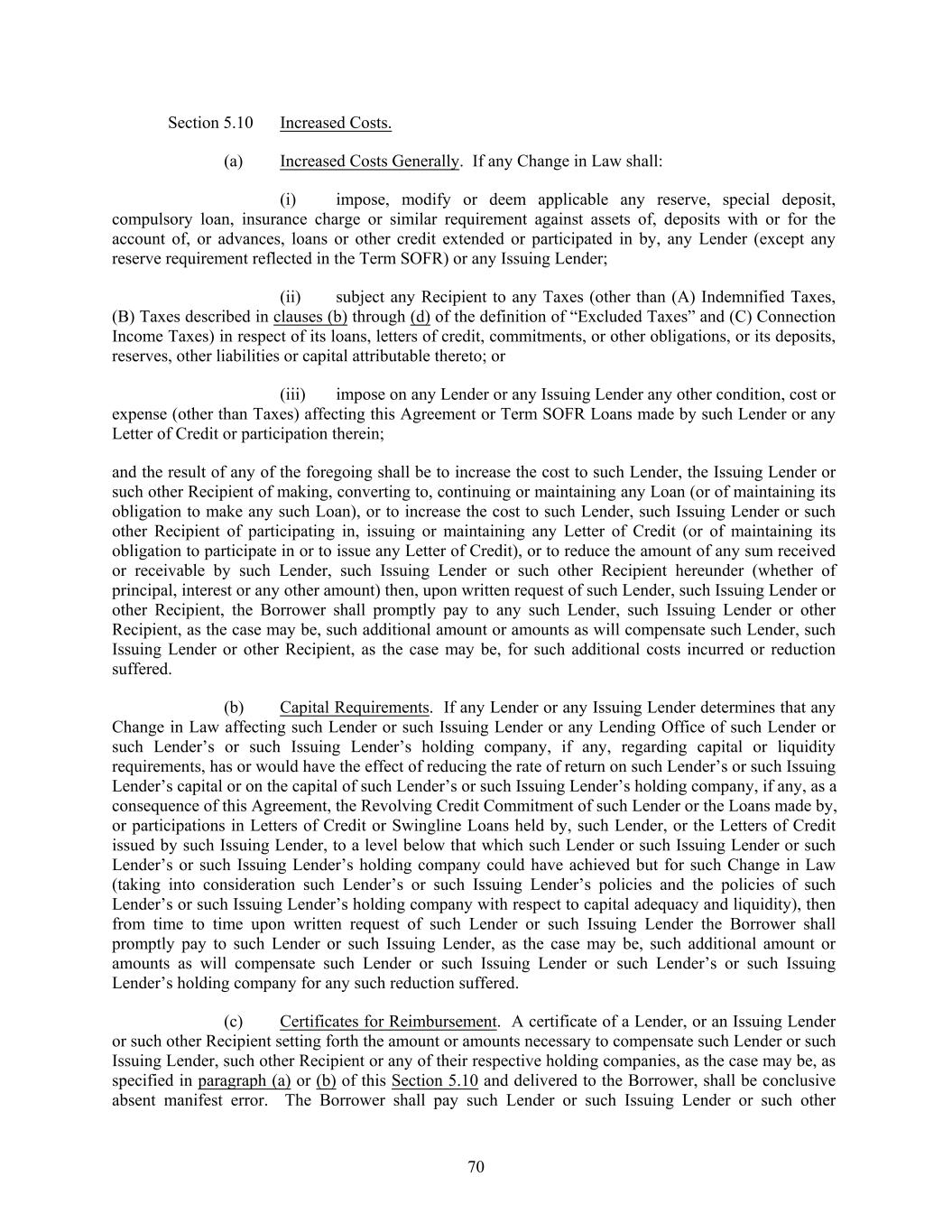 Section 5.10 Increased Costs.(a) Increased Costs Generally. If any Change in Law shall:(i) impose, modify or deem applicable any reserve, special deposit,compulsory loan, insurance charge or similar requirement against assets of, deposits with or for theaccount of, or advances, loans or other credit extended or participated in by, any Lender (except anyreserve requirement reflected in the Term SOFR) or any Issuing Lender;(ii) subject any Recipient to any Taxes (other than (A) Indemnified Taxes,(B) Taxes described in clauses (b) through (d) of the definition of “Excluded Taxes” and (C) ConnectionIncome Taxes) in respect of its loans, letters of credit, commitments, or other obligations, or its deposits,reserves, other liabilities or capital attributable thereto; or(iii) impose on any Lender or any Issuing Lender any other condition, cost orexpense (other than Taxes) affecting this Agreement or Term SOFR Loans made by such Lender or anyLetter of Credit or participation therein;and the result of any of the foregoing shall be to increase the cost to such Lender, the Issuing Lender orsuch other Recipient of making, converting to, continuing or maintaining any Loan (or of maintaining itsobligation to make any such Loan), or to increase the cost to such Lender, such Issuing Lender or suchother Recipient of participating in, issuing or maintaining any Letter of Credit (or of maintaining itsobligation to participate in or to issue any Letter of Credit), or to reduce the amount of any sum receivedor receivable by such Lender, such Issuing Lender or such other Recipient hereunder (whether ofprincipal, interest or any other amount) then, upon written request of such Lender, such Issuing Lender orother Recipient, the Borrower shall promptly pay to any such Lender, such Issuing Lender or otherRecipient, as the case may be, such additional amount or amounts as will compensate such Lender, suchIssuing Lender or other Recipient, as the case may be, for such additional costs incurred or reductionsuffered. (b) Capital Requirements. If any Lender or any Issuing Lender determines that anyChange in Law affecting such Lender or such Issuing Lender or any Lending Office of such Lender orsuch Lender’s or such Issuing Lender’s holding company, if any, regarding capital or liquidityrequirements, has or would have the effect of reducing the rate of return on such Lender’s or such IssuingLender’s capital or on the capital of such Lender’s or such Issuing Lender’s holding company, if any, as aconsequence of this Agreement, the Revolving Credit Commitment of such Lender or the Loans made by,or participations in Letters of Credit or Swingline Loans held by, such Lender, or the Letters of Creditissued by such Issuing Lender, to a level below that which such Lender or such Issuing Lender or suchLender’s or such Issuing Lender’s holding company could have achieved but for such Change in Law(taking into consideration such Lender’s or such Issuing Lender’s policies and the policies of suchLender’s or such Issuing Lender’s holding company with respect to capital adequacy and liquidity), thenfrom time to time upon written request of such Lender or such Issuing Lender the Borrower shallpromptly pay to such Lender or such Issuing Lender, as the case may be, such additional amount oramounts as will compensate such Lender or such Issuing Lender or such Lender’s or such IssuingLender’s holding company for any such reduction suffered.(c) Certificates for Reimbursement. A certificate of a Lender, or an Issuing Lenderor such other Recipient setting forth the amount or amounts necessary to compensate such Lender or suchIssuing Lender, such other Recipient or any of their respective holding companies, as the case may be, asspecified in paragraph (a) or (b) of this Section 5.10 and delivered to the Borrower, shall be conclusiveabsent manifest error. The Borrower shall pay such Lender or such Issuing Lender or such other70