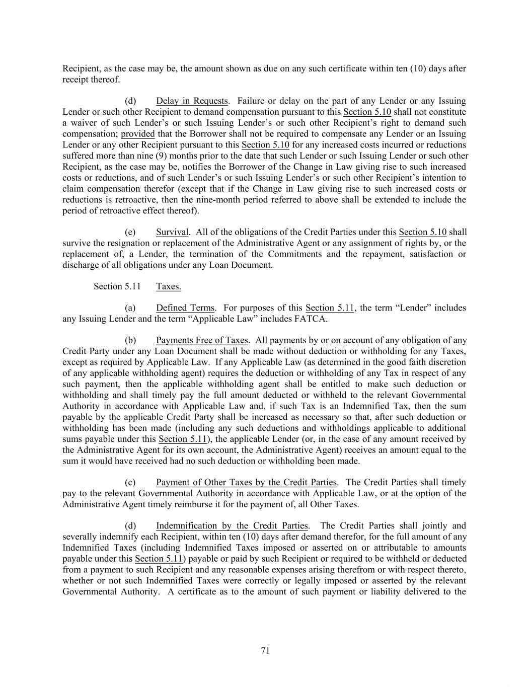 Recipient, as the case may be, the amount shown as due on any such certificate within ten (10) days afterreceipt thereof. (d) Delay in Requests. Failure or delay on the part of any Lender or any IssuingLender or such other Recipient to demand compensation pursuant to this Section 5.10 shall not constitutea waiver of such Lender’s or such Issuing Lender’s or such other Recipient’s right to demand suchcompensation; provided that the Borrower shall not be required to compensate any Lender or an IssuingLender or any other Recipient pursuant to this Section 5.10 for any increased costs incurred or reductionssuffered more than nine (9) months prior to the date that such Lender or such Issuing Lender or such otherRecipient, as the case may be, notifies the Borrower of the Change in Law giving rise to such increasedcosts or reductions, and of such Lender’s or such Issuing Lender’s or such other Recipient’s intention toclaim compensation therefor (except that if the Change in Law giving rise to such increased costs orreductions is retroactive, then the nine-month period referred to above shall be extended to include theperiod of retroactive effect thereof).(e) Survival. All of the obligations of the Credit Parties under this Section 5.10 shallsurvive the resignation or replacement of the Administrative Agent or any assignment of rights by, or thereplacement of, a Lender, the termination of the Commitments and the repayment, satisfaction ordischarge of all obligations under any Loan Document.Section 5.11 Taxes.(a) Defined Terms. For purposes of this Section 5.11, the term “Lender” includesany Issuing Lender and the term “Applicable Law” includes FATCA.(b) Payments Free of Taxes. All payments by or on account of any obligation of anyCredit Party under any Loan Document shall be made without deduction or withholding for any Taxes,except as required by Applicable Law. If any Applicable Law (as determined in the good faith discretionof any applicable withholding agent) requires the deduction or withholding of any Tax in respect of anysuch payment, then the applicable withholding agent shall be entitled to make such deduction orwithholding and shall timely pay the full amount deducted or withheld to the relevant GovernmentalAuthority in accordance with Applicable Law and, if such Tax is an Indemnified Tax, then the sumpayable by the applicable Credit Party shall be increased as necessary so that, after such deduction orwithholding has been made (including any such deductions and withholdings applicable to additionalsums payable under this Section 5.11), the applicable Lender (or, in the case of any amount received bythe Administrative Agent for its own account, the Administrative Agent) receives an amount equal to thesum it would have received had no such deduction or withholding been made.(c) Payment of Other Taxes by the Credit Parties. The Credit Parties shall timelypay to the relevant Governmental Authority in accordance with Applicable Law, or at the option of theAdministrative Agent timely reimburse it for the payment of, all Other Taxes.(d) Indemnification by the Credit Parties. The Credit Parties shall jointly andseverally indemnify each Recipient, within ten (10) days after demand therefor, for the full amount of anyIndemnified Taxes (including Indemnified Taxes imposed or asserted on or attributable to amountspayable under this Section 5.11) payable or paid by such Recipient or required to be withheld or deductedfrom a payment to such Recipient and any reasonable expenses arising therefrom or with respect thereto,whether or not such Indemnified Taxes were correctly or legally imposed or asserted by the relevantGovernmental Authority. A certificate as to the amount of such payment or liability delivered to the71