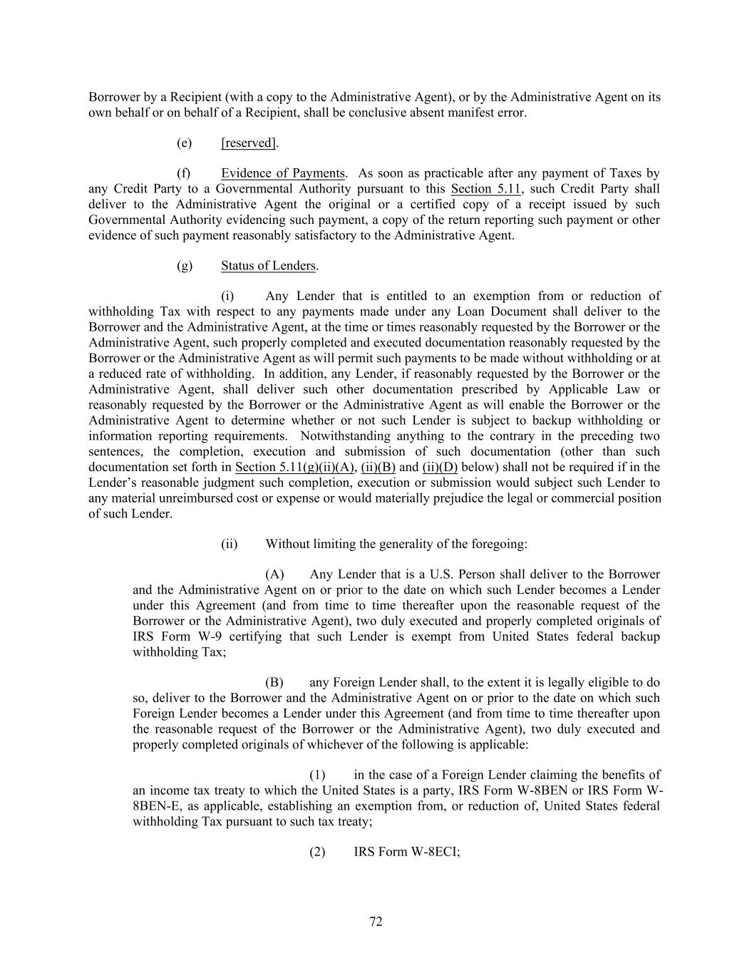 Borrower by a Recipient (with a copy to the Administrative Agent), or by the Administrative Agent on itsown behalf or on behalf of a Recipient, shall be conclusive absent manifest error.(e) [reserved].(f) Evidence of Payments. As soon as practicable after any payment of Taxes byany Credit Party to a Governmental Authority pursuant to this Section 5.11, such Credit Party shalldeliver to the Administrative Agent the original or a certified copy of a receipt issued by suchGovernmental Authority evidencing such payment, a copy of the return reporting such payment or otherevidence of such payment reasonably satisfactory to the Administrative Agent.(g) Status of Lenders.(i) Any Lender that is entitled to an exemption from or reduction ofwithholding Tax with respect to any payments made under any Loan Document shall deliver to theBorrower and the Administrative Agent, at the time or times reasonably requested by the Borrower or theAdministrative Agent, such properly completed and executed documentation reasonably requested by theBorrower or the Administrative Agent as will permit such payments to be made without withholding or ata reduced rate of withholding. In addition, any Lender, if reasonably requested by the Borrower or theAdministrative Agent, shall deliver such other documentation prescribed by Applicable Law orreasonably requested by the Borrower or the Administrative Agent as will enable the Borrower or theAdministrative Agent to determine whether or not such Lender is subject to backup withholding orinformation reporting requirements. Notwithstanding anything to the contrary in the preceding twosentences, the completion, execution and submission of such documentation (other than suchdocumentation set forth in Section 5.11(g)(ii)(A), (ii)(B) and (ii)(D) below) shall not be required if in theLender’s reasonable judgment such completion, execution or submission would subject such Lender toany material unreimbursed cost or expense or would materially prejudice the legal or commercial positionof such Lender. (ii) Without limiting the generality of the foregoing:(A) Any Lender that is a U.S. Person shall deliver to the Borrowerand the Administrative Agent on or prior to the date on which such Lender becomes a Lenderunder this Agreement (and from time to time thereafter upon the reasonable request of theBorrower or the Administrative Agent), two duly executed and properly completed originals ofIRS Form W-9 certifying that such Lender is exempt from United States federal backupwithholding Tax; (B) any Foreign Lender shall, to the extent it is legally eligible to doso, deliver to the Borrower and the Administrative Agent on or prior to the date on which suchForeign Lender becomes a Lender under this Agreement (and from time to time thereafter uponthe reasonable request of the Borrower or the Administrative Agent), two duly executed andproperly completed originals of whichever of the following is applicable:(1) in the case of a Foreign Lender claiming the benefits ofan income tax treaty to which the United States is a party, IRS Form W-8BEN or IRS Form W-8BEN-E, as applicable, establishing an exemption from, or reduction of, United States federalwithholding Tax pursuant to such tax treaty;(2) IRS Form W-8ECI;72