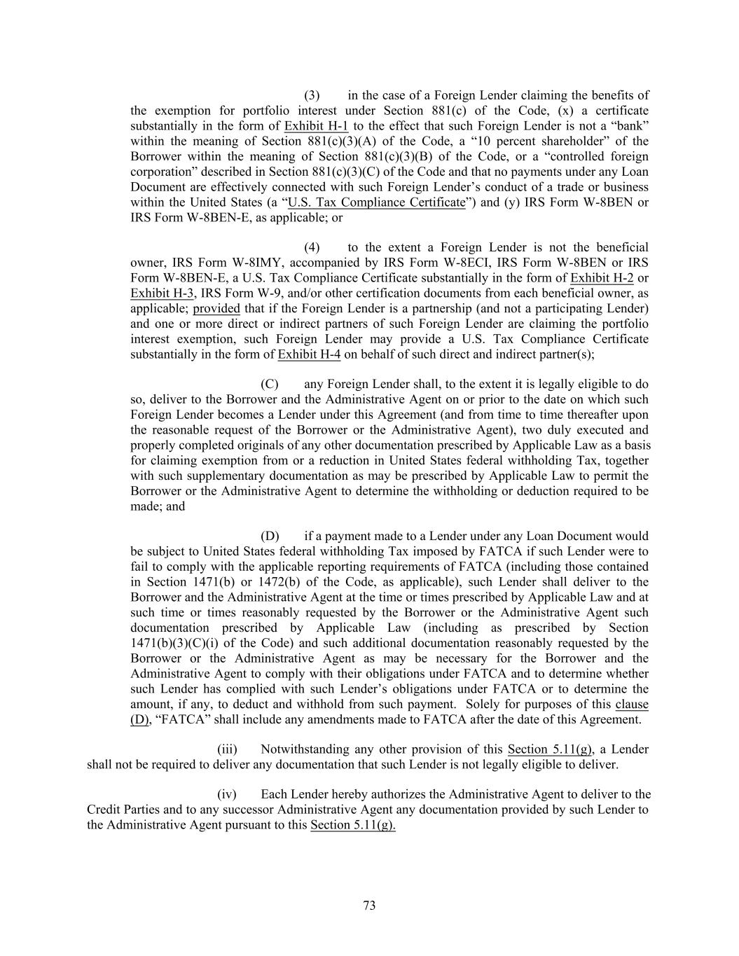 (3) in the case of a Foreign Lender claiming the benefits ofthe exemption for portfolio interest under Section 881(c) of the Code, (x) a certificatesubstantially in the form of Exhibit H-1 to the effect that such Foreign Lender is not a “bank”within the meaning of Section 881(c)(3)(A) of the Code, a “10 percent shareholder” of theBorrower within the meaning of Section 881(c)(3)(B) of the Code, or a “controlled foreigncorporation” described in Section 881(c)(3)(C) of the Code and that no payments under any LoanDocument are effectively connected with such Foreign Lender’s conduct of a trade or businesswithin the United States (a “U.S. Tax Compliance Certificate”) and (y) IRS Form W-8BEN orIRS Form W-8BEN-E, as applicable; or(4) to the extent a Foreign Lender is not the beneficialowner, IRS Form W-8IMY, accompanied by IRS Form W-8ECI, IRS Form W-8BEN or IRSForm W-8BEN-E, a U.S. Tax Compliance Certificate substantially in the form of Exhibit H-2 orExhibit H-3, IRS Form W-9, and/or other certification documents from each beneficial owner, asapplicable; provided that if the Foreign Lender is a partnership (and not a participating Lender)and one or more direct or indirect partners of such Foreign Lender are claiming the portfoliointerest exemption, such Foreign Lender may provide a U.S. Tax Compliance Certificatesubstantially in the form of Exhibit H-4 on behalf of such direct and indirect partner(s);(C) any Foreign Lender shall, to the extent it is legally eligible to doso, deliver to the Borrower and the Administrative Agent on or prior to the date on which suchForeign Lender becomes a Lender under this Agreement (and from time to time thereafter uponthe reasonable request of the Borrower or the Administrative Agent), two duly executed andproperly completed originals of any other documentation prescribed by Applicable Law as a basisfor claiming exemption from or a reduction in United States federal withholding Tax, togetherwith such supplementary documentation as may be prescribed by Applicable Law to permit theBorrower or the Administrative Agent to determine the withholding or deduction required to bemade; and (D) if a payment made to a Lender under any Loan Document wouldbe subject to United States federal withholding Tax imposed by FATCA if such Lender were tofail to comply with the applicable reporting requirements of FATCA (including those containedin Section 1471(b) or 1472(b) of the Code, as applicable), such Lender shall deliver to theBorrower and the Administrative Agent at the time or times prescribed by Applicable Law and atsuch time or times reasonably requested by the Borrower or the Administrative Agent suchdocumentation prescribed by Applicable Law (including as prescribed by Section1471(b)(3)(C)(i) of the Code) and such additional documentation reasonably requested by theBorrower or the Administrative Agent as may be necessary for the Borrower and theAdministrative Agent to comply with their obligations under FATCA and to determine whethersuch Lender has complied with such Lender’s obligations under FATCA or to determine theamount, if any, to deduct and withhold from such payment. Solely for purposes of this clause(D), “FATCA” shall include any amendments made to FATCA after the date of this Agreement.(iii) Notwithstanding any other provision of this Section 5.11(g), a Lendershall not be required to deliver any documentation that such Lender is not legally eligible to deliver.(iv) Each Lender hereby authorizes the Administrative Agent to deliver to theCredit Parties and to any successor Administrative Agent any documentation provided by such Lender tothe Administrative Agent pursuant to this Section 5.11(g).73
