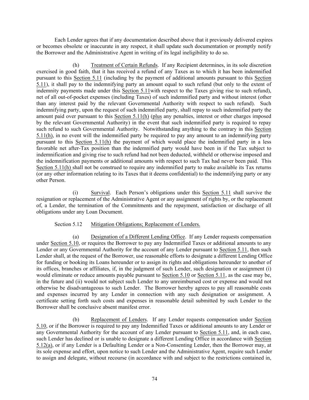 Each Lender agrees that if any documentation described above that it previously delivered expiresor becomes obsolete or inaccurate in any respect, it shall update such documentation or promptly notifythe Borrower and the Administrative Agent in writing of its legal ineligibility to do so.(h) Treatment of Certain Refunds. If any Recipient determines, in its sole discretionexercised in good faith, that it has received a refund of any Taxes as to which it has been indemnifiedpursuant to this Section 5.11 (including by the payment of additional amounts pursuant to this Section5.11), it shall pay to the indemnifying party an amount equal to such refund (but only to the extent ofindemnity payments made under this Section 5.11with respect to the Taxes giving rise to such refund),net of all out-of-pocket expenses (including Taxes) of such indemnified party and without interest (otherthan any interest paid by the relevant Governmental Authority with respect to such refund). Suchindemnifying party, upon the request of such indemnified party, shall repay to such indemnified party theamount paid over pursuant to this Section 5.11(h) (plus any penalties, interest or other charges imposedby the relevant Governmental Authority) in the event that such indemnified party is required to repaysuch refund to such Governmental Authority. Notwithstanding anything to the contrary in this Section5.11(h), in no event will the indemnified party be required to pay any amount to an indemnifying partypursuant to this Section 5.11(h) the payment of which would place the indemnified party in a lessfavorable net after-Tax position than the indemnified party would have been in if the Tax subject toindemnification and giving rise to such refund had not been deducted, withheld or otherwise imposed andthe indemnification payments or additional amounts with respect to such Tax had never been paid. ThisSection 5.11(h) shall not be construed to require any indemnified party to make available its Tax returns(or any other information relating to its Taxes that it deems confidential) to the indemnifying party or anyother Person. (i) Survival. Each Person’s obligations under this Section 5.11 shall survive theresignation or replacement of the Administrative Agent or any assignment of rights by, or the replacementof, a Lender, the termination of the Commitments and the repayment, satisfaction or discharge of allobligations under any Loan Document.Section 5.12 Mitigation Obligations; Replacement of Lenders.(a) Designation of a Different Lending Office. If any Lender requests compensationunder Section 5.10, or requires the Borrower to pay any Indemnified Taxes or additional amounts to anyLender or any Governmental Authority for the account of any Lender pursuant to Section 5.11, then suchLender shall, at the request of the Borrower, use reasonable efforts to designate a different Lending Officefor funding or booking its Loans hereunder or to assign its rights and obligations hereunder to another ofits offices, branches or affiliates, if, in the judgment of such Lender, such designation or assignment (i)would eliminate or reduce amounts payable pursuant to Section 5.10 or Section 5.11, as the case may be,in the future and (ii) would not subject such Lender to any unreimbursed cost or expense and would nototherwise be disadvantageous to such Lender. The Borrower hereby agrees to pay all reasonable costsand expenses incurred by any Lender in connection with any such designation or assignment. Acertificate setting forth such costs and expenses in reasonable detail submitted by such Lender to theBorrower shall be conclusive absent manifest error.(b) Replacement of Lenders. If any Lender requests compensation under Section5.10, or if the Borrower is required to pay any Indemnified Taxes or additional amounts to any Lender orany Governmental Authority for the account of any Lender pursuant to Section 5.11, and, in each case,such Lender has declined or is unable to designate a different Lending Office in accordance with Section5.12(a), or if any Lender is a Defaulting Lender or a Non-Consenting Lender, then the Borrower may, atits sole expense and effort, upon notice to such Lender and the Administrative Agent, require such Lenderto assign and delegate, without recourse (in accordance with and subject to the restrictions contained in,74