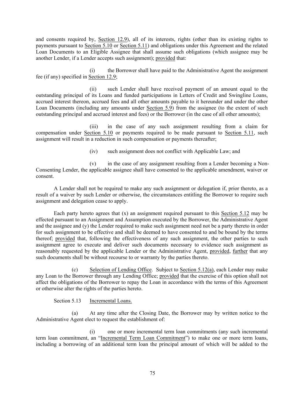 and consents required by, Section 12.9), all of its interests, rights (other than its existing rights topayments pursuant to Section 5.10 or Section 5.11) and obligations under this Agreement and the relatedLoan Documents to an Eligible Assignee that shall assume such obligations (which assignee may beanother Lender, if a Lender accepts such assignment); provided that:(i) the Borrower shall have paid to the Administrative Agent the assignmentfee (if any) specified in Section 12.9;(ii) such Lender shall have received payment of an amount equal to theoutstanding principal of its Loans and funded participations in Letters of Credit and Swingline Loans,accrued interest thereon, accrued fees and all other amounts payable to it hereunder and under the otherLoan Documents (including any amounts under Section 5.9) from the assignee (to the extent of suchoutstanding principal and accrued interest and fees) or the Borrower (in the case of all other amounts);(iii) in the case of any such assignment resulting from a claim forcompensation under Section 5.10 or payments required to be made pursuant to Section 5.11, suchassignment will result in a reduction in such compensation or payments thereafter;(iv) such assignment does not conflict with Applicable Law; and(v) in the case of any assignment resulting from a Lender becoming a Non-Consenting Lender, the applicable assignee shall have consented to the applicable amendment, waiver orconsent.A Lender shall not be required to make any such assignment or delegation if, prior thereto, as aresult of a waiver by such Lender or otherwise, the circumstances entitling the Borrower to require suchassignment and delegation cease to apply.Each party hereto agrees that (x) an assignment required pursuant to this Section 5.12 may beeffected pursuant to an Assignment and Assumption executed by the Borrower, the Administrative Agentand the assignee and (y) the Lender required to make such assignment need not be a party thereto in orderfor such assignment to be effective and shall be deemed to have consented to and be bound by the termsthereof; provided that, following the effectiveness of any such assignment, the other parties to suchassignment agree to execute and deliver such documents necessary to evidence such assignment asreasonably requested by the applicable Lender or the Administrative Agent, provided, further that anysuch documents shall be without recourse to or warranty by the parties thereto.(c) Selection of Lending Office. Subject to Section 5.12(a), each Lender may makeany Loan to the Borrower through any Lending Office; provided that the exercise of this option shall notaffect the obligations of the Borrower to repay the Loan in accordance with the terms of this Agreementor otherwise alter the rights of the parties hereto.Section 5.13 Incremental Loans.(a) At any time after the Closing Date, the Borrower may by written notice to theAdministrative Agent elect to request the establishment of:(i) one or more incremental term loan commitments (any such incrementalterm loan commitment, an “Incremental Term Loan Commitment”) to make one or more term loans,including a borrowing of an additional term loan the principal amount of which will be added to the75