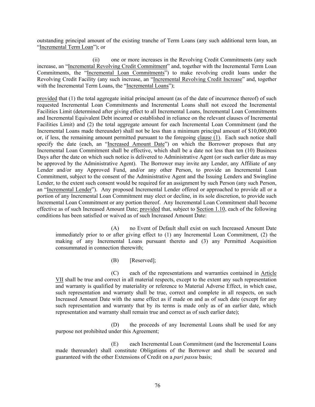 outstanding principal amount of the existing tranche of Term Loans (any such additional term loan, an“Incremental Term Loan”); or(ii) one or more increases in the Revolving Credit Commitments (any suchincrease, an “Incremental Revolving Credit Commitment” and, together with the Incremental Term LoanCommitments, the “Incremental Loan Commitments”) to make revolving credit loans under theRevolving Credit Facility (any such increase, an “Incremental Revolving Credit Increase” and, togetherwith the Incremental Term Loans, the “Incremental Loans”);provided that (1) the total aggregate initial principal amount (as of the date of incurrence thereof) of suchrequested Incremental Loan Commitments and Incremental Loans shall not exceed the IncrementalFacilities Limit (determined after giving effect to all Incremental Loans, Incremental Loan Commitmentsand Incremental Equivalent Debt incurred or established in reliance on the relevant clauses of IncrementalFacilities Limit) and (2) the total aggregate amount for each Incremental Loan Commitment (and theIncremental Loans made thereunder) shall not be less than a minimum principal amount of $10,000,000or, if less, the remaining amount permitted pursuant to the foregoing clause (1). Each such notice shallspecify the date (each, an “Increased Amount Date”) on which the Borrower proposes that anyIncremental Loan Commitment shall be effective, which shall be a date not less than ten (10) BusinessDays after the date on which such notice is delivered to Administrative Agent (or such earlier date as maybe approved by the Administrative Agent). The Borrower may invite any Lender, any Affiliate of anyLender and/or any Approved Fund, and/or any other Person, to provide an Incremental LoanCommitment, subject to the consent of the Administrative Agent and the Issuing Lenders and SwinglineLender, to the extent such consent would be required for an assignment by such Person (any such Person,an “Incremental Lender”). Any proposed Incremental Lender offered or approached to provide all or aportion of any Incremental Loan Commitment may elect or decline, in its sole discretion, to provide suchIncremental Loan Commitment or any portion thereof. Any Incremental Loan Commitment shall becomeeffective as of such Increased Amount Date; provided that, subject to Section 1.10, each of the followingconditions has been satisfied or waived as of such Increased Amount Date:(A) no Event of Default shall exist on such Increased Amount Dateimmediately prior to or after giving effect to (1) any Incremental Loan Commitment, (2) themaking of any Incremental Loans pursuant thereto and (3) any Permitted Acquisitionconsummated in connection therewith;(B) [Reserved];(C) each of the representations and warranties contained in ArticleVII shall be true and correct in all material respects, except to the extent any such representationand warranty is qualified by materiality or reference to Material Adverse Effect, in which case,such representation and warranty shall be true, correct and complete in all respects, on suchIncreased Amount Date with the same effect as if made on and as of such date (except for anysuch representation and warranty that by its terms is made only as of an earlier date, whichrepresentation and warranty shall remain true and correct as of such earlier date);(D) the proceeds of any Incremental Loans shall be used for anypurpose not prohibited under this Agreement;(E) each Incremental Loan Commitment (and the Incremental Loansmade thereunder) shall constitute Obligations of the Borrower and shall be secured andguaranteed with the other Extensions of Credit on a pari passu basis;76