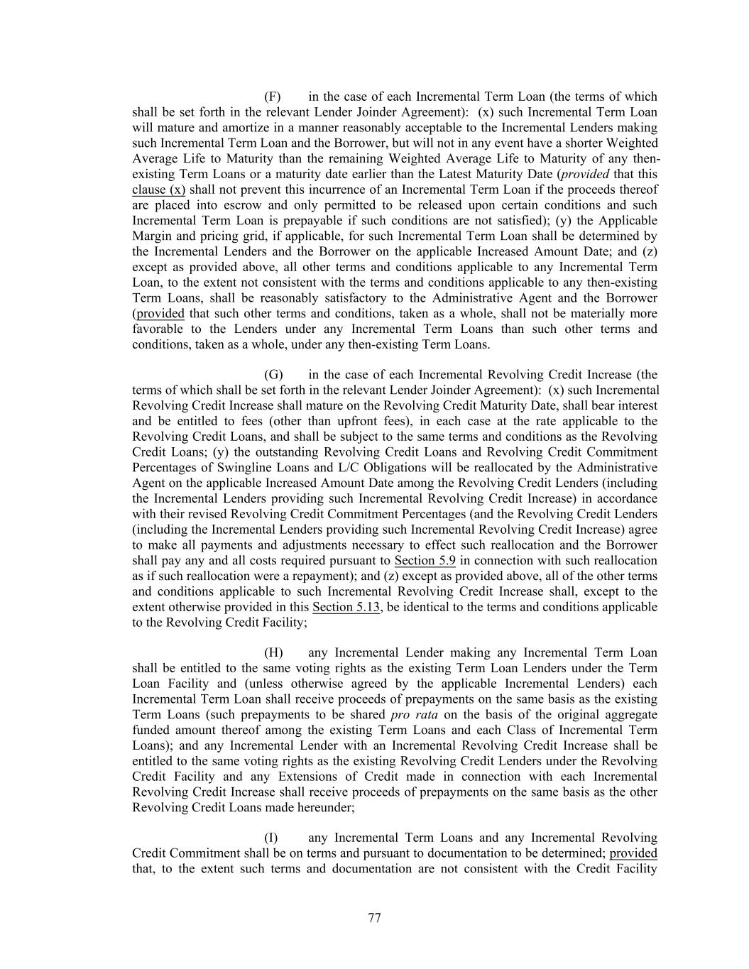 (F) in the case of each Incremental Term Loan (the terms of whichshall be set forth in the relevant Lender Joinder Agreement): (x) such Incremental Term Loanwill mature and amortize in a manner reasonably acceptable to the Incremental Lenders makingsuch Incremental Term Loan and the Borrower, but will not in any event have a shorter WeightedAverage Life to Maturity than the remaining Weighted Average Life to Maturity of any then-existing Term Loans or a maturity date earlier than the Latest Maturity Date (provided that thisclause (x) shall not prevent this incurrence of an Incremental Term Loan if the proceeds thereofare placed into escrow and only permitted to be released upon certain conditions and suchIncremental Term Loan is prepayable if such conditions are not satisfied); (y) the ApplicableMargin and pricing grid, if applicable, for such Incremental Term Loan shall be determined bythe Incremental Lenders and the Borrower on the applicable Increased Amount Date; and (z)except as provided above, all other terms and conditions applicable to any Incremental TermLoan, to the extent not consistent with the terms and conditions applicable to any then-existingTerm Loans, shall be reasonably satisfactory to the Administrative Agent and the Borrower(provided that such other terms and conditions, taken as a whole, shall not be materially morefavorable to the Lenders under any Incremental Term Loans than such other terms andconditions, taken as a whole, under any then-existing Term Loans.(G) in the case of each Incremental Revolving Credit Increase (theterms of which shall be set forth in the relevant Lender Joinder Agreement): (x) such IncrementalRevolving Credit Increase shall mature on the Revolving Credit Maturity Date, shall bear interestand be entitled to fees (other than upfront fees), in each case at the rate applicable to theRevolving Credit Loans, and shall be subject to the same terms and conditions as the RevolvingCredit Loans; (y) the outstanding Revolving Credit Loans and Revolving Credit CommitmentPercentages of Swingline Loans and L/C Obligations will be reallocated by the AdministrativeAgent on the applicable Increased Amount Date among the Revolving Credit Lenders (includingthe Incremental Lenders providing such Incremental Revolving Credit Increase) in accordancewith their revised Revolving Credit Commitment Percentages (and the Revolving Credit Lenders(including the Incremental Lenders providing such Incremental Revolving Credit Increase) agreeto make all payments and adjustments necessary to effect such reallocation and the Borrowershall pay any and all costs required pursuant to Section 5.9 in connection with such reallocationas if such reallocation were a repayment); and (z) except as provided above, all of the other termsand conditions applicable to such Incremental Revolving Credit Increase shall, except to theextent otherwise provided in this Section 5.13, be identical to the terms and conditions applicableto the Revolving Credit Facility;(H) any Incremental Lender making any Incremental Term Loanshall be entitled to the same voting rights as the existing Term Loan Lenders under the TermLoan Facility and (unless otherwise agreed by the applicable Incremental Lenders) eachIncremental Term Loan shall receive proceeds of prepayments on the same basis as the existingTerm Loans (such prepayments to be shared pro rata on the basis of the original aggregatefunded amount thereof among the existing Term Loans and each Class of Incremental TermLoans); and any Incremental Lender with an Incremental Revolving Credit Increase shall beentitled to the same voting rights as the existing Revolving Credit Lenders under the RevolvingCredit Facility and any Extensions of Credit made in connection with each IncrementalRevolving Credit Increase shall receive proceeds of prepayments on the same basis as the otherRevolving Credit Loans made hereunder;(I) any Incremental Term Loans and any Incremental RevolvingCredit Commitment shall be on terms and pursuant to documentation to be determined; providedthat, to the extent such terms and documentation are not consistent with the Credit Facility77