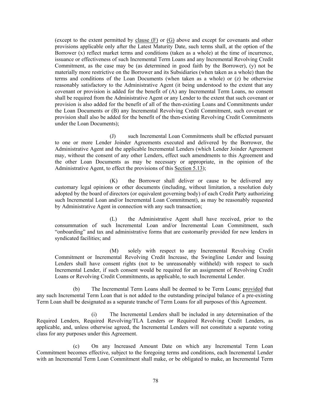 (except to the extent permitted by clause (F) or (G) above and except for covenants and otherprovisions applicable only after the Latest Maturity Date, such terms shall, at the option of theBorrower (x) reflect market terms and conditions (taken as a whole) at the time of incurrence,issuance or effectiveness of such Incremental Term Loans and any Incremental Revolving CreditCommitment, as the case may be (as determined in good faith by the Borrower), (y) not bematerially more restrictive on the Borrower and its Subsidiaries (when taken as a whole) than theterms and conditions of the Loan Documents (when taken as a whole) or (z) be otherwisereasonably satisfactory to the Administrative Agent (it being understood to the extent that anycovenant or provision is added for the benefit of (A) any Incremental Term Loans, no consentshall be required from the Administrative Agent or any Lender to the extent that such covenant orprovision is also added for the benefit of all of the then-existing Loans and Commitments underthe Loan Documents or (B) any Incremental Revolving Credit Commitment, such covenant orprovision shall also be added for the benefit of the then-existing Revolving Credit Commitmentsunder the Loan Documents);(J) such Incremental Loan Commitments shall be effected pursuantto one or more Lender Joinder Agreements executed and delivered by the Borrower, theAdministrative Agent and the applicable Incremental Lenders (which Lender Joinder Agreementmay, without the consent of any other Lenders, effect such amendments to this Agreement andthe other Loan Documents as may be necessary or appropriate, in the opinion of theAdministrative Agent, to effect the provisions of this Section 5.13);(K) the Borrower shall deliver or cause to be delivered anycustomary legal opinions or other documents (including, without limitation, a resolution dulyadopted by the board of directors (or equivalent governing body) of each Credit Party authorizingsuch Incremental Loan and/or Incremental Loan Commitment), as may be reasonably requestedby Administrative Agent in connection with any such transaction;(L) the Administrative Agent shall have received, prior to theconsummation of such Incremental Loan and/or Incremental Loan Commitment, such“onboarding” and tax and administrative forms that are customarily provided for new lenders insyndicated facilities; and(M) solely with respect to any Incremental Revolving CreditCommitment or Incremental Revolving Credit Increase, the Swingline Lender and IssuingLenders shall have consent rights (not to be unreasonably withheld) with respect to suchIncremental Lender, if such consent would be required for an assignment of Revolving CreditLoans or Revolving Credit Commitments, as applicable, to such Incremental Lender.(b) The Incremental Term Loans shall be deemed to be Term Loans; provided thatany such Incremental Term Loan that is not added to the outstanding principal balance of a pre-existingTerm Loan shall be designated as a separate tranche of Term Loans for all purposes of this Agreement.(i) The Incremental Lenders shall be included in any determination of theRequired Lenders, Required Revolving/TLA Lenders or Required Revolving Credit Lenders, asapplicable, and, unless otherwise agreed, the Incremental Lenders will not constitute a separate votingclass for any purposes under this Agreement.(c) On any Increased Amount Date on which any Incremental Term LoanCommitment becomes effective, subject to the foregoing terms and conditions, each Incremental Lenderwith an Incremental Term Loan Commitment shall make, or be obligated to make, an Incremental Term78