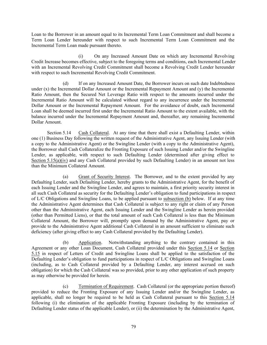 Loan to the Borrower in an amount equal to its Incremental Term Loan Commitment and shall become aTerm Loan Lender hereunder with respect to such Incremental Term Loan Commitment and theIncremental Term Loan made pursuant thereto.(i) On any Increased Amount Date on which any Incremental RevolvingCredit Increase becomes effective, subject to the foregoing terms and conditions, each Incremental Lenderwith an Incremental Revolving Credit Commitment shall become a Revolving Credit Lender hereunderwith respect to such Incremental Revolving Credit Commitment.(d) If on any Increased Amount Date, the Borrower incurs on such date Indebtednessunder (x) the Incremental Dollar Amount or the Incremental Repayment Amount and (y) the IncrementalRatio Amount, then the Secured Net Leverage Ratio with respect to the amounts incurred under theIncremental Ratio Amount will be calculated without regard to any incurrence under the IncrementalDollar Amount or the Incremental Repayment Amount. For the avoidance of doubt, each IncrementalLoan shall be deemed incurred first under the Incremental Ratio Amount to the extent available, with thebalance incurred under the Incremental Repayment Amount and, thereafter, any remaining IncrementalDollar Amount.Section 5.14 Cash Collateral. At any time that there shall exist a Defaulting Lender, withinone (1) Business Day following the written request of the Administrative Agent, any Issuing Lender (witha copy to the Administrative Agent) or the Swingline Lender (with a copy to the Administrative Agent),the Borrower shall Cash Collateralize the Fronting Exposure of such Issuing Lender and/or the SwinglineLender, as applicable, with respect to such Defaulting Lender (determined after giving effect toSection 5.15(a)(iv) and any Cash Collateral provided by such Defaulting Lender) in an amount not lessthan the Minimum Collateral Amount.(a) Grant of Security Interest. The Borrower, and to the extent provided by anyDefaulting Lender, such Defaulting Lender, hereby grants to the Administrative Agent, for the benefit ofeach Issuing Lender and the Swingline Lender, and agrees to maintain, a first priority security interest inall such Cash Collateral as security for the Defaulting Lender’s obligation to fund participations in respectof L/C Obligations and Swingline Loans, to be applied pursuant to subsection (b) below. If at any timethe Administrative Agent determines that Cash Collateral is subject to any right or claim of any Personother than the Administrative Agent, each Issuing Lender and the Swingline Lender as herein provided(other than Permitted Liens), or that the total amount of such Cash Collateral is less than the MinimumCollateral Amount, the Borrower will, promptly upon demand by the Administrative Agent, pay orprovide to the Administrative Agent additional Cash Collateral in an amount sufficient to eliminate suchdeficiency (after giving effect to any Cash Collateral provided by the Defaulting Lender).(b) Application. Notwithstanding anything to the contrary contained in thisAgreement or any other Loan Document, Cash Collateral provided under this Section 5.14 or Section5.15 in respect of Letters of Credit and Swingline Loans shall be applied to the satisfaction of theDefaulting Lender’s obligation to fund participations in respect of L/C Obligations and Swingline Loans(including, as to Cash Collateral provided by a Defaulting Lender, any interest accrued on suchobligation) for which the Cash Collateral was so provided, prior to any other application of such propertyas may otherwise be provided for herein.(c) Termination of Requirement. Cash Collateral (or the appropriate portion thereof)provided to reduce the Fronting Exposure of any Issuing Lender and/or the Swingline Lender, asapplicable, shall no longer be required to be held as Cash Collateral pursuant to this Section 5.14following (i) the elimination of the applicable Fronting Exposure (including by the termination ofDefaulting Lender status of the applicable Lender), or (ii) the determination by the Administrative Agent,79