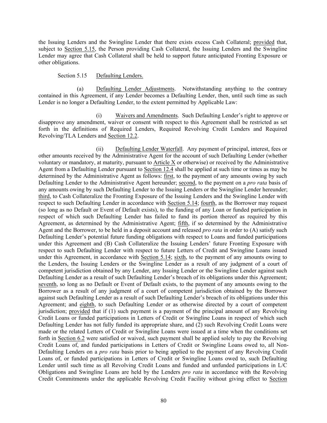 the Issuing Lenders and the Swingline Lender that there exists excess Cash Collateral; provided that,subject to Section 5.15, the Person providing Cash Collateral, the Issuing Lenders and the SwinglineLender may agree that Cash Collateral shall be held to support future anticipated Fronting Exposure orother obligations.Section 5.15 Defaulting Lenders.(a) Defaulting Lender Adjustments. Notwithstanding anything to the contrarycontained in this Agreement, if any Lender becomes a Defaulting Lender, then, until such time as suchLender is no longer a Defaulting Lender, to the extent permitted by Applicable Law:(i) Waivers and Amendments. Such Defaulting Lender’s right to approve ordisapprove any amendment, waiver or consent with respect to this Agreement shall be restricted as setforth in the definitions of Required Lenders, Required Revolving Credit Lenders and RequiredRevolving/TLA Lenders and Section 12.2.(ii) Defaulting Lender Waterfall. Any payment of principal, interest, fees orother amounts received by the Administrative Agent for the account of such Defaulting Lender (whethervoluntary or mandatory, at maturity, pursuant to Article X or otherwise) or received by the AdministrativeAgent from a Defaulting Lender pursuant to Section 12.4 shall be applied at such time or times as may bedetermined by the Administrative Agent as follows: first, to the payment of any amounts owing by suchDefaulting Lender to the Administrative Agent hereunder; second, to the payment on a pro rata basis ofany amounts owing by such Defaulting Lender to the Issuing Lenders or the Swingline Lender hereunder;third, to Cash Collateralize the Fronting Exposure of the Issuing Lenders and the Swingline Lender withrespect to such Defaulting Lender in accordance with Section 5.14; fourth, as the Borrower may request(so long as no Default or Event of Default exists), to the funding of any Loan or funded participation inrespect of which such Defaulting Lender has failed to fund its portion thereof as required by thisAgreement, as determined by the Administrative Agent; fifth, if so determined by the AdministrativeAgent and the Borrower, to be held in a deposit account and released pro rata in order to (A) satisfy suchDefaulting Lender’s potential future funding obligations with respect to Loans and funded participationsunder this Agreement and (B) Cash Collateralize the Issuing Lenders’ future Fronting Exposure withrespect to such Defaulting Lender with respect to future Letters of Credit and Swingline Loans issuedunder this Agreement, in accordance with Section 5.14; sixth, to the payment of any amounts owing tothe Lenders, the Issuing Lenders or the Swingline Lender as a result of any judgment of a court ofcompetent jurisdiction obtained by any Lender, any Issuing Lender or the Swingline Lender against suchDefaulting Lender as a result of such Defaulting Lender’s breach of its obligations under this Agreement;seventh, so long as no Default or Event of Default exists, to the payment of any amounts owing to theBorrower as a result of any judgment of a court of competent jurisdiction obtained by the Borroweragainst such Defaulting Lender as a result of such Defaulting Lender’s breach of its obligations under thisAgreement; and eighth, to such Defaulting Lender or as otherwise directed by a court of competentjurisdiction; provided that if (1) such payment is a payment of the principal amount of any RevolvingCredit Loans or funded participations in Letters of Credit or Swingline Loans in respect of which suchDefaulting Lender has not fully funded its appropriate share, and (2) such Revolving Credit Loans weremade or the related Letters of Credit or Swingline Loans were issued at a time when the conditions setforth in Section 6.2 were satisfied or waived, such payment shall be applied solely to pay the RevolvingCredit Loans of, and funded participations in Letters of Credit or Swingline Loans owed to, all Non-Defaulting Lenders on a pro rata basis prior to being applied to the payment of any Revolving CreditLoans of, or funded participations in Letters of Credit or Swingline Loans owed to, such DefaultingLender until such time as all Revolving Credit Loans and funded and unfunded participations in L/CObligations and Swingline Loans are held by the Lenders pro rata in accordance with the RevolvingCredit Commitments under the applicable Revolving Credit Facility without giving effect to Section80