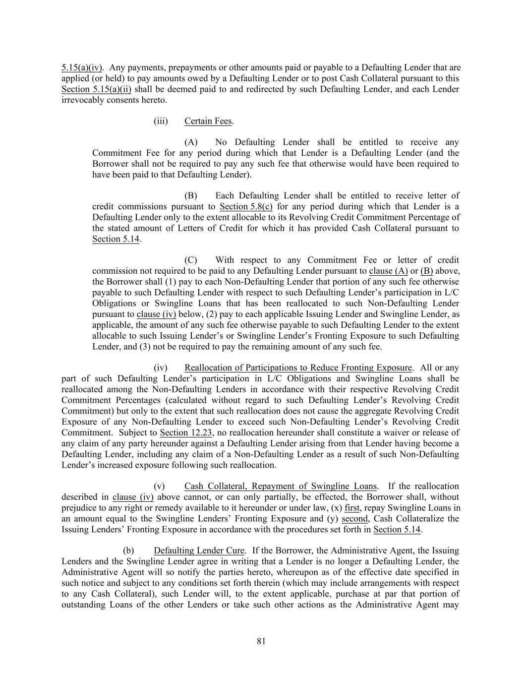 5.15(a)(iv). Any payments, prepayments or other amounts paid or payable to a Defaulting Lender that areapplied (or held) to pay amounts owed by a Defaulting Lender or to post Cash Collateral pursuant to thisSection 5.15(a)(ii) shall be deemed paid to and redirected by such Defaulting Lender, and each Lenderirrevocably consents hereto.(iii) Certain Fees.(A) No Defaulting Lender shall be entitled to receive anyCommitment Fee for any period during which that Lender is a Defaulting Lender (and theBorrower shall not be required to pay any such fee that otherwise would have been required tohave been paid to that Defaulting Lender).(B) Each Defaulting Lender shall be entitled to receive letter ofcredit commissions pursuant to Section 5.8(c) for any period during which that Lender is aDefaulting Lender only to the extent allocable to its Revolving Credit Commitment Percentage ofthe stated amount of Letters of Credit for which it has provided Cash Collateral pursuant toSection 5.14. (C) With respect to any Commitment Fee or letter of creditcommission not required to be paid to any Defaulting Lender pursuant to clause (A) or (B) above,the Borrower shall (1) pay to each Non-Defaulting Lender that portion of any such fee otherwisepayable to such Defaulting Lender with respect to such Defaulting Lender’s participation in L/CObligations or Swingline Loans that has been reallocated to such Non-Defaulting Lenderpursuant to clause (iv) below, (2) pay to each applicable Issuing Lender and Swingline Lender, asapplicable, the amount of any such fee otherwise payable to such Defaulting Lender to the extentallocable to such Issuing Lender’s or Swingline Lender’s Fronting Exposure to such DefaultingLender, and (3) not be required to pay the remaining amount of any such fee.(iv) Reallocation of Participations to Reduce Fronting Exposure. All or anypart of such Defaulting Lender’s participation in L/C Obligations and Swingline Loans shall bereallocated among the Non-Defaulting Lenders in accordance with their respective Revolving CreditCommitment Percentages (calculated without regard to such Defaulting Lender’s Revolving CreditCommitment) but only to the extent that such reallocation does not cause the aggregate Revolving CreditExposure of any Non-Defaulting Lender to exceed such Non-Defaulting Lender’s Revolving CreditCommitment. Subject to Section 12.23, no reallocation hereunder shall constitute a waiver or release ofany claim of any party hereunder against a Defaulting Lender arising from that Lender having become aDefaulting Lender, including any claim of a Non-Defaulting Lender as a result of such Non-DefaultingLender’s increased exposure following such reallocation.(v) Cash Collateral, Repayment of Swingline Loans. If the reallocationdescribed in clause (iv) above cannot, or can only partially, be effected, the Borrower shall, withoutprejudice to any right or remedy available to it hereunder or under law, (x) first, repay Swingline Loans inan amount equal to the Swingline Lenders’ Fronting Exposure and (y) second, Cash Collateralize theIssuing Lenders’ Fronting Exposure in accordance with the procedures set forth in Section 5.14.(b) Defaulting Lender Cure. If the Borrower, the Administrative Agent, the IssuingLenders and the Swingline Lender agree in writing that a Lender is no longer a Defaulting Lender, theAdministrative Agent will so notify the parties hereto, whereupon as of the effective date specified insuch notice and subject to any conditions set forth therein (which may include arrangements with respectto any Cash Collateral), such Lender will, to the extent applicable, purchase at par that portion ofoutstanding Loans of the other Lenders or take such other actions as the Administrative Agent may81