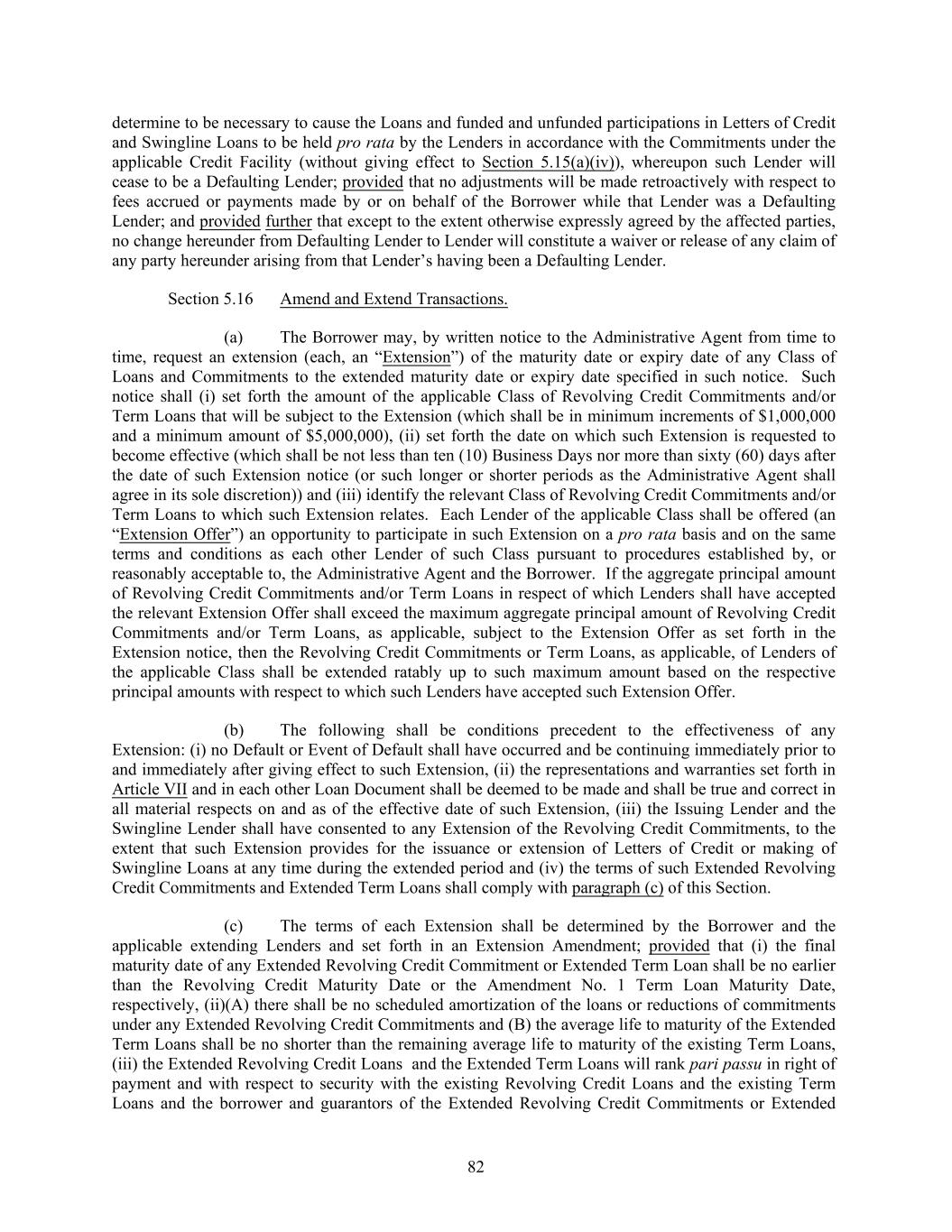determine to be necessary to cause the Loans and funded and unfunded participations in Letters of Creditand Swingline Loans to be held pro rata by the Lenders in accordance with the Commitments under theapplicable Credit Facility (without giving effect to Section 5.15(a)(iv)), whereupon such Lender willcease to be a Defaulting Lender; provided that no adjustments will be made retroactively with respect tofees accrued or payments made by or on behalf of the Borrower while that Lender was a DefaultingLender; and provided further that except to the extent otherwise expressly agreed by the affected parties,no change hereunder from Defaulting Lender to Lender will constitute a waiver or release of any claim ofany party hereunder arising from that Lender’s having been a Defaulting Lender.Section 5.16 Amend and Extend Transactions.(a) The Borrower may, by written notice to the Administrative Agent from time totime, request an extension (each, an “Extension”) of the maturity date or expiry date of any Class ofLoans and Commitments to the extended maturity date or expiry date specified in such notice. Suchnotice shall (i) set forth the amount of the applicable Class of Revolving Credit Commitments and/orTerm Loans that will be subject to the Extension (which shall be in minimum increments of $1,000,000and a minimum amount of $5,000,000), (ii) set forth the date on which such Extension is requested tobecome effective (which shall be not less than ten (10) Business Days nor more than sixty (60) days afterthe date of such Extension notice (or such longer or shorter periods as the Administrative Agent shallagree in its sole discretion)) and (iii) identify the relevant Class of Revolving Credit Commitments and/orTerm Loans to which such Extension relates. Each Lender of the applicable Class shall be offered (an“Extension Offer”) an opportunity to participate in such Extension on a pro rata basis and on the sameterms and conditions as each other Lender of such Class pursuant to procedures established by, orreasonably acceptable to, the Administrative Agent and the Borrower. If the aggregate principal amountof Revolving Credit Commitments and/or Term Loans in respect of which Lenders shall have acceptedthe relevant Extension Offer shall exceed the maximum aggregate principal amount of Revolving CreditCommitments and/or Term Loans, as applicable, subject to the Extension Offer as set forth in theExtension notice, then the Revolving Credit Commitments or Term Loans, as applicable, of Lenders ofthe applicable Class shall be extended ratably up to such maximum amount based on the respectiveprincipal amounts with respect to which such Lenders have accepted such Extension Offer.(b) The following shall be conditions precedent to the effectiveness of anyExtension: (i) no Default or Event of Default shall have occurred and be continuing immediately prior toand immediately after giving effect to such Extension, (ii) the representations and warranties set forth inArticle VII and in each other Loan Document shall be deemed to be made and shall be true and correct inall material respects on and as of the effective date of such Extension, (iii) the Issuing Lender and theSwingline Lender shall have consented to any Extension of the Revolving Credit Commitments, to theextent that such Extension provides for the issuance or extension of Letters of Credit or making ofSwingline Loans at any time during the extended period and (iv) the terms of such Extended RevolvingCredit Commitments and Extended Term Loans shall comply with paragraph (c) of this Section.(c) The terms of each Extension shall be determined by the Borrower and theapplicable extending Lenders and set forth in an Extension Amendment; provided that (i) the finalmaturity date of any Extended Revolving Credit Commitment or Extended Term Loan shall be no earlierthan the Revolving Credit Maturity Date or the Amendment No. 1 Term Loan Maturity Date,respectively, (ii)(A) there shall be no scheduled amortization of the loans or reductions of commitmentsunder any Extended Revolving Credit Commitments and (B) the average life to maturity of the ExtendedTerm Loans shall be no shorter than the remaining average life to maturity of the existing Term Loans,(iii) the Extended Revolving Credit Loans and the Extended Term Loans will rank pari passu in right ofpayment and with respect to security with the existing Revolving Credit Loans and the existing TermLoans and the borrower and guarantors of the Extended Revolving Credit Commitments or Extended82