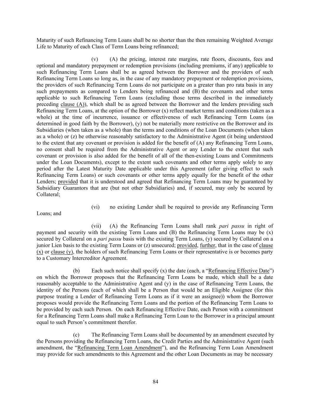 Maturity of such Refinancing Term Loans shall be no shorter than the then remaining Weighted AverageLife to Maturity of each Class of Term Loans being refinanced;(v) (A) the pricing, interest rate margins, rate floors, discounts, fees andoptional and mandatory prepayment or redemption provisions (including premiums, if any) applicable tosuch Refinancing Term Loans shall be as agreed between the Borrower and the providers of suchRefinancing Term Loans so long as, in the case of any mandatory prepayment or redemption provisions,the providers of such Refinancing Term Loans do not participate on a greater than pro rata basis in anysuch prepayments as compared to Lenders being refinanced and (B) the covenants and other termsapplicable to such Refinancing Term Loans (excluding those terms described in the immediatelypreceding clause (A)), which shall be as agreed between the Borrower and the lenders providing suchRefinancing Term Loans, at the option of the Borrower (x) reflect market terms and conditions (taken as awhole) at the time of incurrence, issuance or effectiveness of such Refinancing Term Loans (asdetermined in good faith by the Borrower), (y) not be materially more restrictive on the Borrower and itsSubsidiaries (when taken as a whole) than the terms and conditions of the Loan Documents (when takenas a whole) or (z) be otherwise reasonably satisfactory to the Administrative Agent (it being understoodto the extent that any covenant or provision is added for the benefit of (A) any Refinancing Term Loans,no consent shall be required from the Administrative Agent or any Lender to the extent that suchcovenant or provision is also added for the benefit of all of the then-existing Loans and Commitmentsunder the Loan Documents), except to the extent such covenants and other terms apply solely to anyperiod after the Latest Maturity Date applicable under this Agreement (after giving effect to suchRefinancing Term Loans) or such covenants or other terms apply equally for the benefit of the otherLenders; provided that it is understood and agreed that Refinancing Term Loans may be guaranteed bySubsidiary Guarantors that are (but not other Subsidiaries) and, if secured, may only be secured byCollateral; (vi) no existing Lender shall be required to provide any Refinancing TermLoans; and (vii) (A) the Refinancing Term Loans shall rank pari passu in right ofpayment and security with the existing Term Loans and (B) the Refinancing Term Loans may be (x)secured by Collateral on a pari passu basis with the existing Term Loans, (y) secured by Collateral on ajunior Lien basis to the existing Term Loans or (z) unsecured; provided, further, that in the case of clause(x) or clause (y), the holders of such Refinancing Term Loans or their representative is or becomes partyto a Customary Intercreditor Agreement.(b) Each such notice shall specify (x) the date (each, a “Refinancing Effective Date”)on which the Borrower proposes that the Refinancing Term Loans be made, which shall be a datereasonably acceptable to the Administrative Agent and (y) in the case of Refinancing Term Loans, theidentity of the Persons (each of which shall be a Person that would be an Eligible Assignee (for thispurpose treating a Lender of Refinancing Term Loans as if it were an assignee)) whom the Borrowerproposes would provide the Refinancing Term Loans and the portion of the Refinancing Term Loans tobe provided by each such Person. On each Refinancing Effective Date, each Person with a commitmentfor a Refinancing Term Loans shall make a Refinancing Term Loan to the Borrower in a principal amountequal to such Person’s commitment therefor.(c) The Refinancing Term Loans shall be documented by an amendment executed bythe Persons providing the Refinancing Term Loans, the Credit Parties and the Administrative Agent (suchamendment, the “Refinancing Term Loan Amendment”), and the Refinancing Term Loan Amendmentmay provide for such amendments to this Agreement and the other Loan Documents as may be necessary84