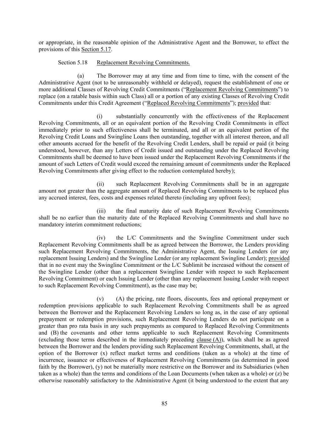 or appropriate, in the reasonable opinion of the Administrative Agent and the Borrower, to effect theprovisions of this Section 5.17.Section 5.18 Replacement Revolving Commitments.(a) The Borrower may at any time and from time to time, with the consent of theAdministrative Agent (not to be unreasonably withheld or delayed), request the establishment of one ormore additional Classes of Revolving Credit Commitments (“Replacement Revolving Commitments”) toreplace (on a ratable basis within such Class) all or a portion of any existing Classes of Revolving CreditCommitments under this Credit Agreement (“Replaced Revolving Commitments”); provided that:(i) substantially concurrently with the effectiveness of the ReplacementRevolving Commitments, all or an equivalent portion of the Revolving Credit Commitments in effectimmediately prior to such effectiveness shall be terminated, and all or an equivalent portion of theRevolving Credit Loans and Swingline Loans then outstanding, together with all interest thereon, and allother amounts accrued for the benefit of the Revolving Credit Lenders, shall be repaid or paid (it beingunderstood, however, than any Letters of Credit issued and outstanding under the Replaced RevolvingCommitments shall be deemed to have been issued under the Replacement Revolving Commitments if theamount of such Letters of Credit would exceed the remaining amount of commitments under the ReplacedRevolving Commitments after giving effect to the reduction contemplated hereby);(ii) such Replacement Revolving Commitments shall be in an aggregateamount not greater than the aggregate amount of Replaced Revolving Commitments to be replaced plusany accrued interest, fees, costs and expenses related thereto (including any upfront fees);(iii) the final maturity date of such Replacement Revolving Commitmentsshall be no earlier than the maturity date of the Replaced Revolving Commitments and shall have nomandatory interim commitment reductions;(iv) the L/C Commitments and the Swingline Commitment under suchReplacement Revolving Commitments shall be as agreed between the Borrower, the Lenders providingsuch Replacement Revolving Commitments, the Administrative Agent, the Issuing Lenders (or anyreplacement Issuing Lenders) and the Swingline Lender (or any replacement Swingline Lender); providedthat in no event may the Swingline Commitment or the L/C Sublimit be increased without the consent ofthe Swingline Lender (other than a replacement Swingline Lender with respect to such ReplacementRevolving Commitment) or each Issuing Lender (other than any replacement Issuing Lender with respectto such Replacement Revolving Commitment), as the case may be;(v) (A) the pricing, rate floors, discounts, fees and optional prepayment orredemption provisions applicable to such Replacement Revolving Commitments shall be as agreedbetween the Borrower and the Replacement Revolving Lenders so long as, in the case of any optionalprepayment or redemption provisions, such Replacement Revolving Lenders do not participate on agreater than pro rata basis in any such prepayments as compared to Replaced Revolving Commitmentsand (B) the covenants and other terms applicable to such Replacement Revolving Commitments(excluding those terms described in the immediately preceding clause (A)), which shall be as agreedbetween the Borrower and the lenders providing such Replacement Revolving Commitments, shall, at theoption of the Borrower (x) reflect market terms and conditions (taken as a whole) at the time ofincurrence, issuance or effectiveness of Replacement Revolving Commitments (as determined in goodfaith by the Borrower), (y) not be materially more restrictive on the Borrower and its Subsidiaries (whentaken as a whole) than the terms and conditions of the Loan Documents (when taken as a whole) or (z) beotherwise reasonably satisfactory to the Administrative Agent (it being understood to the extent that any85