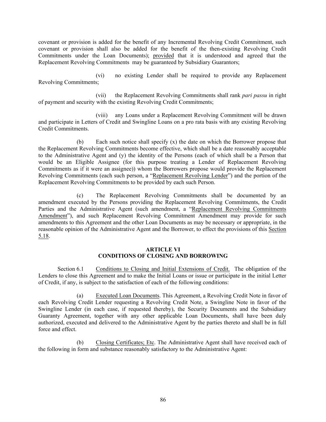 covenant or provision is added for the benefit of any Incremental Revolving Credit Commitment, suchcovenant or provision shall also be added for the benefit of the then-existing Revolving CreditCommitments under the Loan Documents); provided that it is understood and agreed that theReplacement Revolving Commitments may be guaranteed by Subsidiary Guarantors;(vi) no existing Lender shall be required to provide any ReplacementRevolving Commitments;(vii) the Replacement Revolving Commitments shall rank pari passu in rightof payment and security with the existing Revolving Credit Commitments;(viii) any Loans under a Replacement Revolving Commitment will be drawnand participate in Letters of Credit and Swingline Loans on a pro rata basis with any existing RevolvingCredit Commitments.(b) Each such notice shall specify (x) the date on which the Borrower propose thatthe Replacement Revolving Commitments become effective, which shall be a date reasonably acceptableto the Administrative Agent and (y) the identity of the Persons (each of which shall be a Person thatwould be an Eligible Assignee (for this purpose treating a Lender of Replacement RevolvingCommitments as if it were an assignee)) whom the Borrowers propose would provide the ReplacementRevolving Commitments (each such person, a “Replacement Revolving Lender”) and the portion of theReplacement Revolving Commitments to be provided by each such Person.(c) The Replacement Revolving Commitments shall be documented by anamendment executed by the Persons providing the Replacement Revolving Commitments, the CreditParties and the Administrative Agent (such amendment, a “Replacement Revolving CommitmentsAmendment”), and such Replacement Revolving Commitment Amendment may provide for suchamendments to this Agreement and the other Loan Documents as may be necessary or appropriate, in thereasonable opinion of the Administrative Agent and the Borrower, to effect the provisions of this Section5.18. ARTICLE VICONDITIONS OF CLOSING AND BORROWINGSection 6.1 Conditions to Closing and Initial Extensions of Credit. The obligation of theLenders to close this Agreement and to make the Initial Loans or issue or participate in the initial Letterof Credit, if any, is subject to the satisfaction of each of the following conditions:(a) Executed Loan Documents. This Agreement, a Revolving Credit Note in favor ofeach Revolving Credit Lender requesting a Revolving Credit Note, a Swingline Note in favor of theSwingline Lender (in each case, if requested thereby), the Security Documents and the SubsidiaryGuaranty Agreement, together with any other applicable Loan Documents, shall have been dulyauthorized, executed and delivered to the Administrative Agent by the parties thereto and shall be in fullforce and effect.(b) Closing Certificates; Etc. The Administrative Agent shall have received each ofthe following in form and substance reasonably satisfactory to the Administrative Agent:86