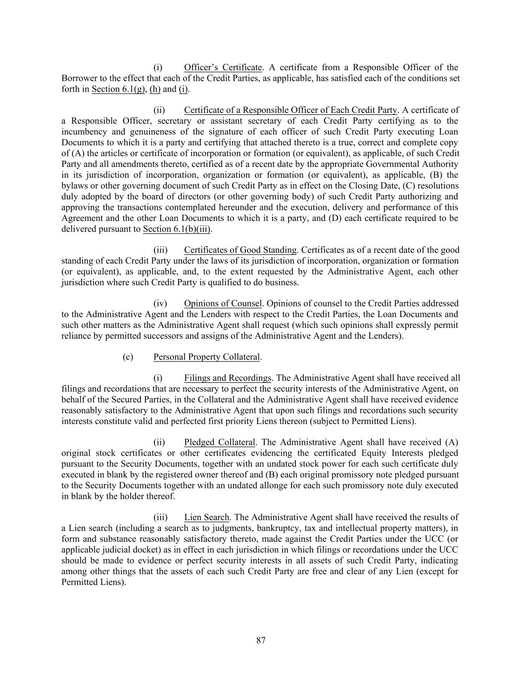 (i) Officer’s Certificate. A certificate from a Responsible Officer of theBorrower to the effect that each of the Credit Parties, as applicable, has satisfied each of the conditions setforth in Section 6.1(g), (h) and (i).(ii) Certificate of a Responsible Officer of Each Credit Party. A certificate ofa Responsible Officer, secretary or assistant secretary of each Credit Party certifying as to theincumbency and genuineness of the signature of each officer of such Credit Party executing LoanDocuments to which it is a party and certifying that attached thereto is a true, correct and complete copyof (A) the articles or certificate of incorporation or formation (or equivalent), as applicable, of such CreditParty and all amendments thereto, certified as of a recent date by the appropriate Governmental Authorityin its jurisdiction of incorporation, organization or formation (or equivalent), as applicable, (B) thebylaws or other governing document of such Credit Party as in effect on the Closing Date, (C) resolutionsduly adopted by the board of directors (or other governing body) of such Credit Party authorizing andapproving the transactions contemplated hereunder and the execution, delivery and performance of thisAgreement and the other Loan Documents to which it is a party, and (D) each certificate required to bedelivered pursuant to Section 6.1(b)(iii).(iii) Certificates of Good Standing. Certificates as of a recent date of the goodstanding of each Credit Party under the laws of its jurisdiction of incorporation, organization or formation(or equivalent), as applicable, and, to the extent requested by the Administrative Agent, each otherjurisdiction where such Credit Party is qualified to do business.(iv) Opinions of Counsel. Opinions of counsel to the Credit Parties addressedto the Administrative Agent and the Lenders with respect to the Credit Parties, the Loan Documents andsuch other matters as the Administrative Agent shall request (which such opinions shall expressly permitreliance by permitted successors and assigns of the Administrative Agent and the Lenders).(c) Personal Property Collateral.(i) Filings and Recordings. The Administrative Agent shall have received allfilings and recordations that are necessary to perfect the security interests of the Administrative Agent, onbehalf of the Secured Parties, in the Collateral and the Administrative Agent shall have received evidencereasonably satisfactory to the Administrative Agent that upon such filings and recordations such securityinterests constitute valid and perfected first priority Liens thereon (subject to Permitted Liens).(ii) Pledged Collateral. The Administrative Agent shall have received (A)original stock certificates or other certificates evidencing the certificated Equity Interests pledgedpursuant to the Security Documents, together with an undated stock power for each such certificate dulyexecuted in blank by the registered owner thereof and (B) each original promissory note pledged pursuantto the Security Documents together with an undated allonge for each such promissory note duly executedin blank by the holder thereof.(iii) Lien Search. The Administrative Agent shall have received the results ofa Lien search (including a search as to judgments, bankruptcy, tax and intellectual property matters), inform and substance reasonably satisfactory thereto, made against the Credit Parties under the UCC (orapplicable judicial docket) as in effect in each jurisdiction in which filings or recordations under the UCCshould be made to evidence or perfect security interests in all assets of such Credit Party, indicatingamong other things that the assets of each such Credit Party are free and clear of any Lien (except forPermitted Liens). 87