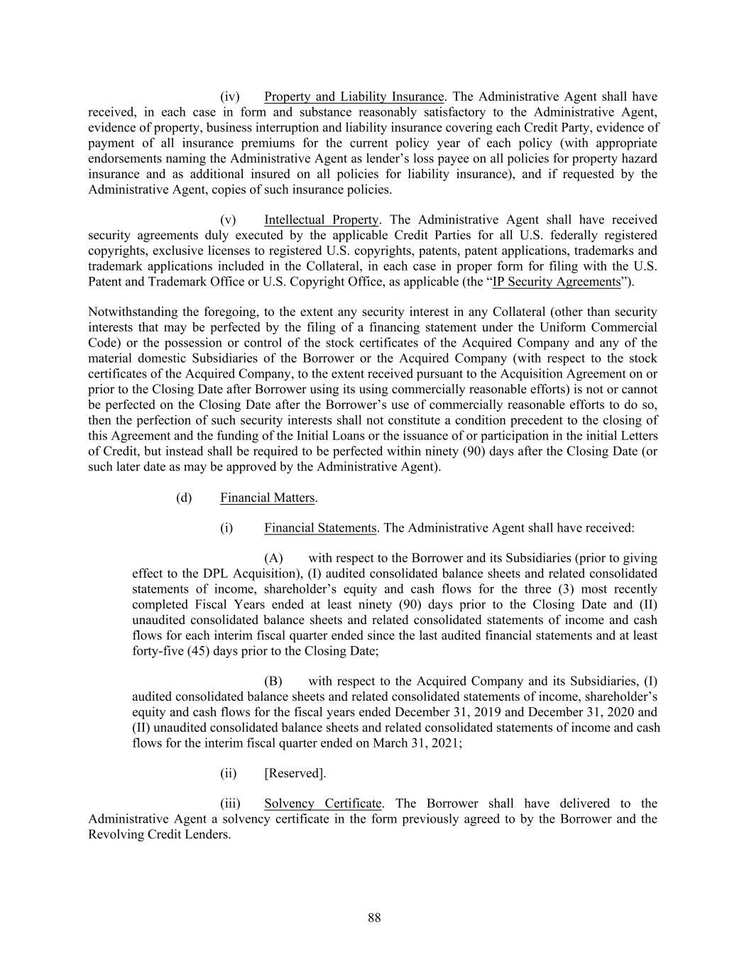 (iv) Property and Liability Insurance. The Administrative Agent shall havereceived, in each case in form and substance reasonably satisfactory to the Administrative Agent,evidence of property, business interruption and liability insurance covering each Credit Party, evidence ofpayment of all insurance premiums for the current policy year of each policy (with appropriateendorsements naming the Administrative Agent as lender’s loss payee on all policies for property hazardinsurance and as additional insured on all policies for liability insurance), and if requested by theAdministrative Agent, copies of such insurance policies.(v) Intellectual Property. The Administrative Agent shall have receivedsecurity agreements duly executed by the applicable Credit Parties for all U.S. federally registeredcopyrights, exclusive licenses to registered U.S. copyrights, patents, patent applications, trademarks andtrademark applications included in the Collateral, in each case in proper form for filing with the U.S.Patent and Trademark Office or U.S. Copyright Office, as applicable (the “IP Security Agreements”).Notwithstanding the foregoing, to the extent any security interest in any Collateral (other than securityinterests that may be perfected by the filing of a financing statement under the Uniform CommercialCode) or the possession or control of the stock certificates of the Acquired Company and any of thematerial domestic Subsidiaries of the Borrower or the Acquired Company (with respect to the stockcertificates of the Acquired Company, to the extent received pursuant to the Acquisition Agreement on orprior to the Closing Date after Borrower using its using commercially reasonable efforts) is not or cannotbe perfected on the Closing Date after the Borrower’s use of commercially reasonable efforts to do so,then the perfection of such security interests shall not constitute a condition precedent to the closing ofthis Agreement and the funding of the Initial Loans or the issuance of or participation in the initial Lettersof Credit, but instead shall be required to be perfected within ninety (90) days after the Closing Date (orsuch later date as may be approved by the Administrative Agent).(d) Financial Matters.(i) Financial Statements. The Administrative Agent shall have received:(A) with respect to the Borrower and its Subsidiaries (prior to givingeffect to the DPL Acquisition), (I) audited consolidated balance sheets and related consolidatedstatements of income, shareholder’s equity and cash flows for the three (3) most recentlycompleted Fiscal Years ended at least ninety (90) days prior to the Closing Date and (II)unaudited consolidated balance sheets and related consolidated statements of income and cashflows for each interim fiscal quarter ended since the last audited financial statements and at leastforty-five (45) days prior to the Closing Date;(B) with respect to the Acquired Company and its Subsidiaries, (I)audited consolidated balance sheets and related consolidated statements of income, shareholder’sequity and cash flows for the fiscal years ended December 31, 2019 and December 31, 2020 and(II) unaudited consolidated balance sheets and related consolidated statements of income and cashflows for the interim fiscal quarter ended on March 31, 2021;(ii) [Reserved].(iii) Solvency Certificate. The Borrower shall have delivered to theAdministrative Agent a solvency certificate in the form previously agreed to by the Borrower and theRevolving Credit Lenders. 88