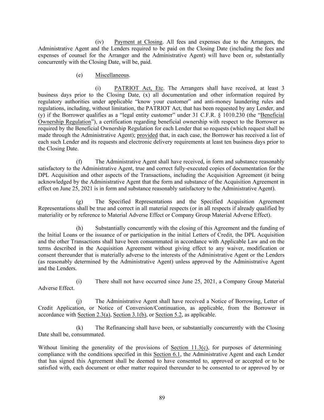 (iv) Payment at Closing. All fees and expenses due to the Arrangers, theAdministrative Agent and the Lenders required to be paid on the Closing Date (including the fees andexpenses of counsel for the Arranger and the Administrative Agent) will have been or, substantiallyconcurrently with the Closing Date, will be, paid.(e) Miscellaneous.(i) PATRIOT Act, Etc. The Arrangers shall have received, at least 3business days prior to the Closing Date, (x) all documentation and other information required byregulatory authorities under applicable “know your customer” and anti-money laundering rules andregulations, including, without limitation, the PATRIOT Act, that has been requested by any Lender, and(y) if the Borrower qualifies as a “legal entity customer” under 31 C.F.R. § 1010.230 (the “BeneficialOwnership Regulation”), a certification regarding beneficial ownership with respect to the Borrower asrequired by the Beneficial Ownership Regulation for each Lender that so requests (which request shall bemade through the Administrative Agent); provided that, in each case, the Borrower has received a list ofeach such Lender and its requests and electronic delivery requirements at least ten business days prior tothe Closing Date.(f) The Administrative Agent shall have received, in form and substance reasonablysatisfactory to the Administrative Agent, true and correct fully-executed copies of documentation for theDPL Acquisition and other aspects of the Transactions, including the Acquisition Agreement (it beingacknowledged by the Administrative Agent that the form and substance of the Acquisition Agreement ineffect on June 25, 2021 is in form and substance reasonably satisfactory to the Administrative Agent).(g) The Specified Representations and the Specified Acquisition AgreementRepresentations shall be true and correct in all material respects (or in all respects if already qualified bymateriality or by reference to Material Adverse Effect or Company Group Material Adverse Effect).(h) Substantially concurrently with the closing of this Agreement and the funding ofthe Initial Loans or the issuance of or participation in the initial Letters of Credit, the DPL Acquisitionand the other Transactions shall have been consummated in accordance with Applicable Law and on theterms described in the Acquisition Agreement without giving effect to any waiver, modification orconsent thereunder that is materially adverse to the interests of the Administrative Agent or the Lenders(as reasonably determined by the Administrative Agent) unless approved by the Administrative Agentand the Lenders.(i) There shall not have occurred since June 25, 2021, a Company Group MaterialAdverse Effect. (j) The Administrative Agent shall have received a Notice of Borrowing, Letter ofCredit Application, or Notice of Conversion/Continuation, as applicable, from the Borrower inaccordance with Section 2.3(a), Section 3.1(b), or Section 5.2, as applicable.(k) The Refinancing shall have been, or substantially concurrently with the ClosingDate shall be, consummated.Without limiting the generality of the provisions of Section 11.3(c), for purposes of determiningcompliance with the conditions specified in this Section 6.1, the Administrative Agent and each Lenderthat has signed this Agreement shall be deemed to have consented to, approved or accepted or to besatisfied with, each document or other matter required thereunder to be consented to or approved by or89