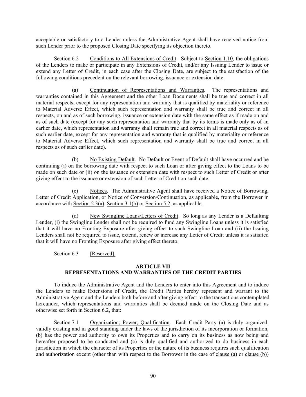 acceptable or satisfactory to a Lender unless the Administrative Agent shall have received notice fromsuch Lender prior to the proposed Closing Date specifying its objection thereto.Section 6.2 Conditions to All Extensions of Credit. Subject to Section 1.10, the obligationsof the Lenders to make or participate in any Extensions of Credit, and/or any Issuing Lender to issue orextend any Letter of Credit, in each case after the Closing Date, are subject to the satisfaction of thefollowing conditions precedent on the relevant borrowing, issuance or extension date:(a) Continuation of Representations and Warranties. The representations andwarranties contained in this Agreement and the other Loan Documents shall be true and correct in allmaterial respects, except for any representation and warranty that is qualified by materiality or referenceto Material Adverse Effect, which such representation and warranty shall be true and correct in allrespects, on and as of such borrowing, issuance or extension date with the same effect as if made on andas of such date (except for any such representation and warranty that by its terms is made only as of anearlier date, which representation and warranty shall remain true and correct in all material respects as ofsuch earlier date, except for any representation and warranty that is qualified by materiality or referenceto Material Adverse Effect, which such representation and warranty shall be true and correct in allrespects as of such earlier date).(b) No Existing Default. No Default or Event of Default shall have occurred and becontinuing (i) on the borrowing date with respect to such Loan or after giving effect to the Loans to bemade on such date or (ii) on the issuance or extension date with respect to such Letter of Credit or aftergiving effect to the issuance or extension of such Letter of Credit on such date.(c) Notices. The Administrative Agent shall have received a Notice of Borrowing,Letter of Credit Application, or Notice of Conversion/Continuation, as applicable, from the Borrower inaccordance with Section 2.3(a), Section 3.1(b) or Section 5.2, as applicable.(d) New Swingline Loans/Letters of Credit. So long as any Lender is a DefaultingLender, (i) the Swingline Lender shall not be required to fund any Swingline Loans unless it is satisfiedthat it will have no Fronting Exposure after giving effect to such Swingline Loan and (ii) the IssuingLenders shall not be required to issue, extend, renew or increase any Letter of Credit unless it is satisfiedthat it will have no Fronting Exposure after giving effect thereto.Section 6.3 [Reserved]. ARTICLE VIIREPRESENTATIONS AND WARRANTIES OF THE CREDIT PARTIESTo induce the Administrative Agent and the Lenders to enter into this Agreement and to inducethe Lenders to make Extensions of Credit, the Credit Parties hereby represent and warrant to theAdministrative Agent and the Lenders both before and after giving effect to the transactions contemplatedhereunder, which representations and warranties shall be deemed made on the Closing Date and asotherwise set forth in Section 6.2, that:Section 7.1 Organization; Power; Qualification. Each Credit Party (a) is duly organized,validly existing and in good standing under the laws of the jurisdiction of its incorporation or formation,(b) has the power and authority to own its Properties and to carry on its business as now being andhereafter proposed to be conducted and (c) is duly qualified and authorized to do business in eachjurisdiction in which the character of its Properties or the nature of its business requires such qualificationand authorization except (other than with respect to the Borrower in the case of clause (a) or clause (b))90