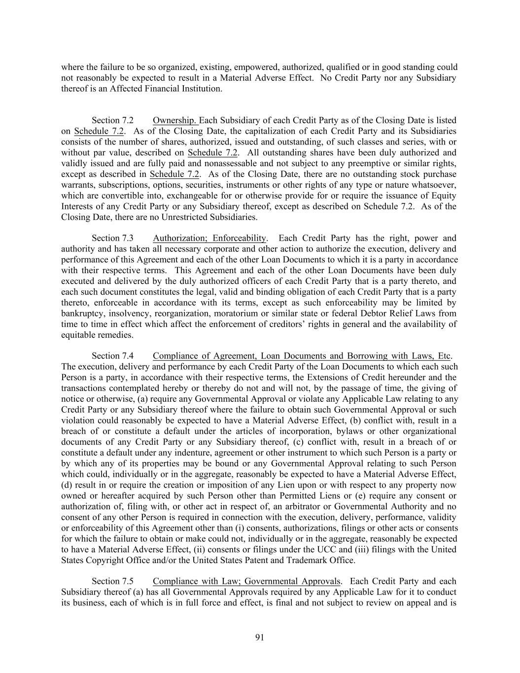 where the failure to be so organized, existing, empowered, authorized, qualified or in good standing couldnot reasonably be expected to result in a Material Adverse Effect. No Credit Party nor any Subsidiarythereof is an Affected Financial Institution.Section 7.2 Ownership. Each Subsidiary of each Credit Party as of the Closing Date is listedon Schedule 7.2. As of the Closing Date, the capitalization of each Credit Party and its Subsidiariesconsists of the number of shares, authorized, issued and outstanding, of such classes and series, with orwithout par value, described on Schedule 7.2. All outstanding shares have been duly authorized andvalidly issued and are fully paid and nonassessable and not subject to any preemptive or similar rights,except as described in Schedule 7.2. As of the Closing Date, there are no outstanding stock purchasewarrants, subscriptions, options, securities, instruments or other rights of any type or nature whatsoever,which are convertible into, exchangeable for or otherwise provide for or require the issuance of EquityInterests of any Credit Party or any Subsidiary thereof, except as described on Schedule 7.2. As of theClosing Date, there are no Unrestricted Subsidiaries.Section 7.3 Authorization; Enforceability. Each Credit Party has the right, power andauthority and has taken all necessary corporate and other action to authorize the execution, delivery andperformance of this Agreement and each of the other Loan Documents to which it is a party in accordancewith their respective terms. This Agreement and each of the other Loan Documents have been dulyexecuted and delivered by the duly authorized officers of each Credit Party that is a party thereto, andeach such document constitutes the legal, valid and binding obligation of each Credit Party that is a partythereto, enforceable in accordance with its terms, except as such enforceability may be limited bybankruptcy, insolvency, reorganization, moratorium or similar state or federal Debtor Relief Laws fromtime to time in effect which affect the enforcement of creditors’ rights in general and the availability ofequitable remedies.Section 7.4 Compliance of Agreement, Loan Documents and Borrowing with Laws, Etc.The execution, delivery and performance by each Credit Party of the Loan Documents to which each suchPerson is a party, in accordance with their respective terms, the Extensions of Credit hereunder and thetransactions contemplated hereby or thereby do not and will not, by the passage of time, the giving ofnotice or otherwise, (a) require any Governmental Approval or violate any Applicable Law relating to anyCredit Party or any Subsidiary thereof where the failure to obtain such Governmental Approval or suchviolation could reasonably be expected to have a Material Adverse Effect, (b) conflict with, result in abreach of or constitute a default under the articles of incorporation, bylaws or other organizationaldocuments of any Credit Party or any Subsidiary thereof, (c) conflict with, result in a breach of orconstitute a default under any indenture, agreement or other instrument to which such Person is a party orby which any of its properties may be bound or any Governmental Approval relating to such Personwhich could, individually or in the aggregate, reasonably be expected to have a Material Adverse Effect,(d) result in or require the creation or imposition of any Lien upon or with respect to any property nowowned or hereafter acquired by such Person other than Permitted Liens or (e) require any consent orauthorization of, filing with, or other act in respect of, an arbitrator or Governmental Authority and noconsent of any other Person is required in connection with the execution, delivery, performance, validityor enforceability of this Agreement other than (i) consents, authorizations, filings or other acts or consentsfor which the failure to obtain or make could not, individually or in the aggregate, reasonably be expectedto have a Material Adverse Effect, (ii) consents or filings under the UCC and (iii) filings with the UnitedStates Copyright Office and/or the United States Patent and Trademark Office.Section 7.5 Compliance with Law; Governmental Approvals. Each Credit Party and eachSubsidiary thereof (a) has all Governmental Approvals required by any Applicable Law for it to conductits business, each of which is in full force and effect, is final and not subject to review on appeal and is91
