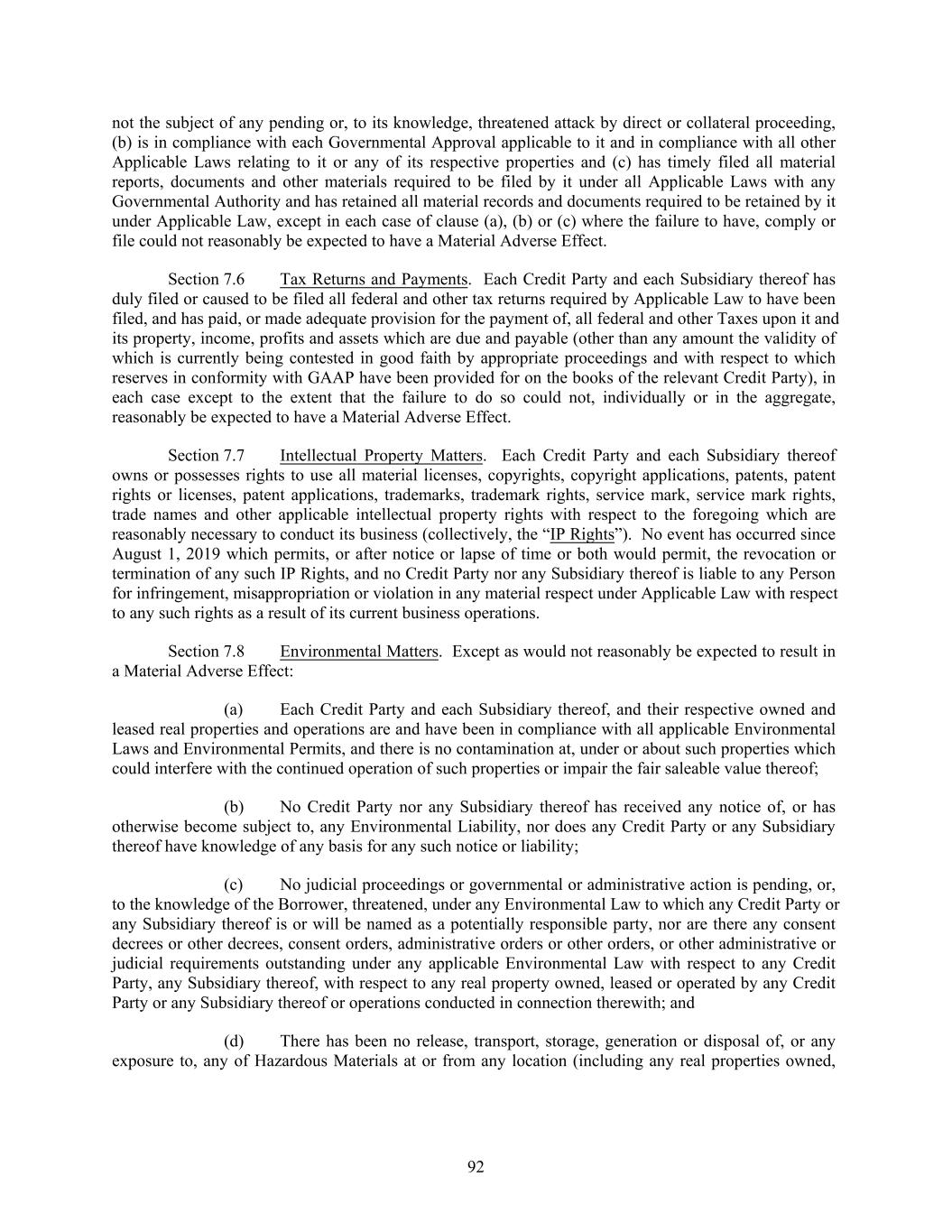 not the subject of any pending or, to its knowledge, threatened attack by direct or collateral proceeding,(b) is in compliance with each Governmental Approval applicable to it and in compliance with all otherApplicable Laws relating to it or any of its respective properties and (c) has timely filed all materialreports, documents and other materials required to be filed by it under all Applicable Laws with anyGovernmental Authority and has retained all material records and documents required to be retained by itunder Applicable Law, except in each case of clause (a), (b) or (c) where the failure to have, comply orfile could not reasonably be expected to have a Material Adverse Effect.Section 7.6 Tax Returns and Payments. Each Credit Party and each Subsidiary thereof hasduly filed or caused to be filed all federal and other tax returns required by Applicable Law to have beenfiled, and has paid, or made adequate provision for the payment of, all federal and other Taxes upon it andits property, income, profits and assets which are due and payable (other than any amount the validity ofwhich is currently being contested in good faith by appropriate proceedings and with respect to whichreserves in conformity with GAAP have been provided for on the books of the relevant Credit Party), ineach case except to the extent that the failure to do so could not, individually or in the aggregate,reasonably be expected to have a Material Adverse Effect.Section 7.7 Intellectual Property Matters. Each Credit Party and each Subsidiary thereofowns or possesses rights to use all material licenses, copyrights, copyright applications, patents, patentrights or licenses, patent applications, trademarks, trademark rights, service mark, service mark rights,trade names and other applicable intellectual property rights with respect to the foregoing which arereasonably necessary to conduct its business (collectively, the “IP Rights”). No event has occurred sinceAugust 1, 2019 which permits, or after notice or lapse of time or both would permit, the revocation ortermination of any such IP Rights, and no Credit Party nor any Subsidiary thereof is liable to any Personfor infringement, misappropriation or violation in any material respect under Applicable Law with respectto any such rights as a result of its current business operations.Section 7.8 Environmental Matters. Except as would not reasonably be expected to result ina Material Adverse Effect:(a) Each Credit Party and each Subsidiary thereof, and their respective owned andleased real properties and operations are and have been in compliance with all applicable EnvironmentalLaws and Environmental Permits, and there is no contamination at, under or about such properties whichcould interfere with the continued operation of such properties or impair the fair saleable value thereof;(b) No Credit Party nor any Subsidiary thereof has received any notice of, or hasotherwise become subject to, any Environmental Liability, nor does any Credit Party or any Subsidiarythereof have knowledge of any basis for any such notice or liability;(c) No judicial proceedings or governmental or administrative action is pending, or,to the knowledge of the Borrower, threatened, under any Environmental Law to which any Credit Party orany Subsidiary thereof is or will be named as a potentially responsible party, nor are there any consentdecrees or other decrees, consent orders, administrative orders or other orders, or other administrative orjudicial requirements outstanding under any applicable Environmental Law with respect to any CreditParty, any Subsidiary thereof, with respect to any real property owned, leased or operated by any CreditParty or any Subsidiary thereof or operations conducted in connection therewith; and(d) There has been no release, transport, storage, generation or disposal of, or anyexposure to, any of Hazardous Materials at or from any location (including any real properties owned,92