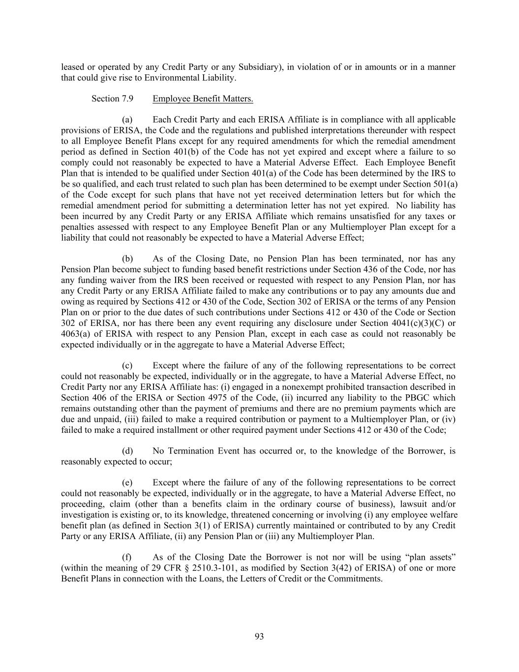 leased or operated by any Credit Party or any Subsidiary), in violation of or in amounts or in a mannerthat could give rise to Environmental Liability.Section 7.9 Employee Benefit Matters.(a) Each Credit Party and each ERISA Affiliate is in compliance with all applicableprovisions of ERISA, the Code and the regulations and published interpretations thereunder with respectto all Employee Benefit Plans except for any required amendments for which the remedial amendmentperiod as defined in Section 401(b) of the Code has not yet expired and except where a failure to socomply could not reasonably be expected to have a Material Adverse Effect. Each Employee BenefitPlan that is intended to be qualified under Section 401(a) of the Code has been determined by the IRS tobe so qualified, and each trust related to such plan has been determined to be exempt under Section 501(a)of the Code except for such plans that have not yet received determination letters but for which theremedial amendment period for submitting a determination letter has not yet expired. No liability hasbeen incurred by any Credit Party or any ERISA Affiliate which remains unsatisfied for any taxes orpenalties assessed with respect to any Employee Benefit Plan or any Multiemployer Plan except for aliability that could not reasonably be expected to have a Material Adverse Effect;(b) As of the Closing Date, no Pension Plan has been terminated, nor has anyPension Plan become subject to funding based benefit restrictions under Section 436 of the Code, nor hasany funding waiver from the IRS been received or requested with respect to any Pension Plan, nor hasany Credit Party or any ERISA Affiliate failed to make any contributions or to pay any amounts due andowing as required by Sections 412 or 430 of the Code, Section 302 of ERISA or the terms of any PensionPlan on or prior to the due dates of such contributions under Sections 412 or 430 of the Code or Section302 of ERISA, nor has there been any event requiring any disclosure under Section 4041(c)(3)(C) or4063(a) of ERISA with respect to any Pension Plan, except in each case as could not reasonably beexpected individually or in the aggregate to have a Material Adverse Effect;(c) Except where the failure of any of the following representations to be correctcould not reasonably be expected, individually or in the aggregate, to have a Material Adverse Effect, noCredit Party nor any ERISA Affiliate has: (i) engaged in a nonexempt prohibited transaction described inSection 406 of the ERISA or Section 4975 of the Code, (ii) incurred any liability to the PBGC whichremains outstanding other than the payment of premiums and there are no premium payments which aredue and unpaid, (iii) failed to make a required contribution or payment to a Multiemployer Plan, or (iv)failed to make a required installment or other required payment under Sections 412 or 430 of the Code;(d) No Termination Event has occurred or, to the knowledge of the Borrower, isreasonably expected to occur;(e) Except where the failure of any of the following representations to be correctcould not reasonably be expected, individually or in the aggregate, to have a Material Adverse Effect, noproceeding, claim (other than a benefits claim in the ordinary course of business), lawsuit and/orinvestigation is existing or, to its knowledge, threatened concerning or involving (i) any employee welfarebenefit plan (as defined in Section 3(1) of ERISA) currently maintained or contributed to by any CreditParty or any ERISA Affiliate, (ii) any Pension Plan or (iii) any Multiemployer Plan.(f) As of the Closing Date the Borrower is not nor will be using “plan assets”(within the meaning of 29 CFR § 2510.3-101, as modified by Section 3(42) of ERISA) of one or moreBenefit Plans in connection with the Loans, the Letters of Credit or the Commitments.93