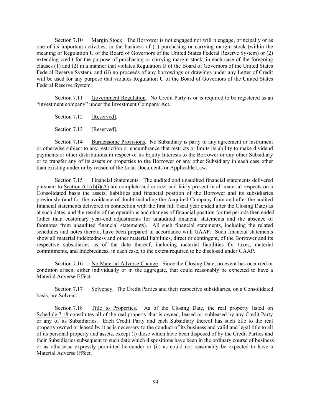 Section 7.10 Margin Stock. The Borrower is not engaged nor will it engage, principally or asone of its important activities, in the business of (1) purchasing or carrying margin stock (within themeaning of Regulation U of the Board of Governors of the United States Federal Reserve System) or (2)extending credit for the purpose of purchasing or carrying margin stock, in each case of the foregoingclauses (1) and (2) in a manner that violates Regulation U of the Board of Governors of the United StatesFederal Reserve System, and (ii) no proceeds of any borrowings or drawings under any Letter of Creditwill be used for any purpose that violates Regulation U of the Board of Governors of the United StatesFederal Reserve System.Section 7.11 Government Regulation. No Credit Party is or is required to be registered as an“investment company” under the Investment Company Act.Section 7.12 [Reserved].Section 7.13 [Reserved].Section 7.14 Burdensome Provisions. No Subsidiary is party to any agreement or instrumentor otherwise subject to any restriction or encumbrance that restricts or limits its ability to make dividendpayments or other distributions in respect of its Equity Interests to the Borrower or any other Subsidiaryor to transfer any of its assets or properties to the Borrower or any other Subsidiary in each case otherthan existing under or by reason of the Loan Documents or Applicable Law.Section 7.15 Financial Statements. The audited and unaudited financial statements deliveredpursuant to Section 6.1(d)(i)(A) are complete and correct and fairly present in all material respects on aConsolidated basis the assets, liabilities and financial position of the Borrower and its subsidiariespreviously (and for the avoidance of doubt including the Acquired Company from and after the auditedfinancial statements delivered in connection with the first full fiscal year ended after the Closing Date) asat such dates, and the results of the operations and changes of financial position for the periods then ended(other than customary year-end adjustments for unaudited financial statements and the absence offootnotes from unaudited financial statements). All such financial statements, including the relatedschedules and notes thereto, have been prepared in accordance with GAAP. Such financial statementsshow all material indebtedness and other material liabilities, direct or contingent, of the Borrower and itsrespective subsidiaries as of the date thereof, including material liabilities for taxes, materialcommitments, and Indebtedness, in each case, to the extent required to be disclosed under GAAP.Section 7.16 No Material Adverse Change. Since the Closing Date, no event has occurred orcondition arisen, either individually or in the aggregate, that could reasonably be expected to have aMaterial Adverse Effect.Section 7.17 Solvency. The Credit Parties and their respective subsidiaries, on a Consolidatedbasis, are Solvent.Section 7.18 Title to Properties. As of the Closing Date, the real property listed onSchedule 7.18 constitutes all of the real property that is owned, leased or, subleased by any Credit Partyor any of its Subsidiaries. Each Credit Party and each Subsidiary thereof has such title to the realproperty owned or leased by it as is necessary to the conduct of its business and valid and legal title to allof its personal property and assets, except (i) those which have been disposed of by the Credit Parties andtheir Subsidiaries subsequent to such date which dispositions have been in the ordinary course of businessor as otherwise expressly permitted hereunder or (ii) as could not reasonably be expected to have aMaterial Adverse Effect. 94
