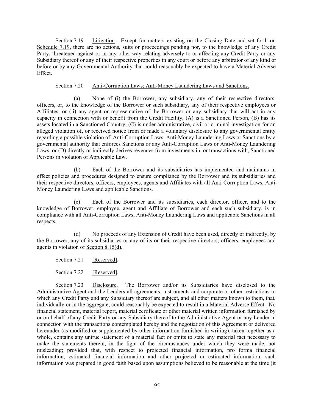 Section 7.19 Litigation. Except for matters existing on the Closing Date and set forth onSchedule 7.19, there are no actions, suits or proceedings pending nor, to the knowledge of any CreditParty, threatened against or in any other way relating adversely to or affecting any Credit Party or anySubsidiary thereof or any of their respective properties in any court or before any arbitrator of any kind orbefore or by any Governmental Authority that could reasonably be expected to have a Material AdverseEffect. Section 7.20 Anti-Corruption Laws; Anti-Money Laundering Laws and Sanctions.(a) None of (i) the Borrower, any subsidiary, any of their respective directors,officers, or, to the knowledge of the Borrower or such subsidiary, any of their respective employees orAffiliates, or (ii) any agent or representative of the Borrower or any subsidiary that will act in anycapacity in connection with or benefit from the Credit Facility, (A) is a Sanctioned Person, (B) has itsassets located in a Sanctioned Country, (C) is under administrative, civil or criminal investigation for analleged violation of, or received notice from or made a voluntary disclosure to any governmental entityregarding a possible violation of, Anti-Corruption Laws, Anti-Money Laundering Laws or Sanctions by agovernmental authority that enforces Sanctions or any Anti-Corruption Laws or Anti-Money LaunderingLaws, or (D) directly or indirectly derives revenues from investments in, or transactions with, SanctionedPersons in violation of Applicable Law.(b) Each of the Borrower and its subsidiaries has implemented and maintains ineffect policies and procedures designed to ensure compliance by the Borrower and its subsidiaries andtheir respective directors, officers, employees, agents and Affiliates with all Anti-Corruption Laws, Anti-Money Laundering Laws and applicable Sanctions.(c) Each of the Borrower and its subsidiaries, each director, officer, and to theknowledge of Borrower, employee, agent and Affiliate of Borrower and each such subsidiary, is incompliance with all Anti-Corruption Laws, Anti-Money Laundering Laws and applicable Sanctions in allrespects. (d) No proceeds of any Extension of Credit have been used, directly or indirectly, bythe Borrower, any of its subsidiaries or any of its or their respective directors, officers, employees andagents in violation of Section 8.15(d).Section 7.21 [Reserved].Section 7.22 [Reserved].Section 7.23 Disclosure. The Borrower and/or its Subsidiaries have disclosed to theAdministrative Agent and the Lenders all agreements, instruments and corporate or other restrictions towhich any Credit Party and any Subsidiary thereof are subject, and all other matters known to them, that,individually or in the aggregate, could reasonably be expected to result in a Material Adverse Effect. Nofinancial statement, material report, material certificate or other material written information furnished byor on behalf of any Credit Party or any Subsidiary thereof to the Administrative Agent or any Lender inconnection with the transactions contemplated hereby and the negotiation of this Agreement or deliveredhereunder (as modified or supplemented by other information furnished in writing), taken together as awhole, contains any untrue statement of a material fact or omits to state any material fact necessary tomake the statements therein, in the light of the circumstances under which they were made, notmisleading; provided that, with respect to projected financial information, pro forma financialinformation, estimated financial information and other projected or estimated information, suchinformation was prepared in good faith based upon assumptions believed to be reasonable at the time (it95