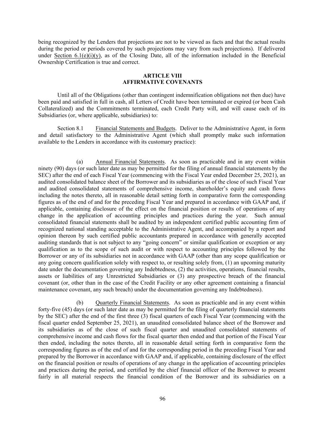 being recognized by the Lenders that projections are not to be viewed as facts and that the actual resultsduring the period or periods covered by such projections may vary from such projections). If deliveredunder Section 6.1(e)(i)(y), as of the Closing Date, all of the information included in the BeneficialOwnership Certification is true and correct. ARTICLE VIIIAFFIRMATIVE COVENANTSUntil all of the Obligations (other than contingent indemnification obligations not then due) havebeen paid and satisfied in full in cash, all Letters of Credit have been terminated or expired (or been CashCollateralized) and the Commitments terminated, each Credit Party will, and will cause each of itsSubsidiaries (or, where applicable, subsidiaries) to:Section 8.1 Financial Statements and Budgets. Deliver to the Administrative Agent, in formand detail satisfactory to the Administrative Agent (which shall promptly make such informationavailable to the Lenders in accordance with its customary practice):(a) Annual Financial Statements. As soon as practicable and in any event withinninety (90) days (or such later date as may be permitted for the filing of annual financial statements by theSEC) after the end of each Fiscal Year (commencing with the Fiscal Year ended December 25, 2021), anaudited consolidated balance sheet of the Borrower and its subsidiaries as of the close of such Fiscal Yearand audited consolidated statements of comprehensive income, shareholder’s equity and cash flowsincluding the notes thereto, all in reasonable detail setting forth in comparative form the correspondingfigures as of the end of and for the preceding Fiscal Year and prepared in accordance with GAAP and, ifapplicable, containing disclosure of the effect on the financial position or results of operations of anychange in the application of accounting principles and practices during the year. Such annualconsolidated financial statements shall be audited by an independent certified public accounting firm ofrecognized national standing acceptable to the Administrative Agent, and accompanied by a report andopinion thereon by such certified public accountants prepared in accordance with generally acceptedauditing standards that is not subject to any “going concern” or similar qualification or exception or anyqualification as to the scope of such audit or with respect to accounting principles followed by theBorrower or any of its subsidiaries not in accordance with GAAP (other than any scope qualification orany going concern qualification solely with respect to, or resulting solely from, (1) an upcoming maturitydate under the documentation governing any Indebtedness, (2) the activities, operations, financial results,assets or liabilities of any Unrestricted Subsidiaries or (3) any prospective breach of the financialcovenant (or, other than in the case of the Credit Facility or any other agreement containing a financialmaintenance covenant, any such breach) under the documentation governing any Indebtedness).(b) Quarterly Financial Statements. As soon as practicable and in any event withinforty-five (45) days (or such later date as may be permitted for the filing of quarterly financial statementsby the SEC) after the end of the first three (3) fiscal quarters of each Fiscal Year (commencing with thefiscal quarter ended September 25, 2021), an unaudited consolidated balance sheet of the Borrower andits subsidiaries as of the close of such fiscal quarter and unaudited consolidated statements ofcomprehensive income and cash flows for the fiscal quarter then ended and that portion of the Fiscal Yearthen ended, including the notes thereto, all in reasonable detail setting forth in comparative form thecorresponding figures as of the end of and for the corresponding period in the preceding Fiscal Year andprepared by the Borrower in accordance with GAAP and, if applicable, containing disclosure of the effecton the financial position or results of operations of any change in the application of accounting principlesand practices during the period, and certified by the chief financial officer of the Borrower to presentfairly in all material respects the financial condition of the Borrower and its subsidiaries on a96