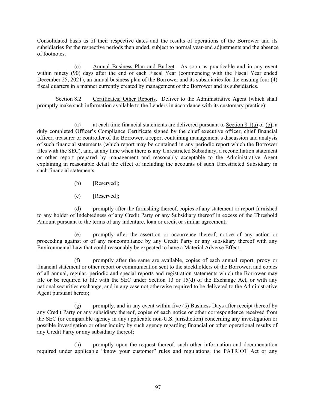 Consolidated basis as of their respective dates and the results of operations of the Borrower and itssubsidiaries for the respective periods then ended, subject to normal year-end adjustments and the absenceof footnotes. (c) Annual Business Plan and Budget. As soon as practicable and in any eventwithin ninety (90) days after the end of each Fiscal Year (commencing with the Fiscal Year endedDecember 25, 2021), an annual business plan of the Borrower and its subsidiaries for the ensuing four (4)fiscal quarters in a manner currently created by management of the Borrower and its subsidiaries.Section 8.2 Certificates; Other Reports. Deliver to the Administrative Agent (which shallpromptly make such information available to the Lenders in accordance with its customary practice):(a) at each time financial statements are delivered pursuant to Section 8.1(a) or (b), aduly completed Officer’s Compliance Certificate signed by the chief executive officer, chief financialofficer, treasurer or controller of the Borrower, a report containing management’s discussion and analysisof such financial statements (which report may be contained in any periodic report which the Borrowerfiles with the SEC), and, at any time when there is any Unrestricted Subsidiary, a reconciliation statementor other report prepared by management and reasonably acceptable to the Administrative Agentexplaining in reasonable detail the effect of including the accounts of such Unrestricted Subsidiary insuch financial statements.(b) [Reserved];(c) [Reserved];(d) promptly after the furnishing thereof, copies of any statement or report furnishedto any holder of Indebtedness of any Credit Party or any Subsidiary thereof in excess of the ThresholdAmount pursuant to the terms of any indenture, loan or credit or similar agreement;(e) promptly after the assertion or occurrence thereof, notice of any action orproceeding against or of any noncompliance by any Credit Party or any subsidiary thereof with anyEnvironmental Law that could reasonably be expected to have a Material Adverse Effect;(f) promptly after the same are available, copies of each annual report, proxy orfinancial statement or other report or communication sent to the stockholders of the Borrower, and copiesof all annual, regular, periodic and special reports and registration statements which the Borrower mayfile or be required to file with the SEC under Section 13 or 15(d) of the Exchange Act, or with anynational securities exchange, and in any case not otherwise required to be delivered to the AdministrativeAgent pursuant hereto;(g) promptly, and in any event within five (5) Business Days after receipt thereof byany Credit Party or any subsidiary thereof, copies of each notice or other correspondence received fromthe SEC (or comparable agency in any applicable non-U.S. jurisdiction) concerning any investigation orpossible investigation or other inquiry by such agency regarding financial or other operational results ofany Credit Party or any subsidiary thereof;(h) promptly upon the request thereof, such other information and documentationrequired under applicable “know your customer” rules and regulations, the PATRIOT Act or any97