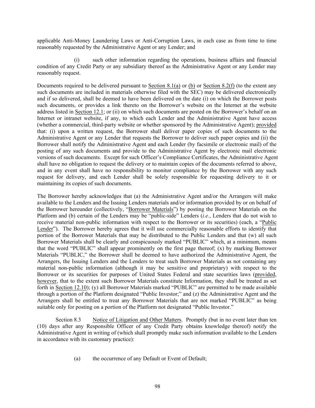 applicable Anti-Money Laundering Laws or Anti-Corruption Laws, in each case as from time to timereasonably requested by the Administrative Agent or any Lender; and(i) such other information regarding the operations, business affairs and financialcondition of any Credit Party or any subsidiary thereof as the Administrative Agent or any Lender mayreasonably request.Documents required to be delivered pursuant to Section 8.1(a) or (b) or Section 8.2(f) (to the extent anysuch documents are included in materials otherwise filed with the SEC) may be delivered electronicallyand if so delivered, shall be deemed to have been delivered on the date (i) on which the Borrower postssuch documents, or provides a link thereto on the Borrower’s website on the Internet at the websiteaddress listed in Section 12.1; or (ii) on which such documents are posted on the Borrower’s behalf on anInternet or intranet website, if any, to which each Lender and the Administrative Agent have access(whether a commercial, third-party website or whether sponsored by the Administrative Agent); providedthat: (i) upon a written request, the Borrower shall deliver paper copies of such documents to theAdministrative Agent or any Lender that requests the Borrower to deliver such paper copies and (ii) theBorrower shall notify the Administrative Agent and each Lender (by facsimile or electronic mail) of theposting of any such documents and provide to the Administrative Agent by electronic mail electronicversions of such documents. Except for such Officer’s Compliance Certificates, the Administrative Agentshall have no obligation to request the delivery or to maintain copies of the documents referred to above,and in any event shall have no responsibility to monitor compliance by the Borrower with any suchrequest for delivery, and each Lender shall be solely responsible for requesting delivery to it ormaintaining its copies of such documents.The Borrower hereby acknowledges that (a) the Administrative Agent and/or the Arrangers will makeavailable to the Lenders and the Issuing Lenders materials and/or information provided by or on behalf ofthe Borrower hereunder (collectively, “Borrower Materials”) by posting the Borrower Materials on thePlatform and (b) certain of the Lenders may be “public-side” Lenders (i.e., Lenders that do not wish toreceive material non-public information with respect to the Borrower or its securities) (each, a “PublicLender”). The Borrower hereby agrees that it will use commercially reasonable efforts to identify thatportion of the Borrower Materials that may be distributed to the Public Lenders and that (w) all suchBorrower Materials shall be clearly and conspicuously marked “PUBLIC” which, at a minimum, meansthat the word “PUBLIC” shall appear prominently on the first page thereof; (x) by marking BorrowerMaterials “PUBLIC,” the Borrower shall be deemed to have authorized the Administrative Agent, theArrangers, the Issuing Lenders and the Lenders to treat such Borrower Materials as not containing anymaterial non-public information (although it may be sensitive and proprietary) with respect to theBorrower or its securities for purposes of United States Federal and state securities laws (provided,however, that to the extent such Borrower Materials constitute Information, they shall be treated as setforth in Section 12.10); (y) all Borrower Materials marked “PUBLIC” are permitted to be made availablethrough a portion of the Platform designated “Public Investor;” and (z) the Administrative Agent and theArrangers shall be entitled to treat any Borrower Materials that are not marked “PUBLIC” as beingsuitable only for posting on a portion of the Platform not designated “Public Investor.”Section 8.3 Notice of Litigation and Other Matters. Promptly (but in no event later than ten(10) days after any Responsible Officer of any Credit Party obtains knowledge thereof) notify theAdministrative Agent in writing of (which shall promptly make such information available to the Lendersin accordance with its customary practice):(a) the occurrence of any Default or Event of Default;98