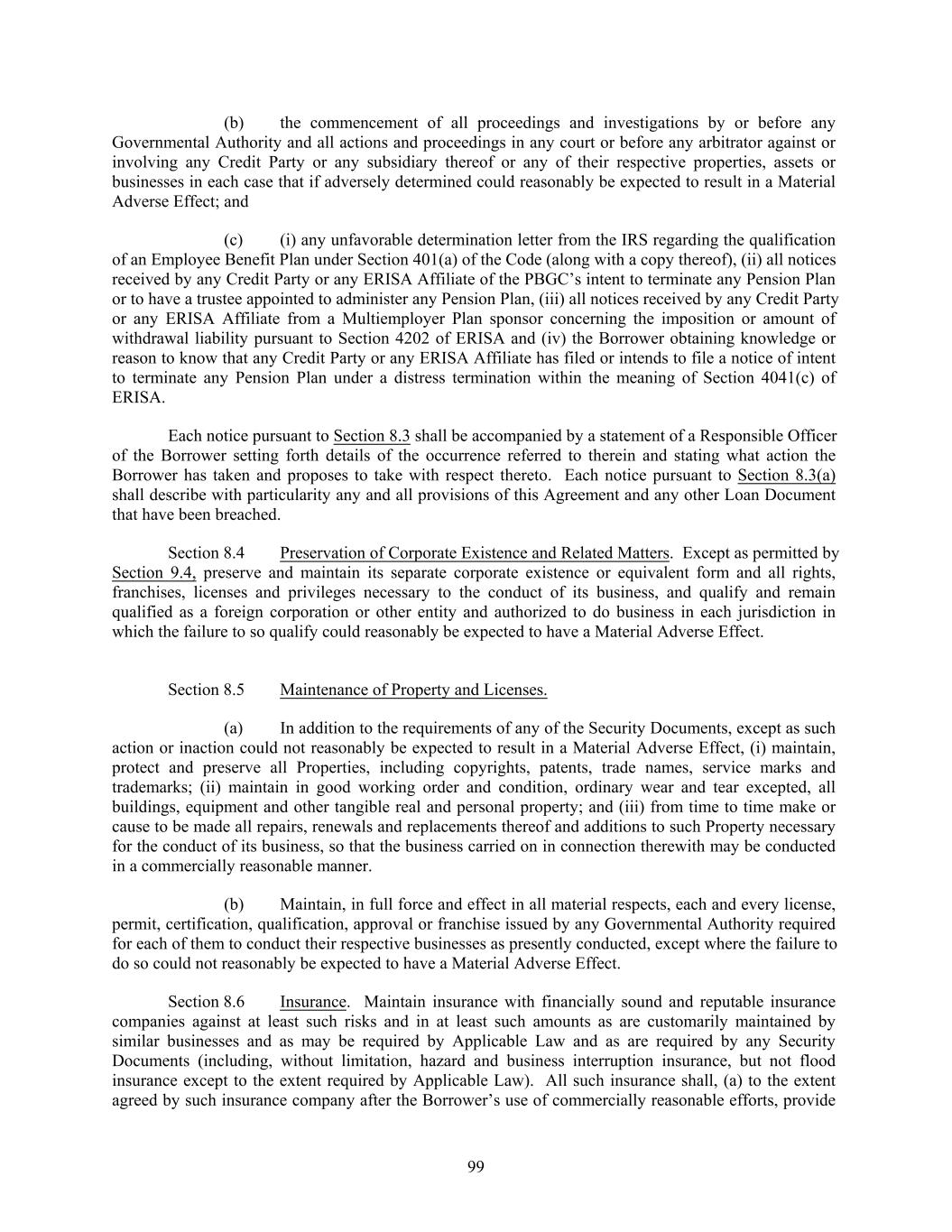 (b) the commencement of all proceedings and investigations by or before anyGovernmental Authority and all actions and proceedings in any court or before any arbitrator against orinvolving any Credit Party or any subsidiary thereof or any of their respective properties, assets orbusinesses in each case that if adversely determined could reasonably be expected to result in a MaterialAdverse Effect; and(c) (i) any unfavorable determination letter from the IRS regarding the qualificationof an Employee Benefit Plan under Section 401(a) of the Code (along with a copy thereof), (ii) all noticesreceived by any Credit Party or any ERISA Affiliate of the PBGC’s intent to terminate any Pension Planor to have a trustee appointed to administer any Pension Plan, (iii) all notices received by any Credit Partyor any ERISA Affiliate from a Multiemployer Plan sponsor concerning the imposition or amount ofwithdrawal liability pursuant to Section 4202 of ERISA and (iv) the Borrower obtaining knowledge orreason to know that any Credit Party or any ERISA Affiliate has filed or intends to file a notice of intentto terminate any Pension Plan under a distress termination within the meaning of Section 4041(c) ofERISA. Each notice pursuant to Section 8.3 shall be accompanied by a statement of a Responsible Officerof the Borrower setting forth details of the occurrence referred to therein and stating what action theBorrower has taken and proposes to take with respect thereto. Each notice pursuant to Section 8.3(a)shall describe with particularity any and all provisions of this Agreement and any other Loan Documentthat have been breached.Section 8.4 Preservation of Corporate Existence and Related Matters. Except as permitted bySection 9.4, preserve and maintain its separate corporate existence or equivalent form and all rights,franchises, licenses and privileges necessary to the conduct of its business, and qualify and remainqualified as a foreign corporation or other entity and authorized to do business in each jurisdiction inwhich the failure to so qualify could reasonably be expected to have a Material Adverse Effect.Section 8.5 Maintenance of Property and Licenses.(a) In addition to the requirements of any of the Security Documents, except as suchaction or inaction could not reasonably be expected to result in a Material Adverse Effect, (i) maintain,protect and preserve all Properties, including copyrights, patents, trade names, service marks andtrademarks; (ii) maintain in good working order and condition, ordinary wear and tear excepted, allbuildings, equipment and other tangible real and personal property; and (iii) from time to time make orcause to be made all repairs, renewals and replacements thereof and additions to such Property necessaryfor the conduct of its business, so that the business carried on in connection therewith may be conductedin a commercially reasonable manner.(b) Maintain, in full force and effect in all material respects, each and every license,permit, certification, qualification, approval or franchise issued by any Governmental Authority requiredfor each of them to conduct their respective businesses as presently conducted, except where the failure todo so could not reasonably be expected to have a Material Adverse Effect.Section 8.6 Insurance. Maintain insurance with financially sound and reputable insurancecompanies against at least such risks and in at least such amounts as are customarily maintained bysimilar businesses and as may be required by Applicable Law and as are required by any SecurityDocuments (including, without limitation, hazard and business interruption insurance, but not floodinsurance except to the extent required by Applicable Law). All such insurance shall, (a) to the extentagreed by such insurance company after the Borrower’s use of commercially reasonable efforts, provide99